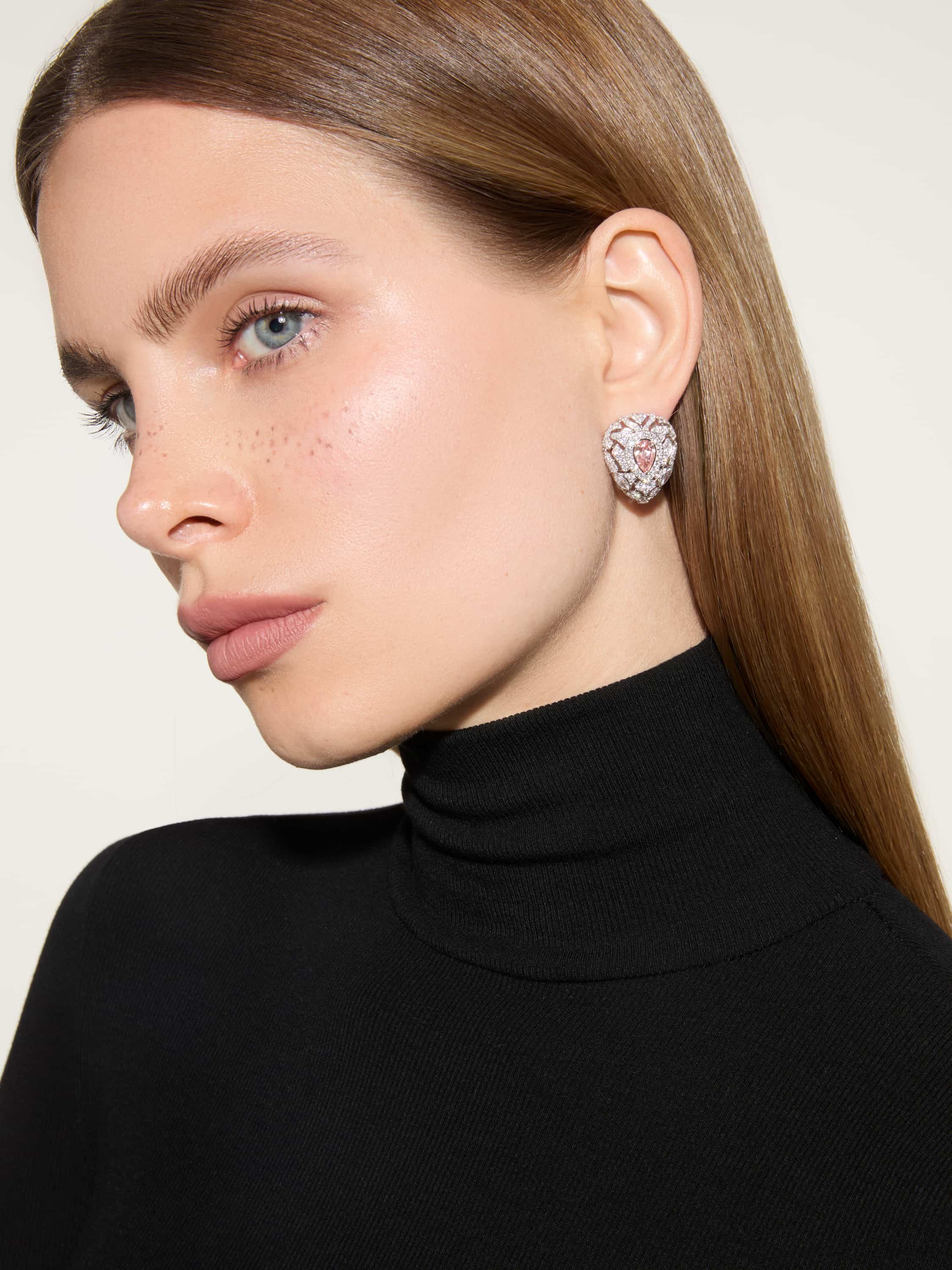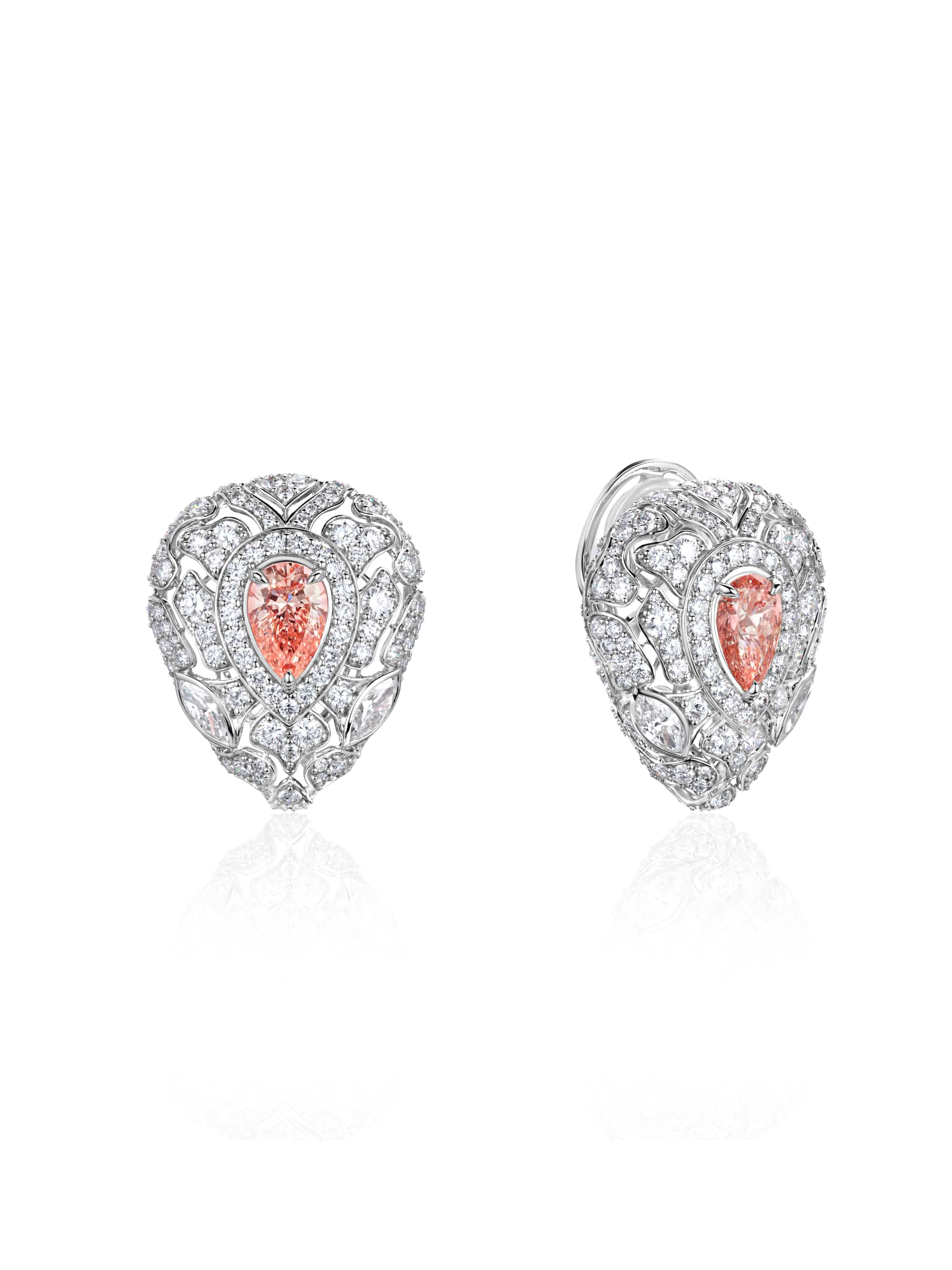 Transformable earrings with a detachable tassel in white gold with a pink pear-cut diamond 2.00 ct FVP/VS1, 4 marquise-cut diamonds 0.81 ct F/VVS2, and 522 round diamonds 15.33 ct H/SI1. Length: 6 cm.