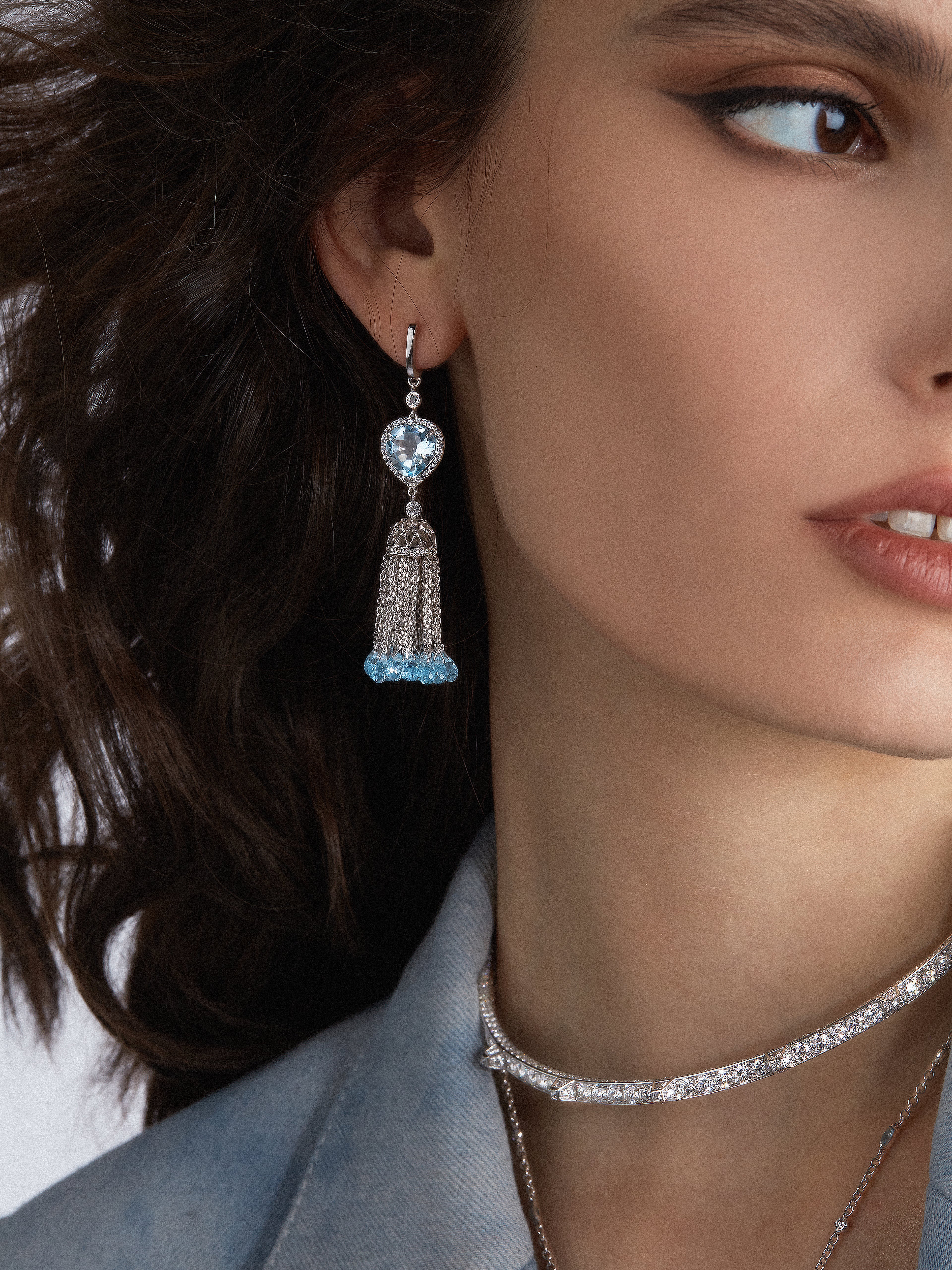 Tassel earrings in white gold, set with 50 Sky Blue topaz briolettes with a total weight of 18.47 ct, 2 Sky Blue heart-cut topazes with a total weight of 8.70 ct and 114 round Sky Blue topazes 0.76 ct. Length – 6 cm.