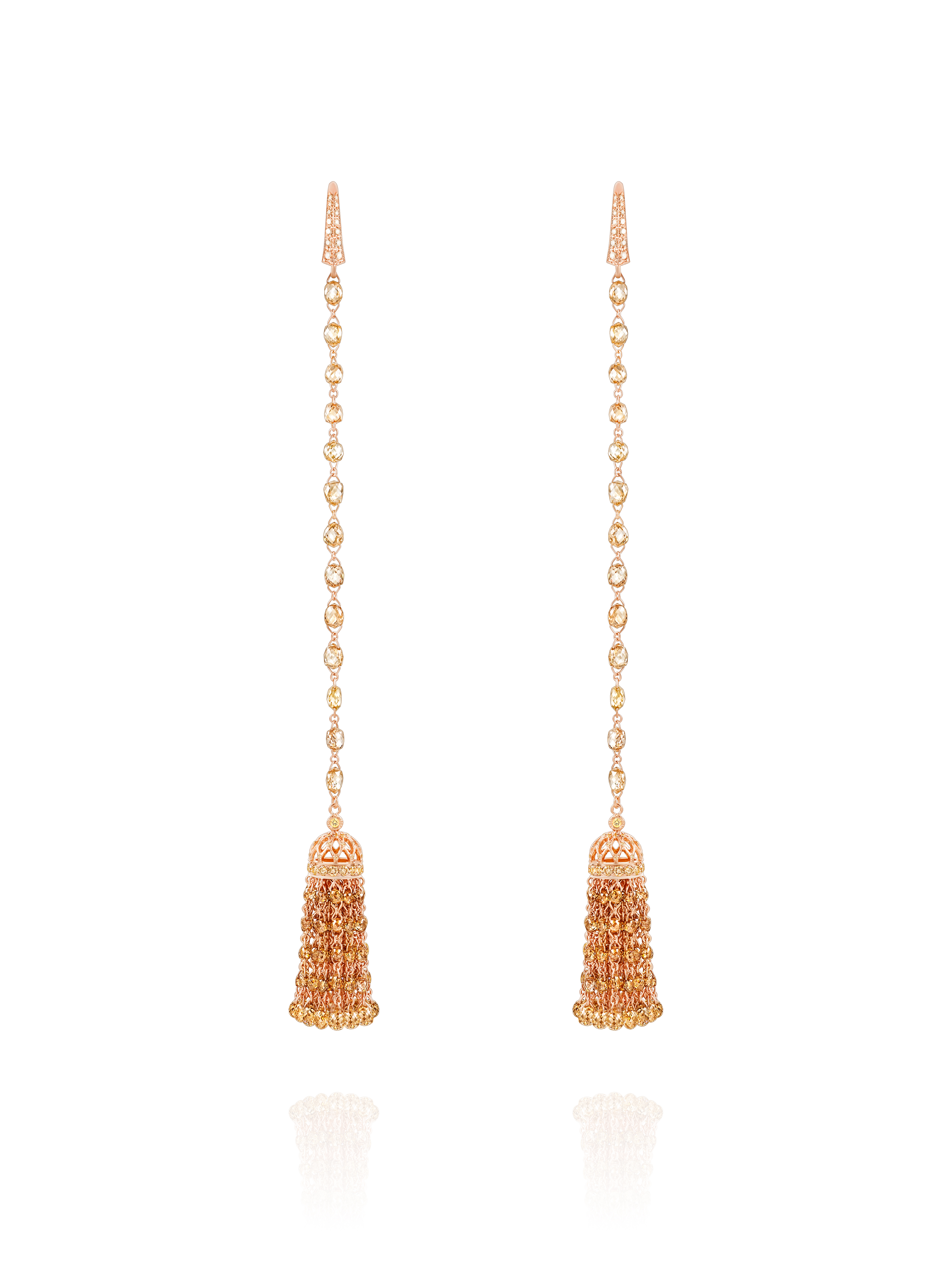 Tassel earrings in rose gold, set with 272 brown briolettes with a total weight of 25.84 ct and 116 round brown diamonds with a total weight of 0.89 ct. Item length: 12 cm.