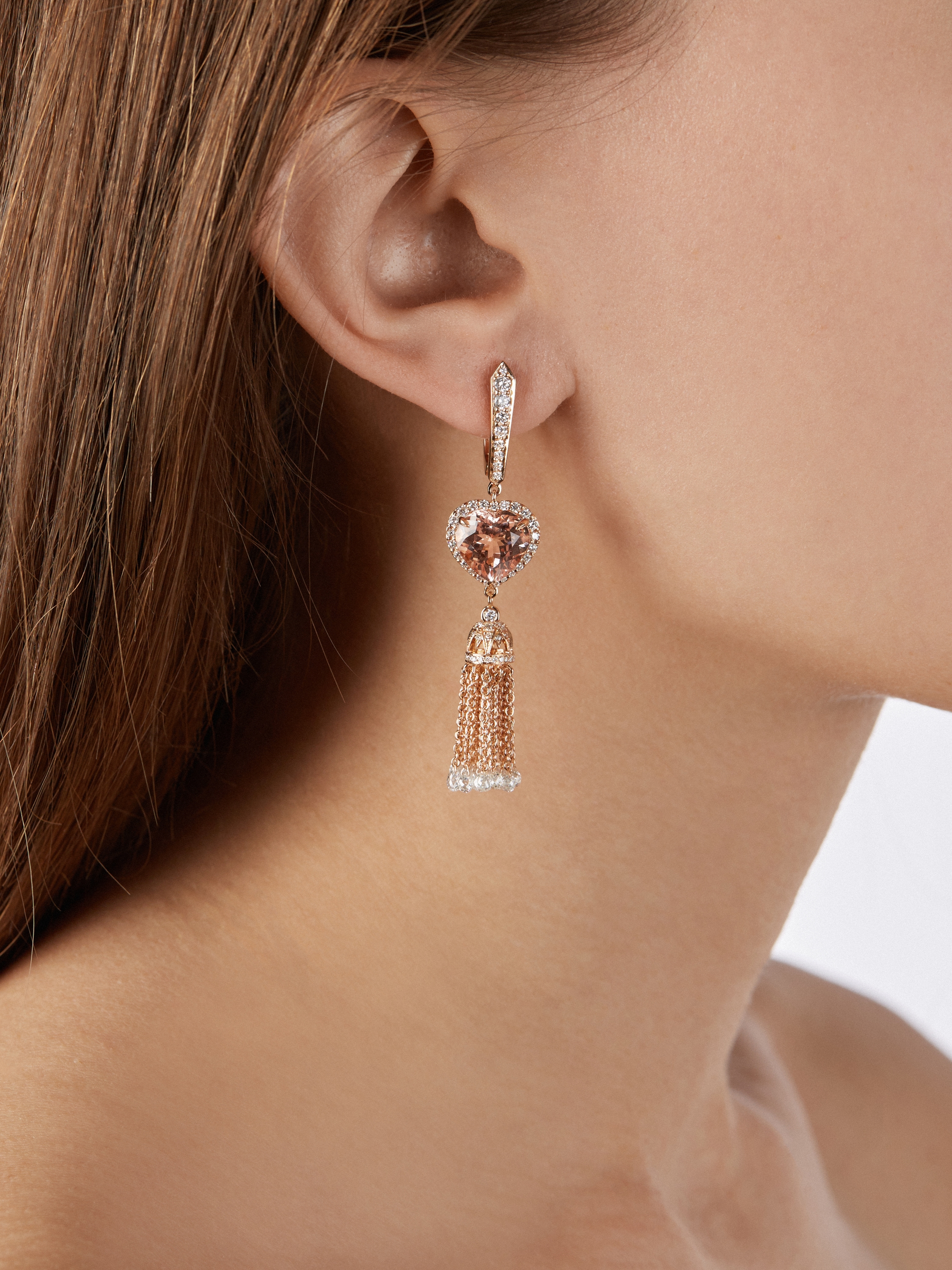 Tassel earrings in rose gold with 2 heart-cut morganites with a total weight of 7.07 ct, 42 briolette-cut diamonds with a total weight of 3.88 ct, and 146 round-cut diamonds with a total weight of 1.18 ct. Item length: 6 cm.