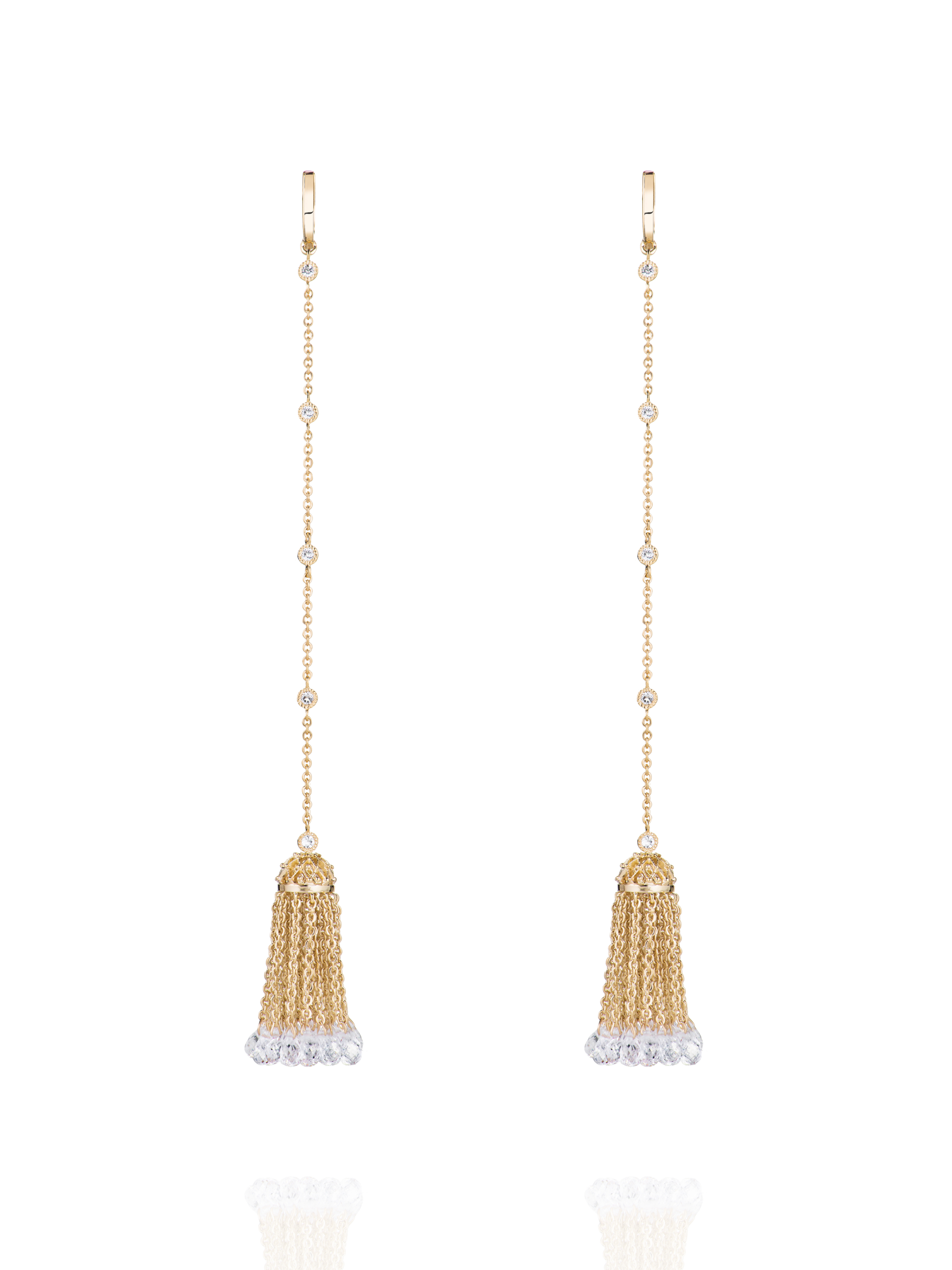 Tassel earrings in yellow gold with 10 colorless topazes with a total weight of 0.4 ct and 50 briolettes of rock crystal with a total weight of 14.93 ct. Item length – 12 cm.