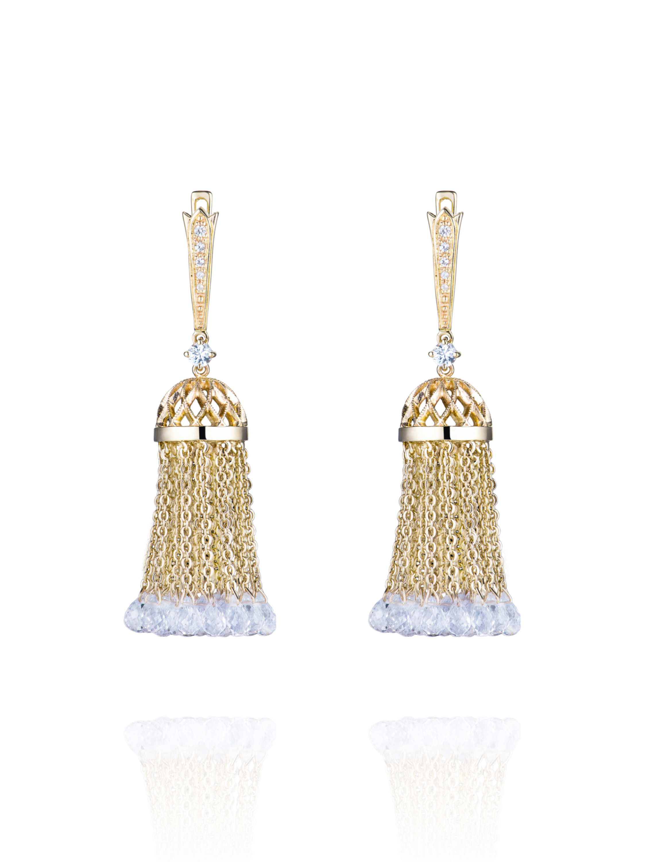 Tassel earrings in yellow gold, set with 66 colorless briolette-cut topazes with a total weight of 27.31 ct, 2 round-cut topazes with a total weight of 0.26 ct, and 10 round-cut sapphires with a total weight of 0.08 ct. Item length: 5 cm.