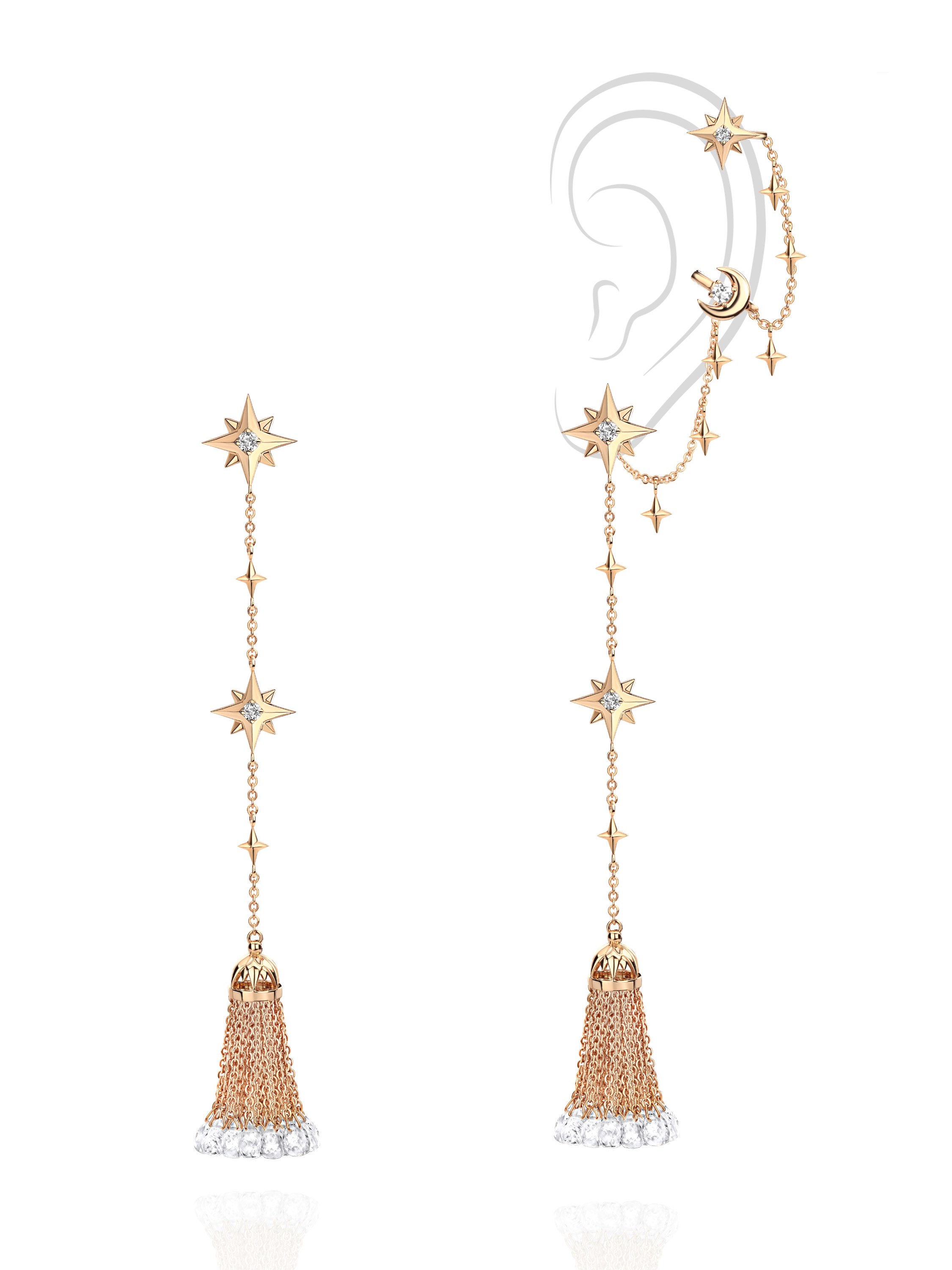 Pink gold tassel earrings with ear cuff with 42 briolettes of rock crystal weighing 12.1 and 8 colorless round-cut topazes weighing 0.73 ct. Item length: 10 cm.