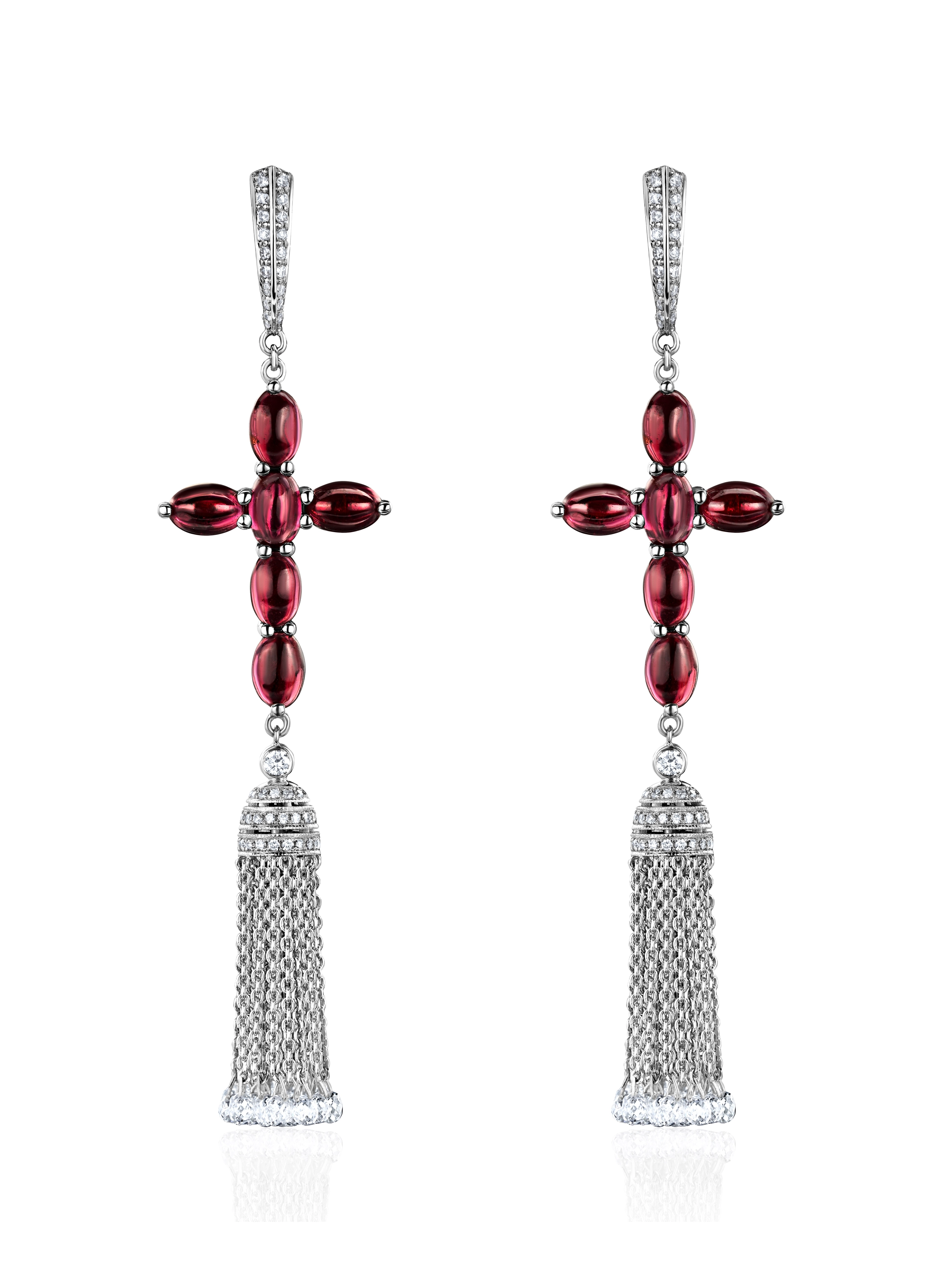 Tassel earrings with crosses made of white gold and set with 12 cabochon-cut garnets with a total weight of 6.51 ct, 13 briolette-cut diamonds with a total weight of 2.69 ct, and 136 round-cut diamonds with a total weight of 0.59 ct. Earring length — 7 cm.