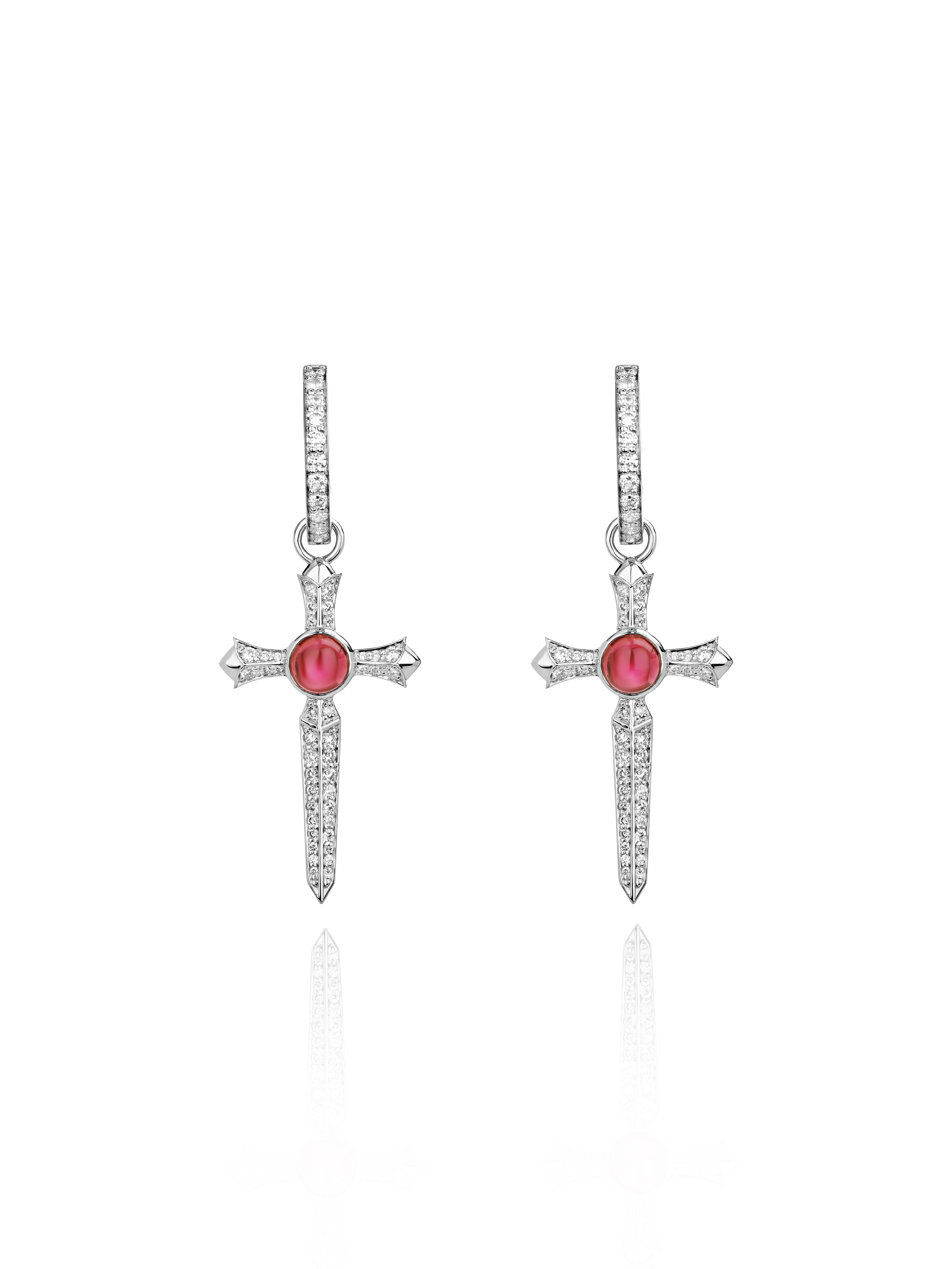 Cross-shaped earrings in white gold with 2 cabochon garnets and 102 round-cut diamonds with a total weight of 0.87 ct. Item length: 4 cm.