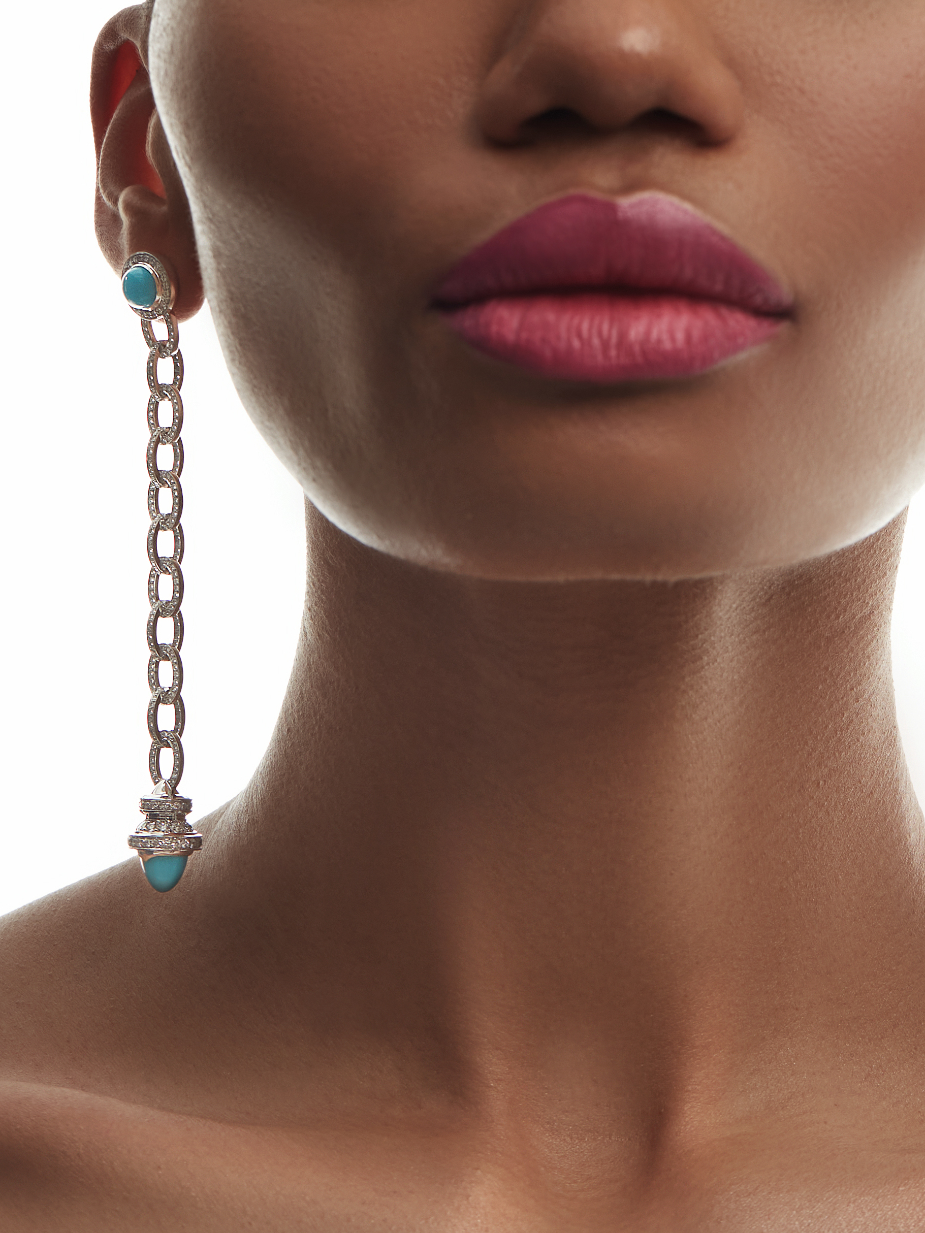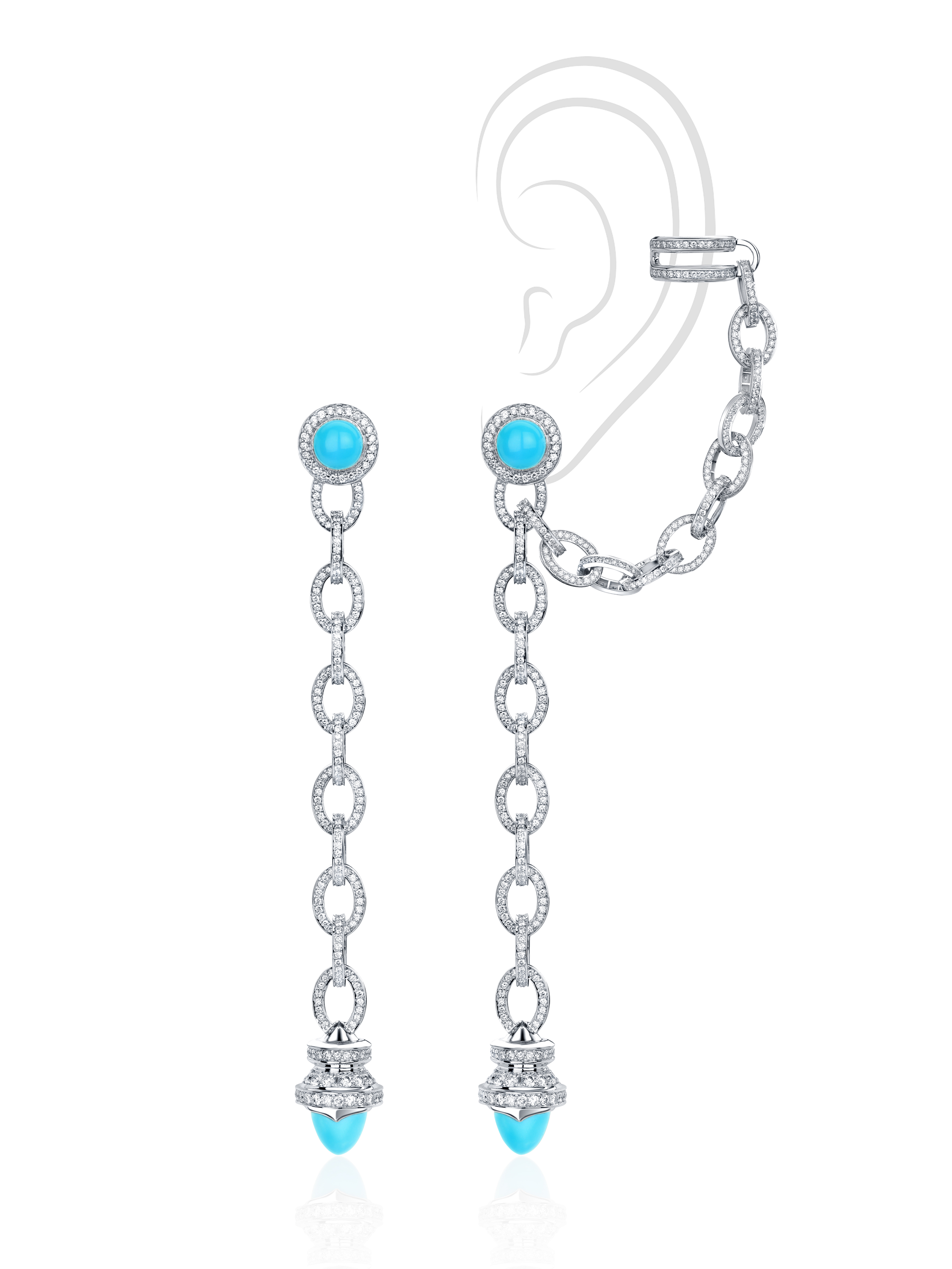 Earrings with an ear cuff made of white gold, encrusted with 2 turquoise cabochons with a total weight of 0.55 g, 2 turquoise beads with a total weight of 1.06 g, and 866 round-cut diamonds with a total weight of 5.90 ct. Length of the piece: 10 cm.
