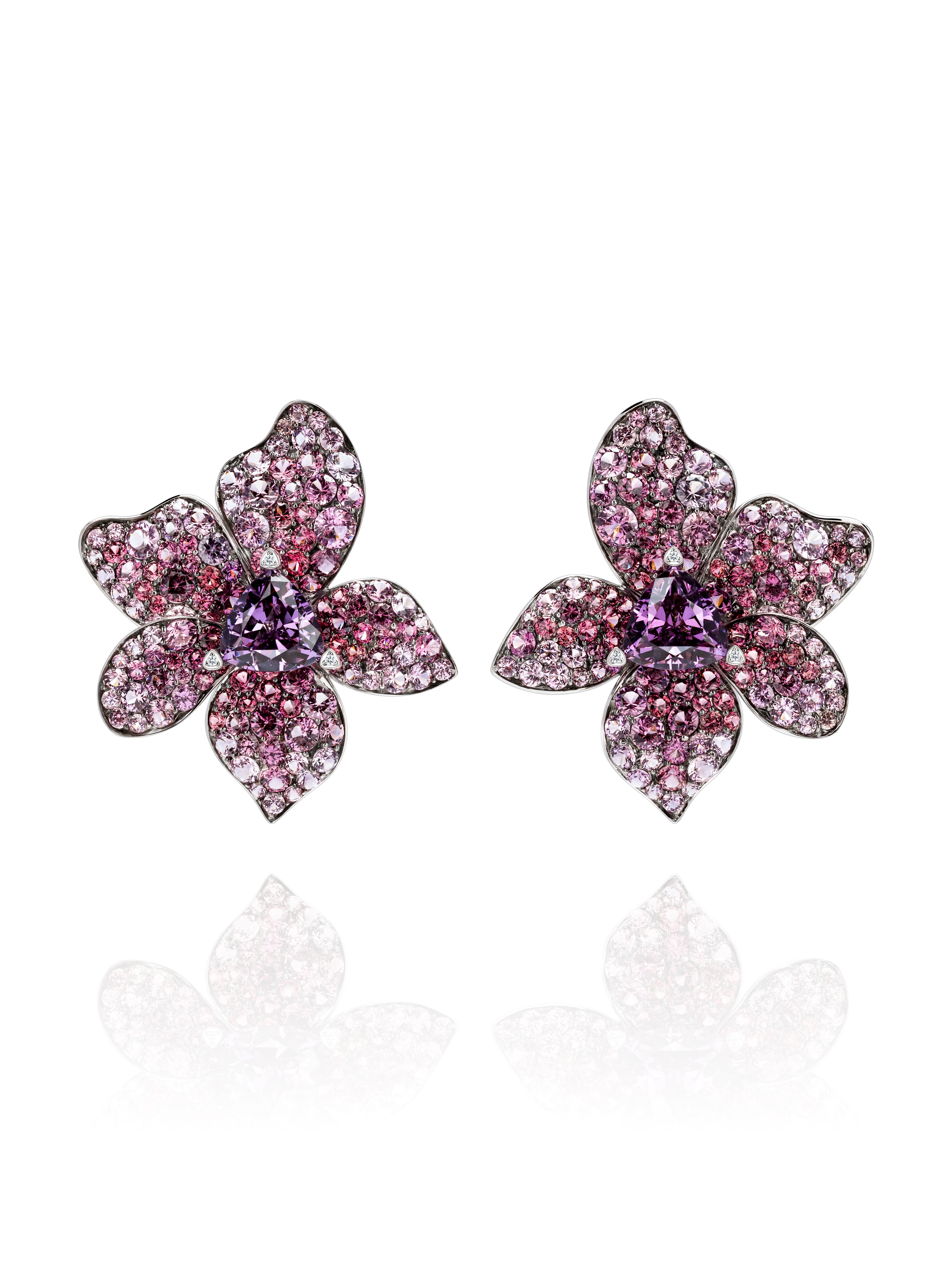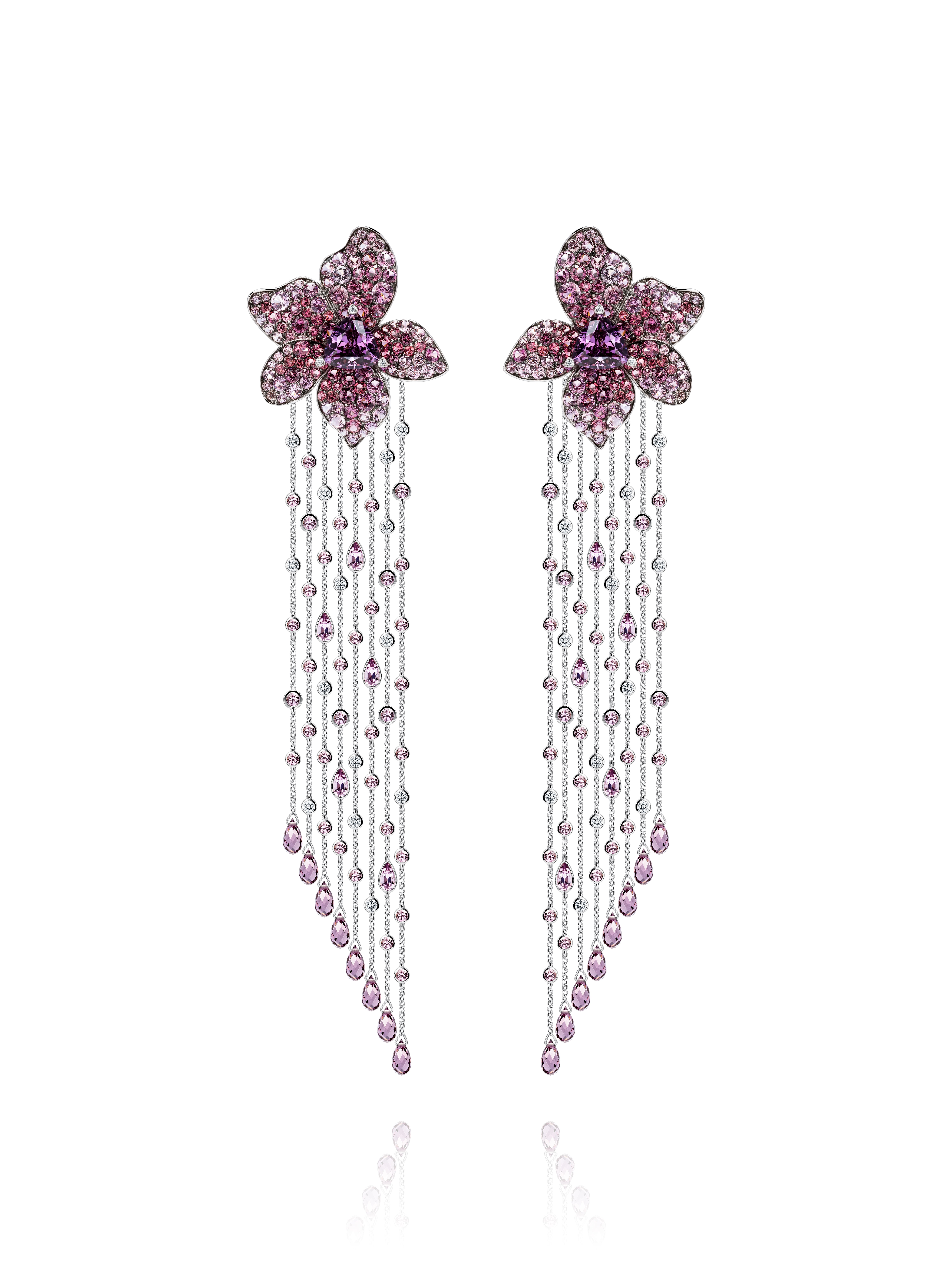Transformer earrings made of palladium gold, encrusted with 380 spinels with a total weight of 15.74 ct, 16 briolette-cut spinels with a total weight of 4.43 ct, and 34 gray round-cut diamonds with a total weight of 0.56 ct. Item length: 12 cm.