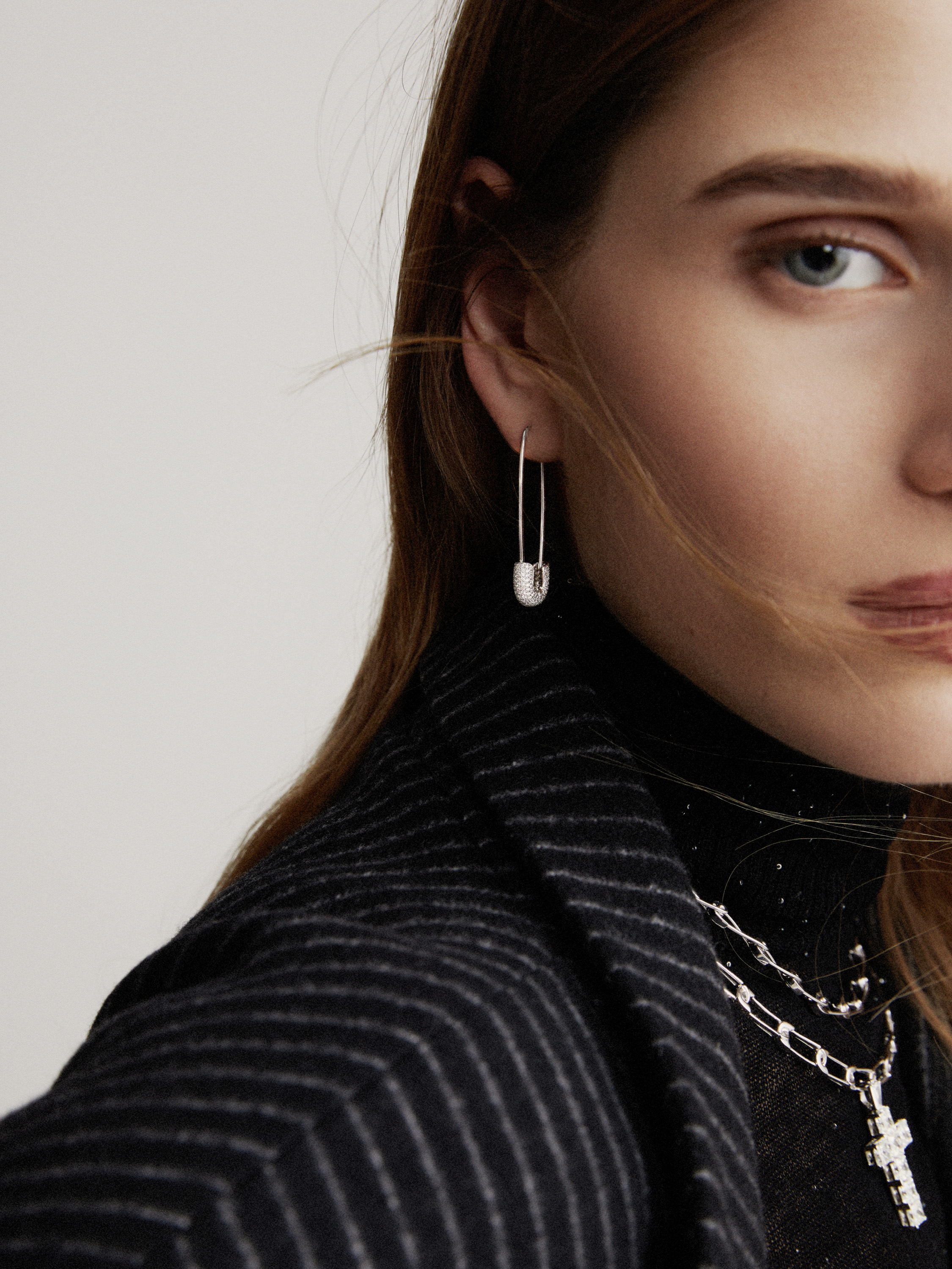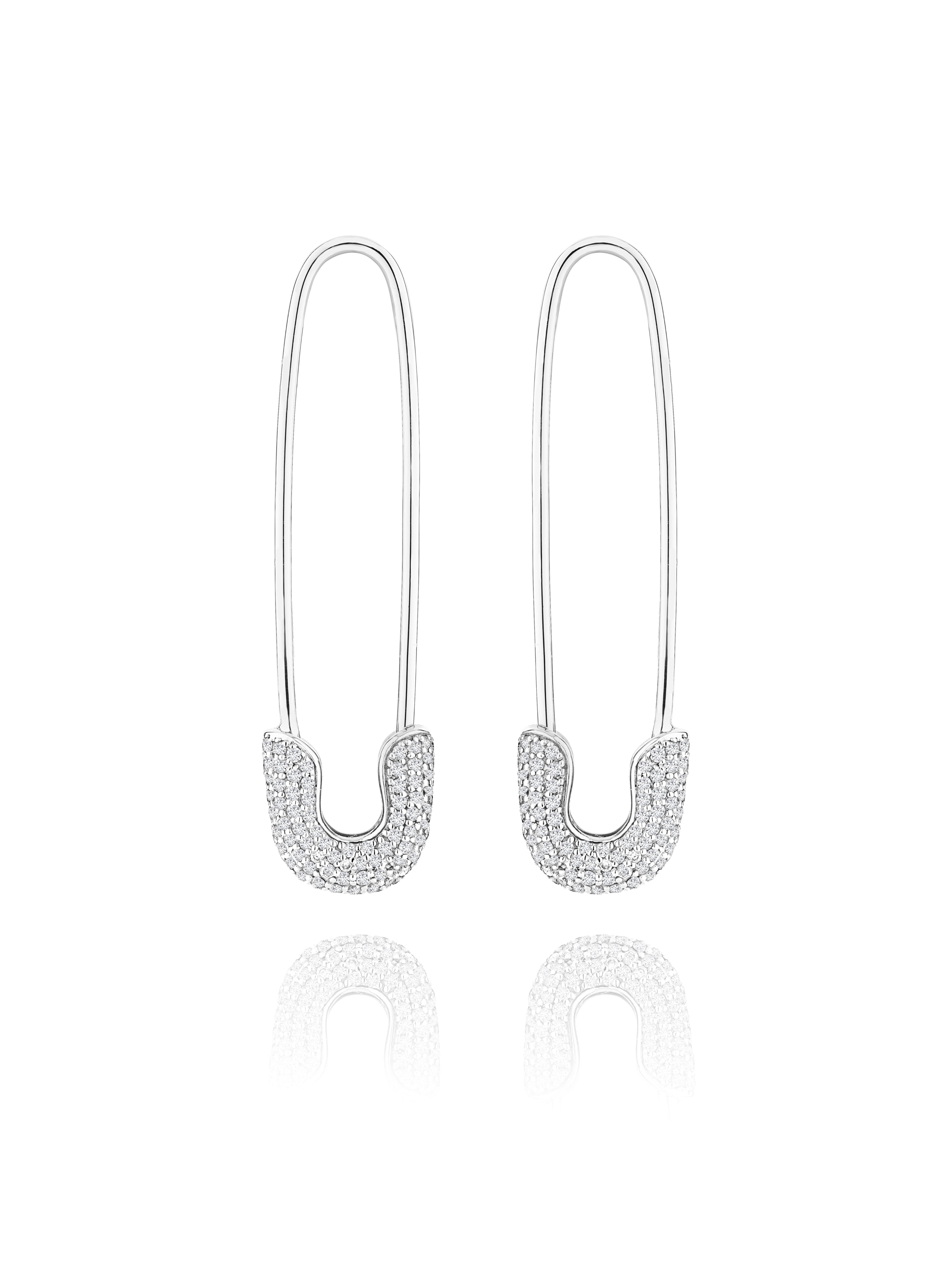 Safety pin-shaped earrings in white gold with 320 round-cut diamonds with a total weight of 0.92 ct. Item length: 4 cm.