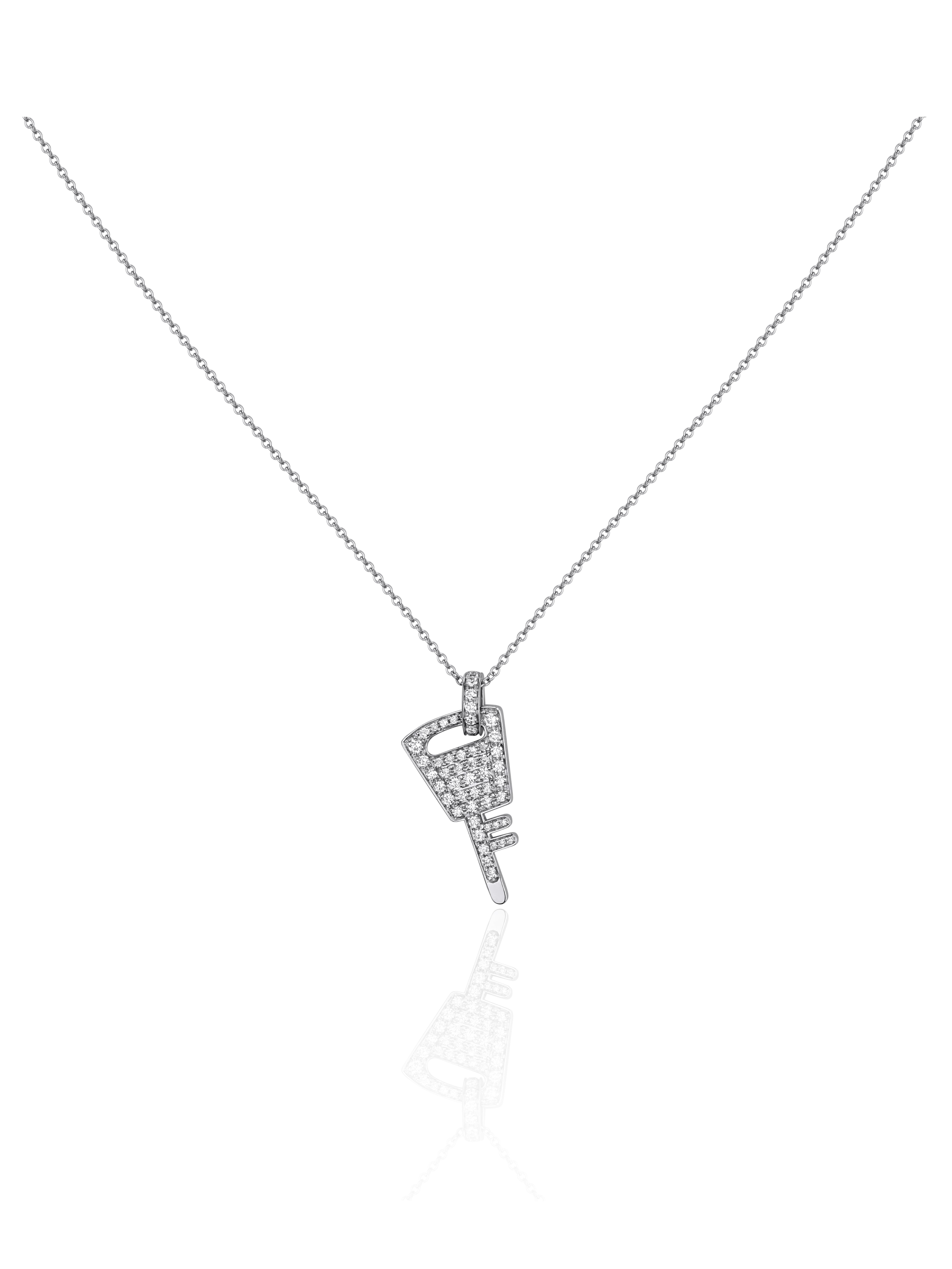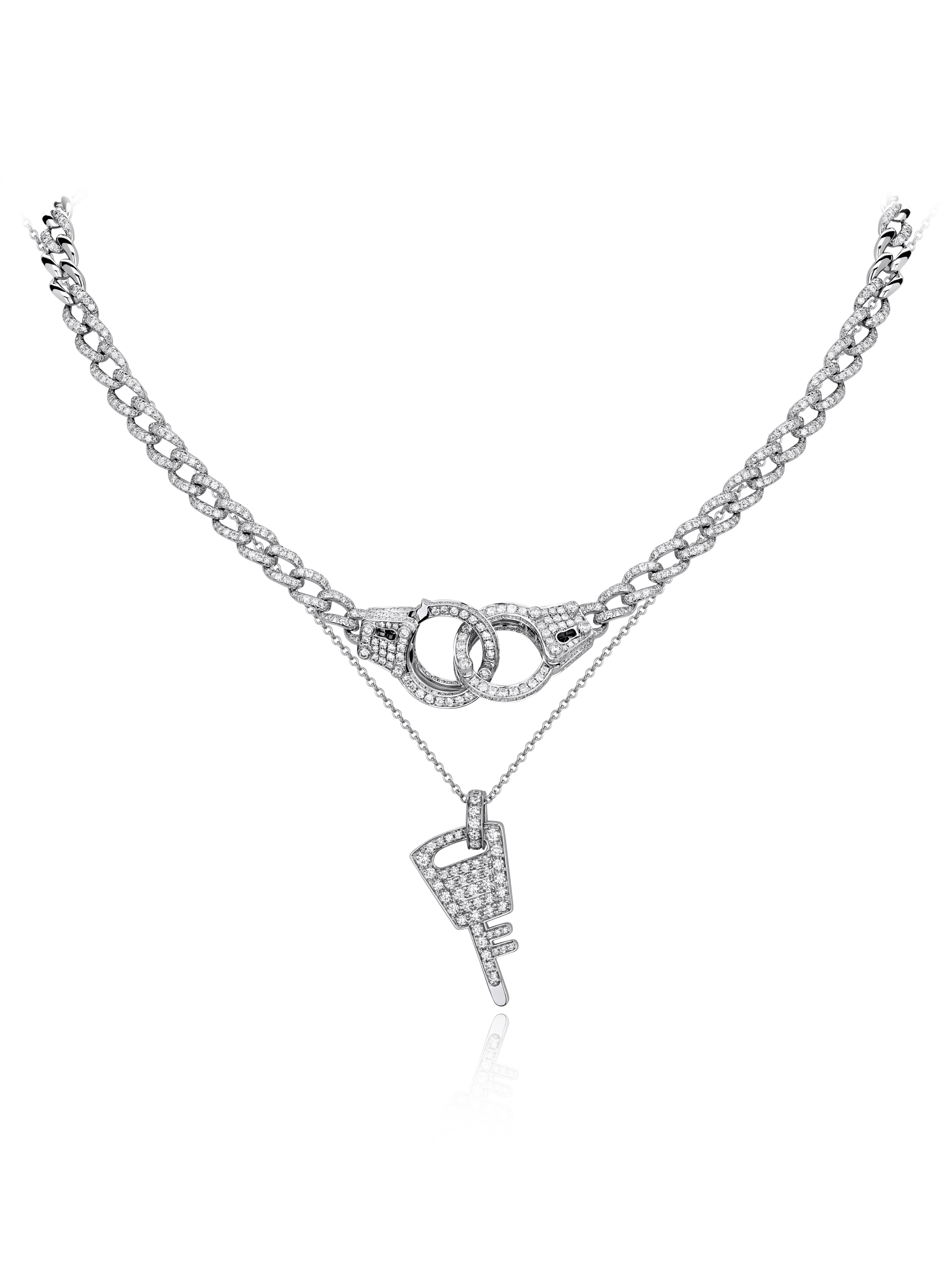 Necklace set in the shape of handcuffs and a key. The handcuffs are crafted in white gold with 966 round diamonds with a total weight of 7.55 ct. The key is crafted in white gold with 58 round diamonds with a total weight of 0.83 ct.