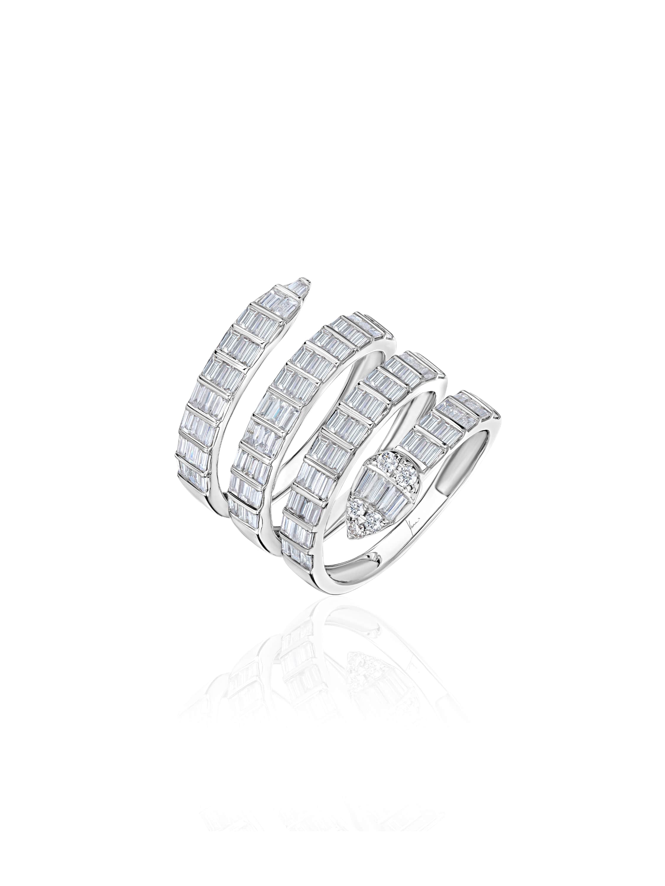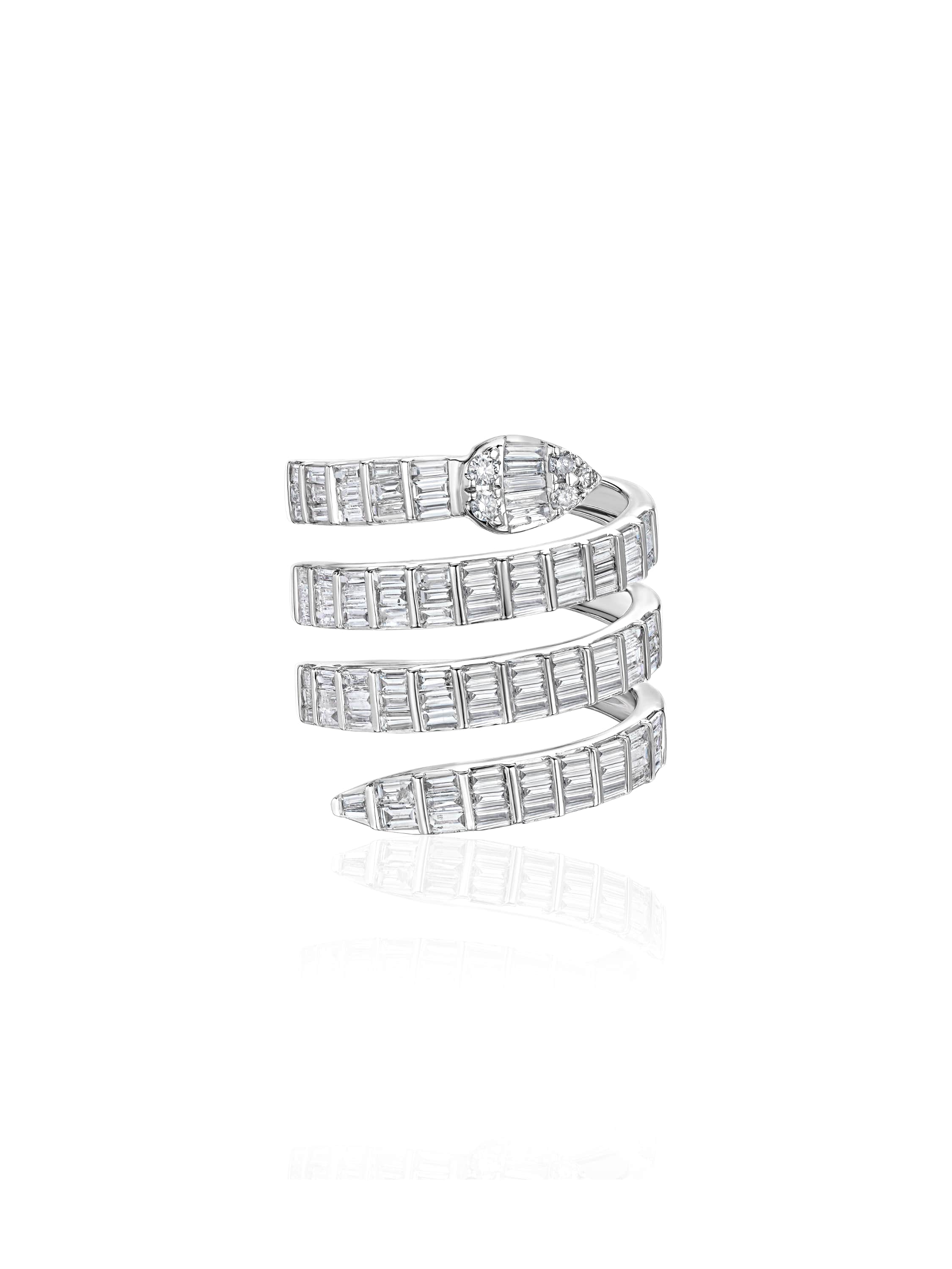 Wide white gold snake ring with 115 baguette-cut diamonds weighing 1.91 ct.