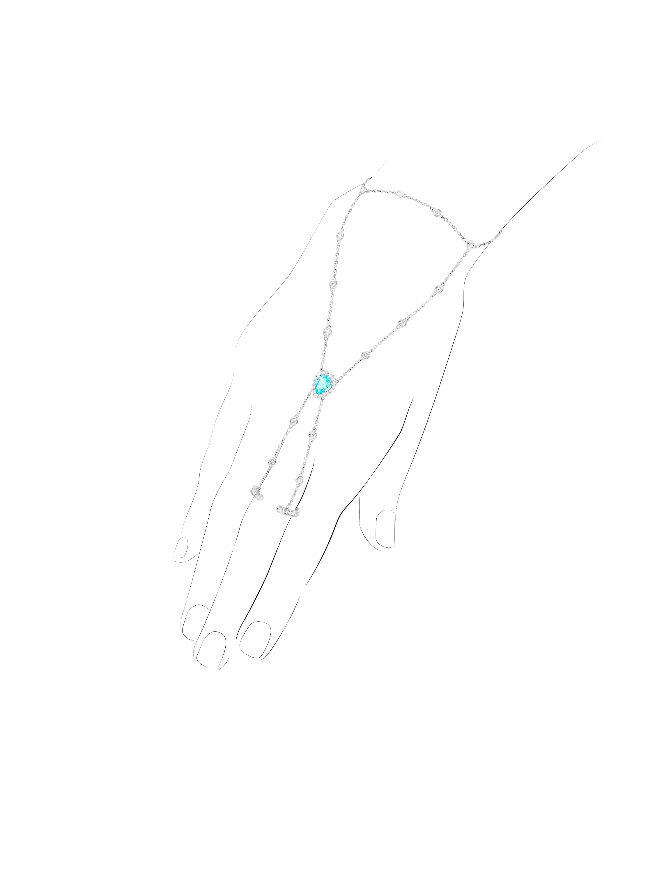 White gold slave bracelet with a Paraiba tourmaline in a pear cut weighing 0.45 ct and 78 round diamonds weighing 1.19 ct.