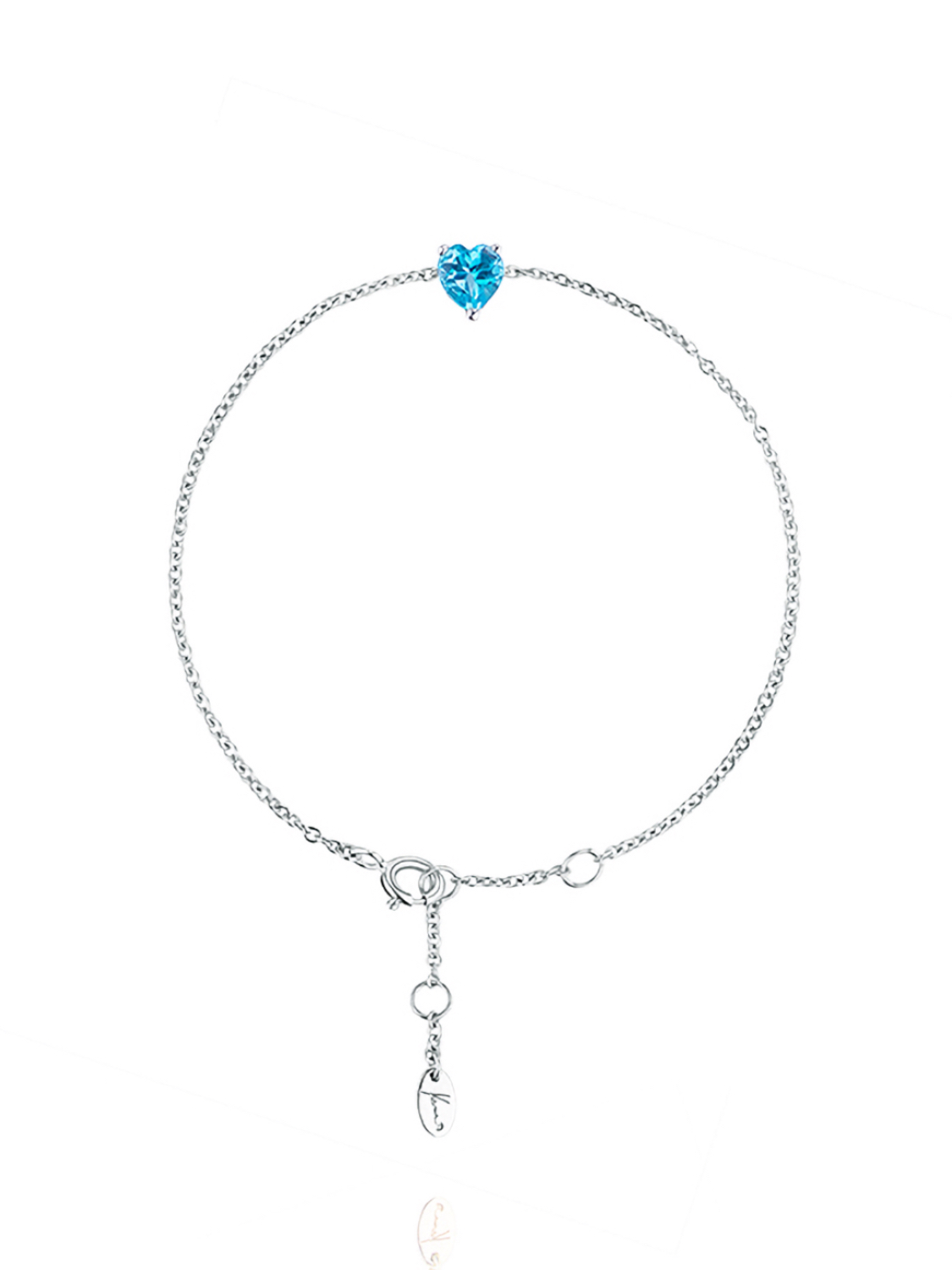 A delicate chain bracelet is made of 585 white gold and complemented with a Swiss Blue topaz in a Heart cut weighing 0.57 ct.