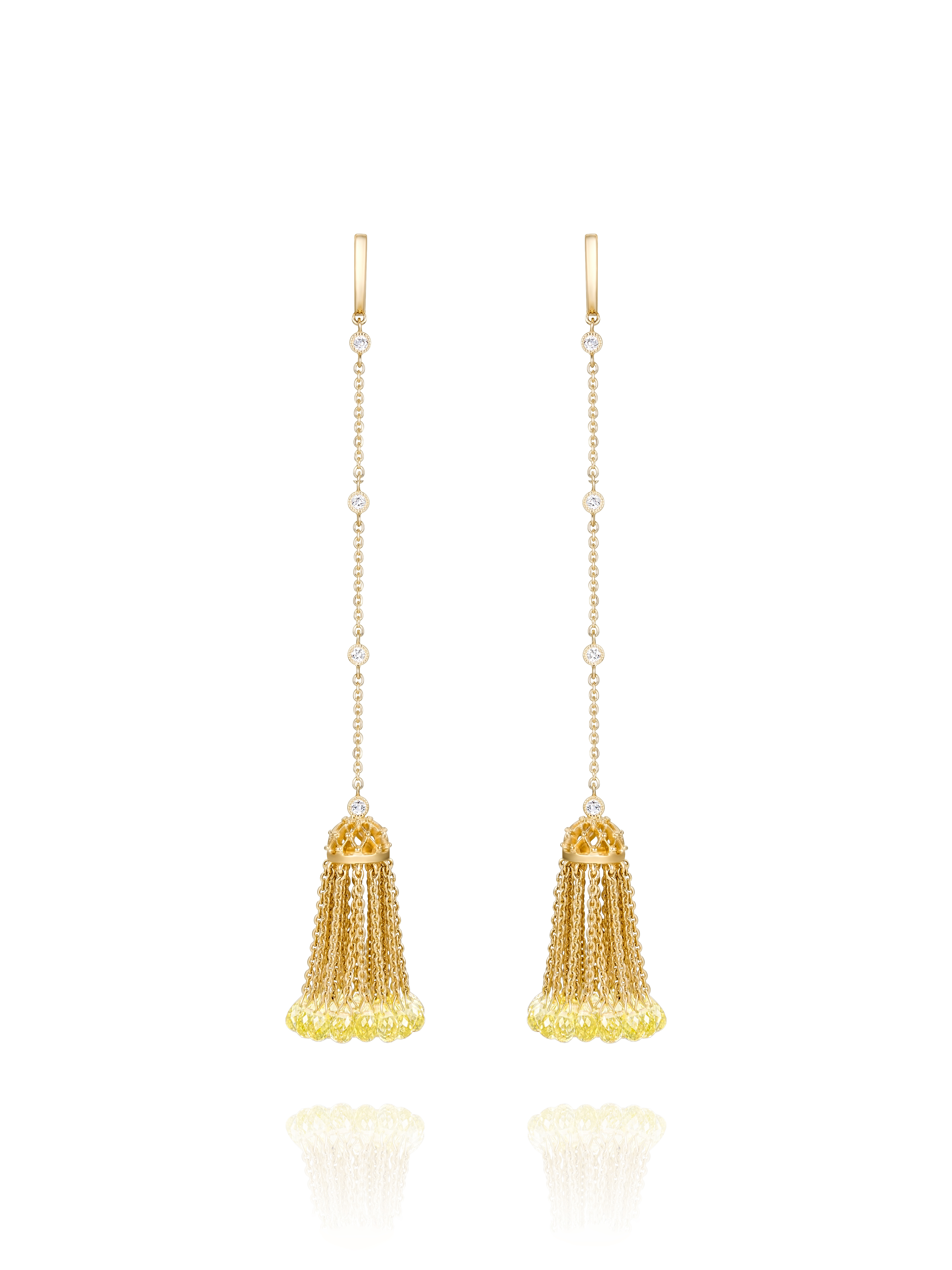 Short tassel earrings in yellow gold with 50 briolette-cut lemon quartzes with a total weight of 14.69 ct and 8 colorless topazes with a total weight of 0.33 ct. Item length – 10 cm.