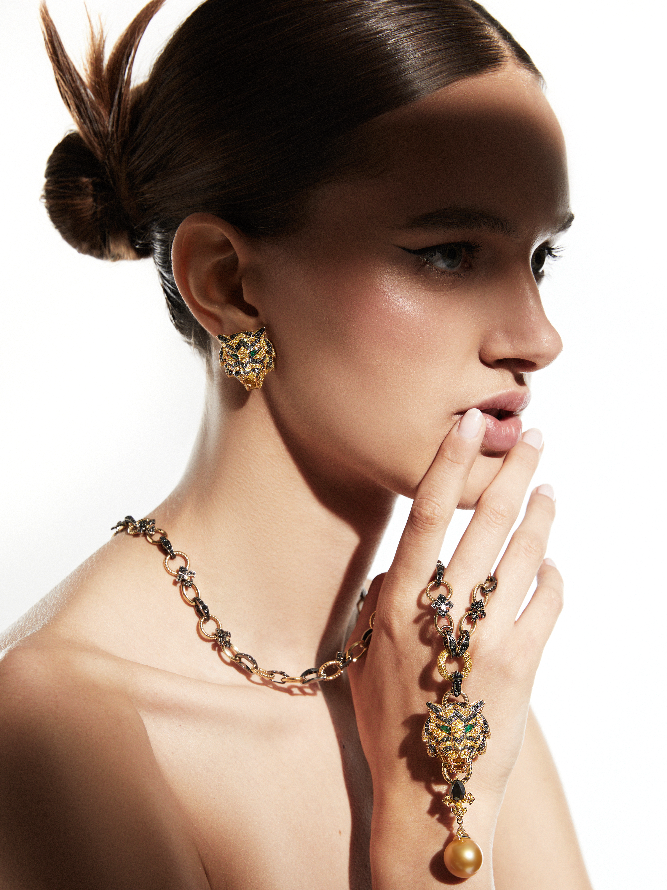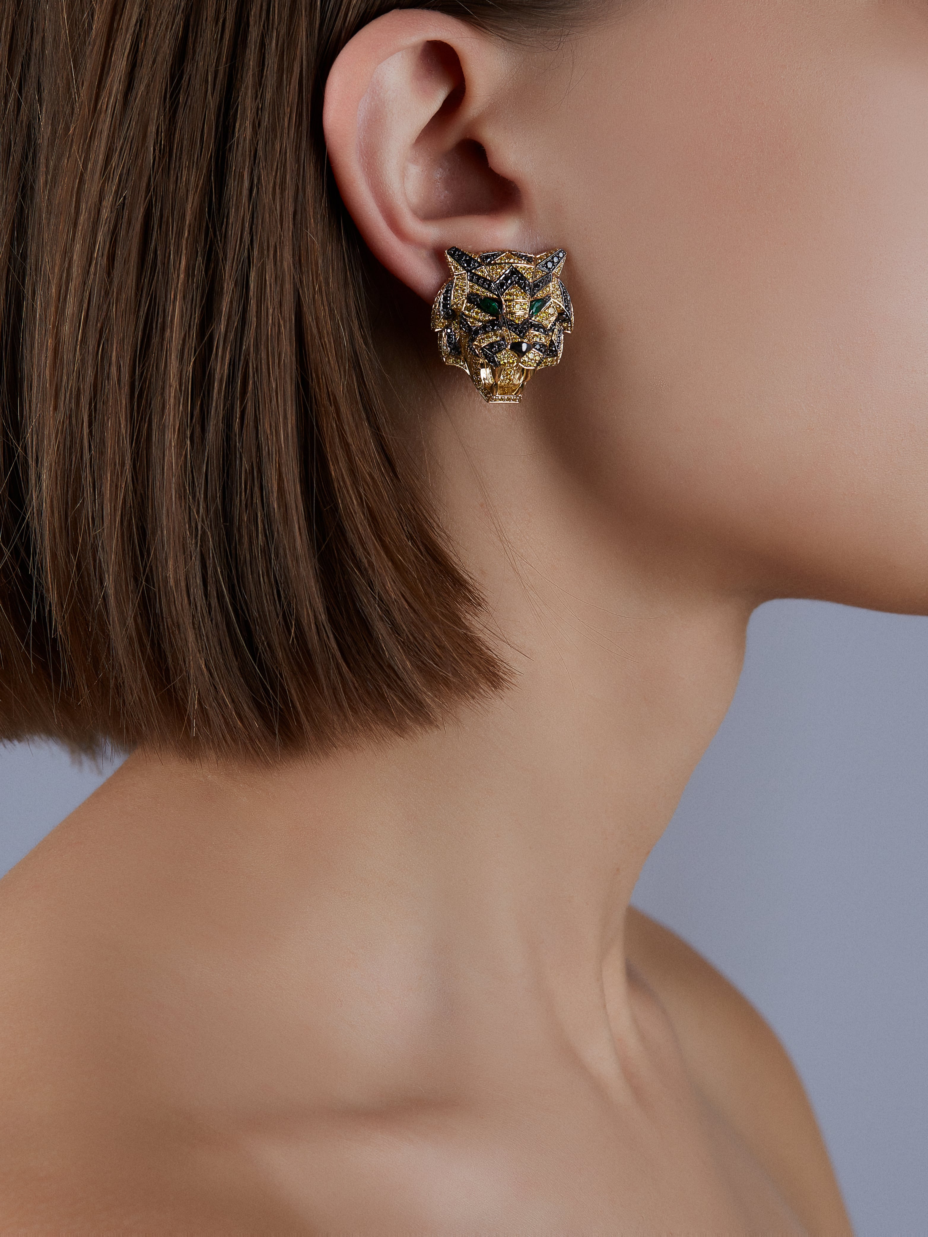 Gold stud earrings in the shape of tigers, inlaid with 152 round-cut black diamonds with a total weight of 0.98 ct, 410 round-cut yellow diamonds with a total weight of 2.42 ct and 4 marquise-cut emeralds with a total weight of 0.32 ct.