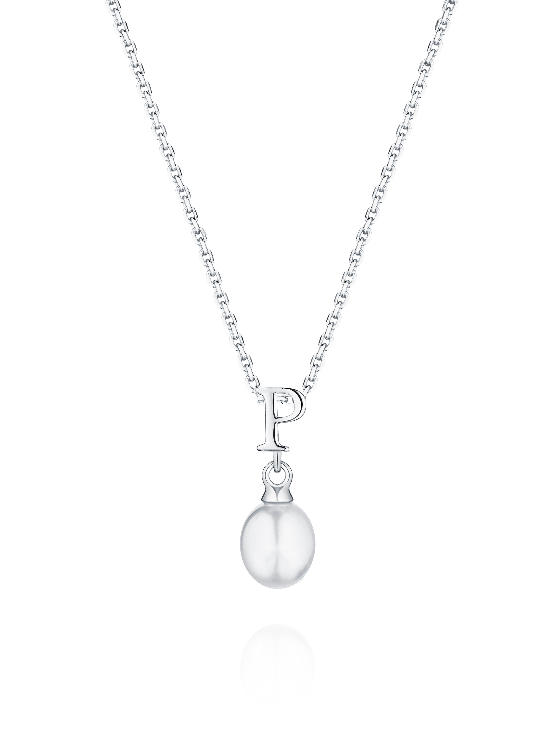 Silver necklace with a pendant with the letter P and a pearl