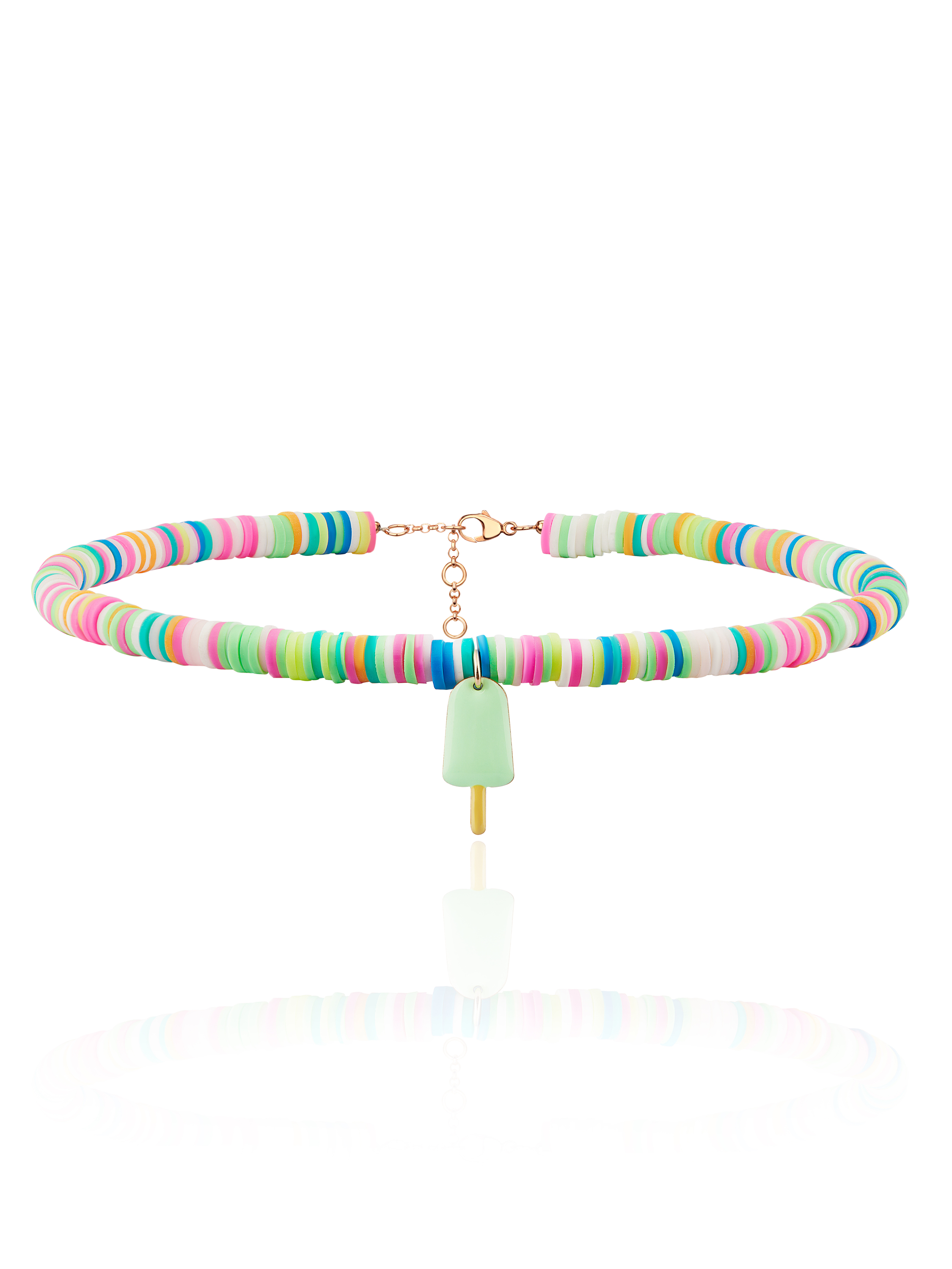 Children's choker necklace made of 925 sterling silver with gold plating and multicolored rubber with an ice cream bar pendant in mint enamel.