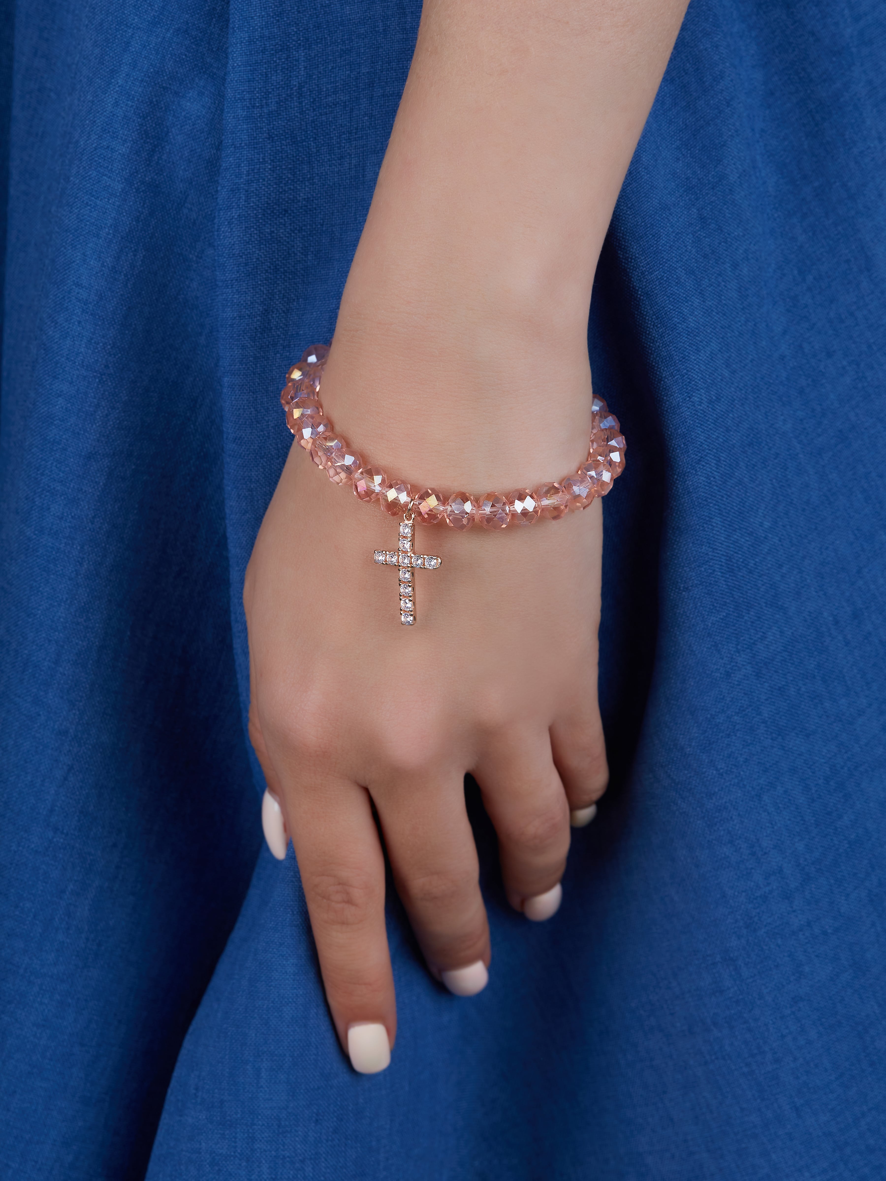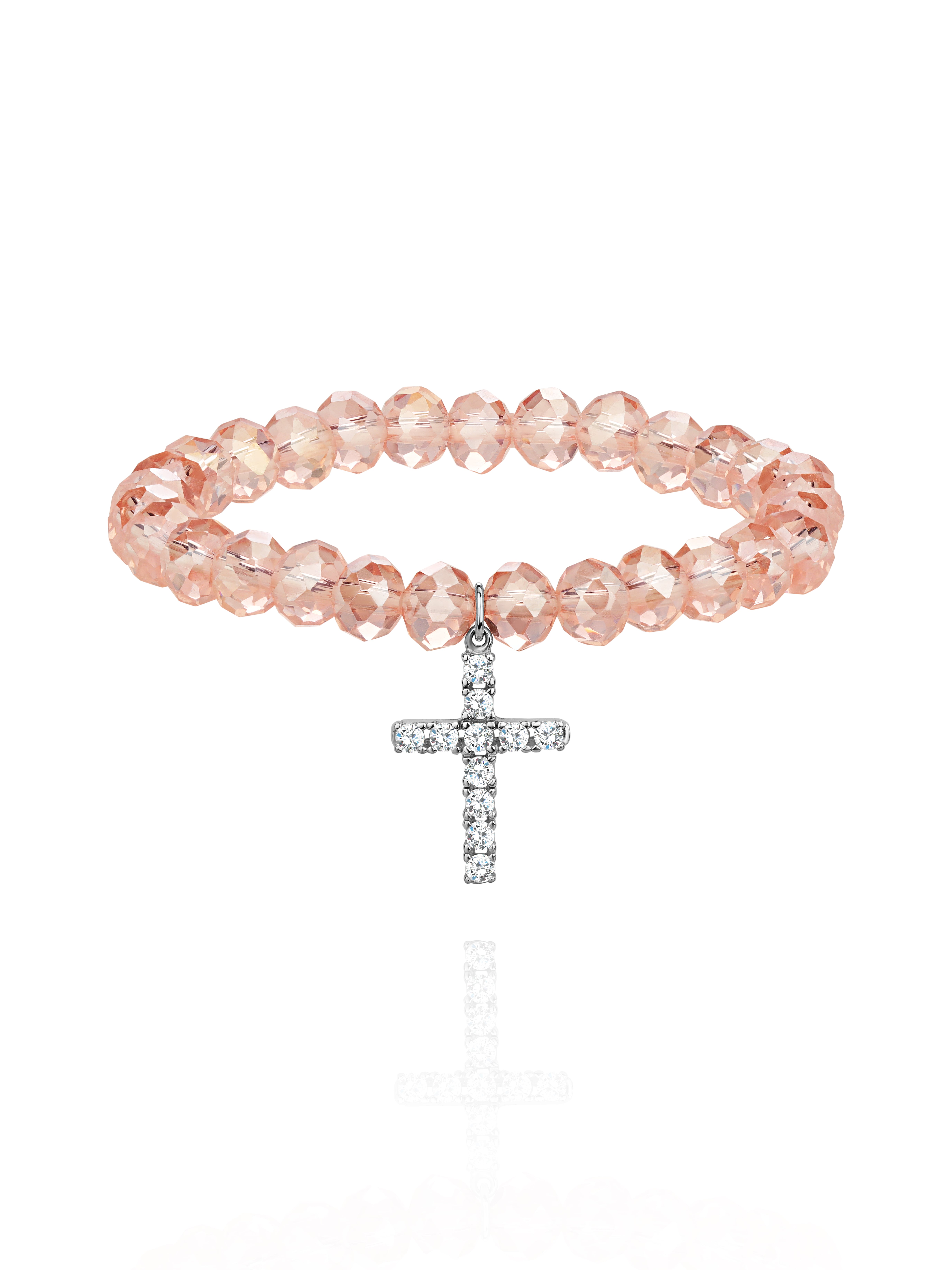 Bracelet made of 29 quartz beads with a cross-shaped pendant in 925 sterling silver and 11 round-cut cubic zirconia stones.