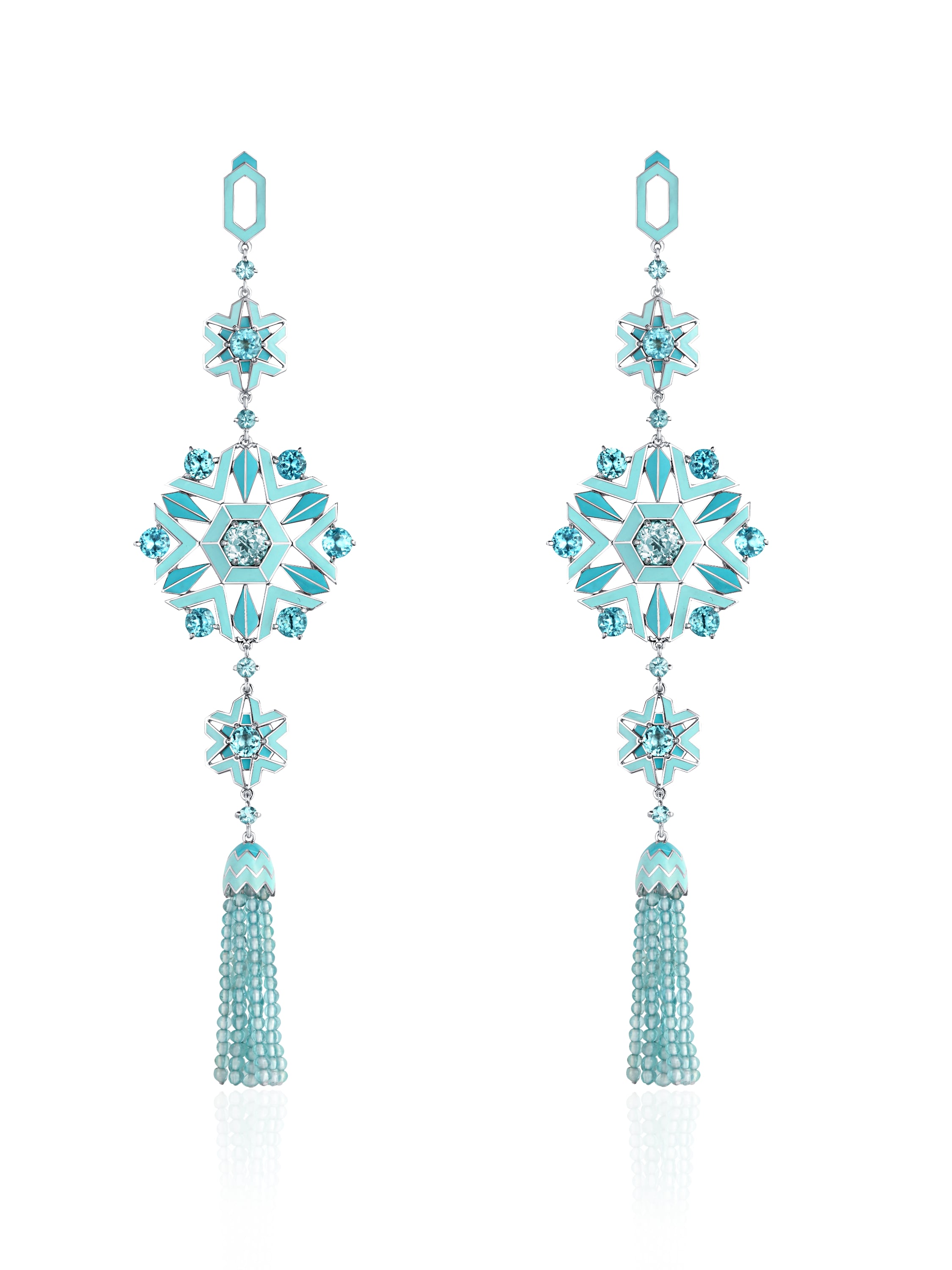 Long silver earrings with turquoise enamel, 240 apatite beads weighing 19.20 ct and 26 round-cut apatites weighing 11.91 ct. Product length: 14.5 cm.