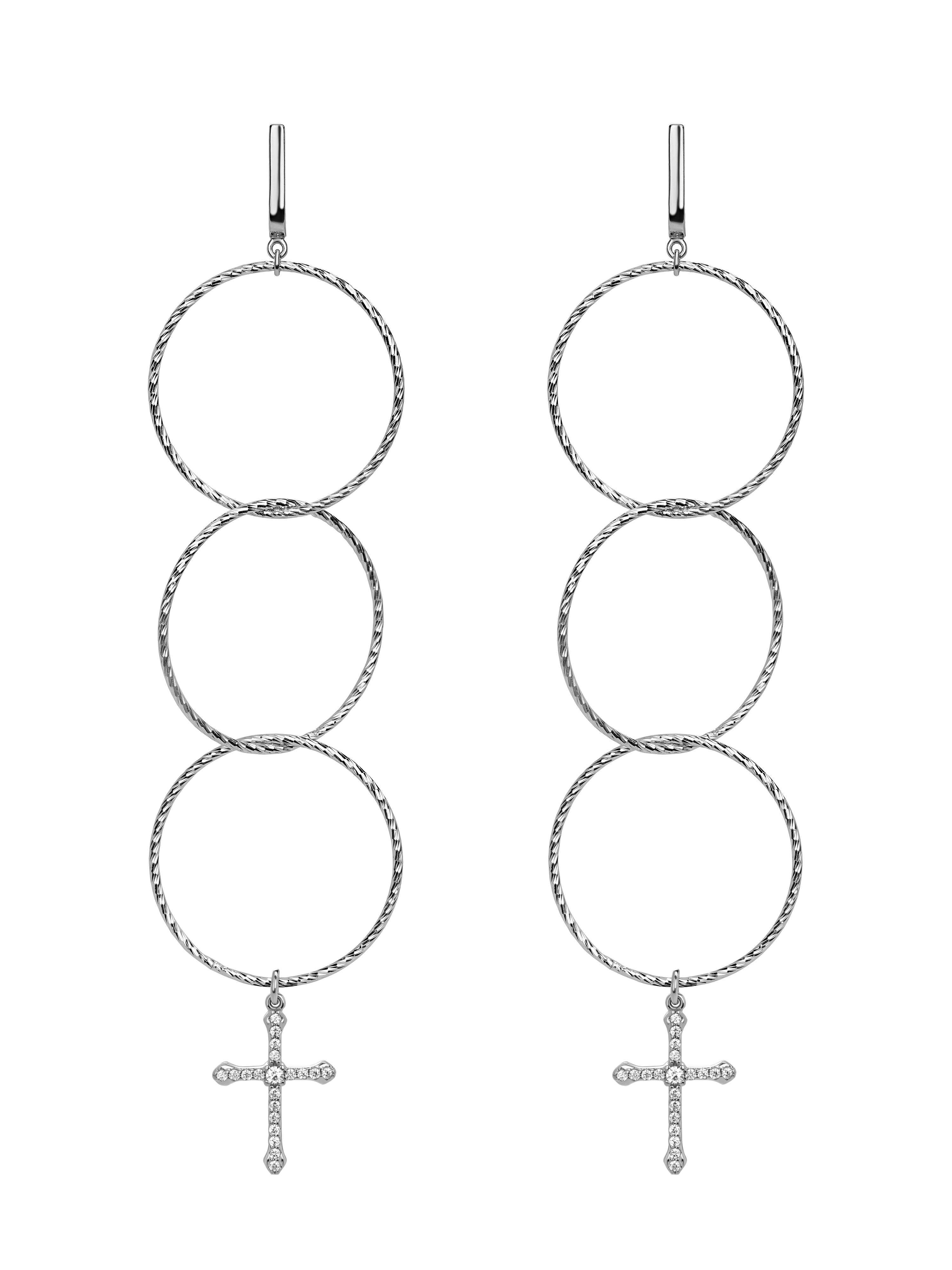 Long earrings in the form of three circles are made of 925 sterling silver. Cross-shaped pendants are set with round cubic zirconia.