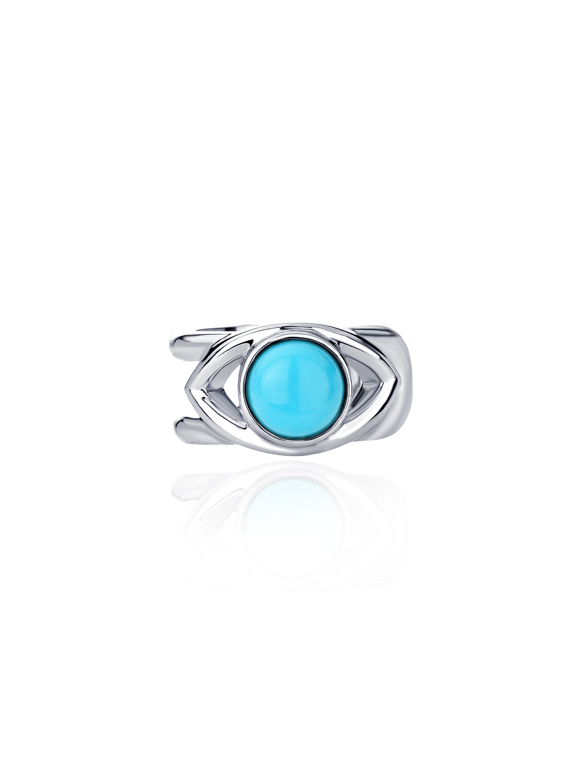A cuff in the shape of an eye made of 925 sterling silver and turquoise in cabochon cut weighing 0.08 ct. Wear it as a standalone piece or as part of sets with other items.