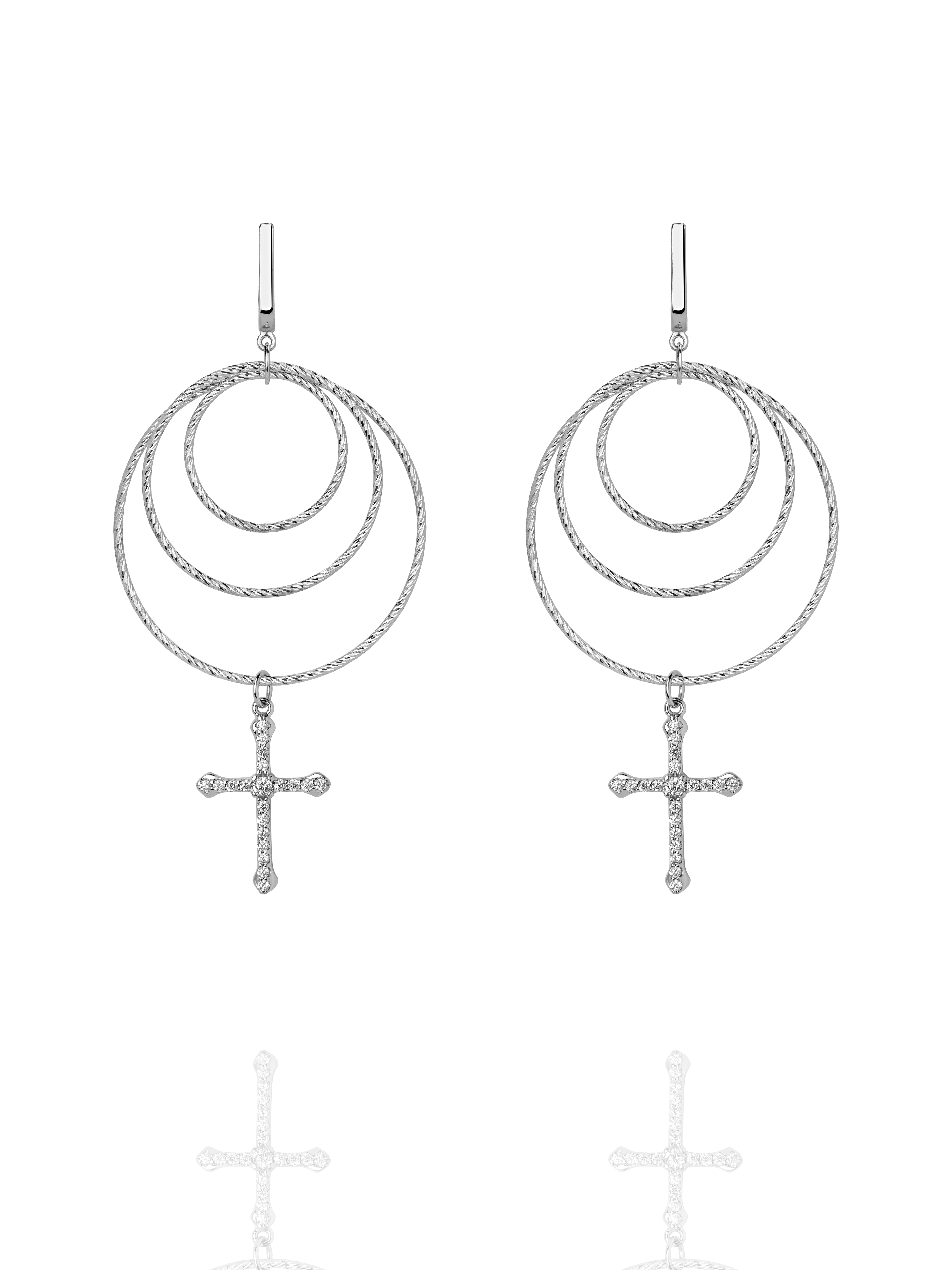 Triple hoop earrings are made of 925 sterling silver. The cross-shaped pendants are inlaid with round cubic zirconia.