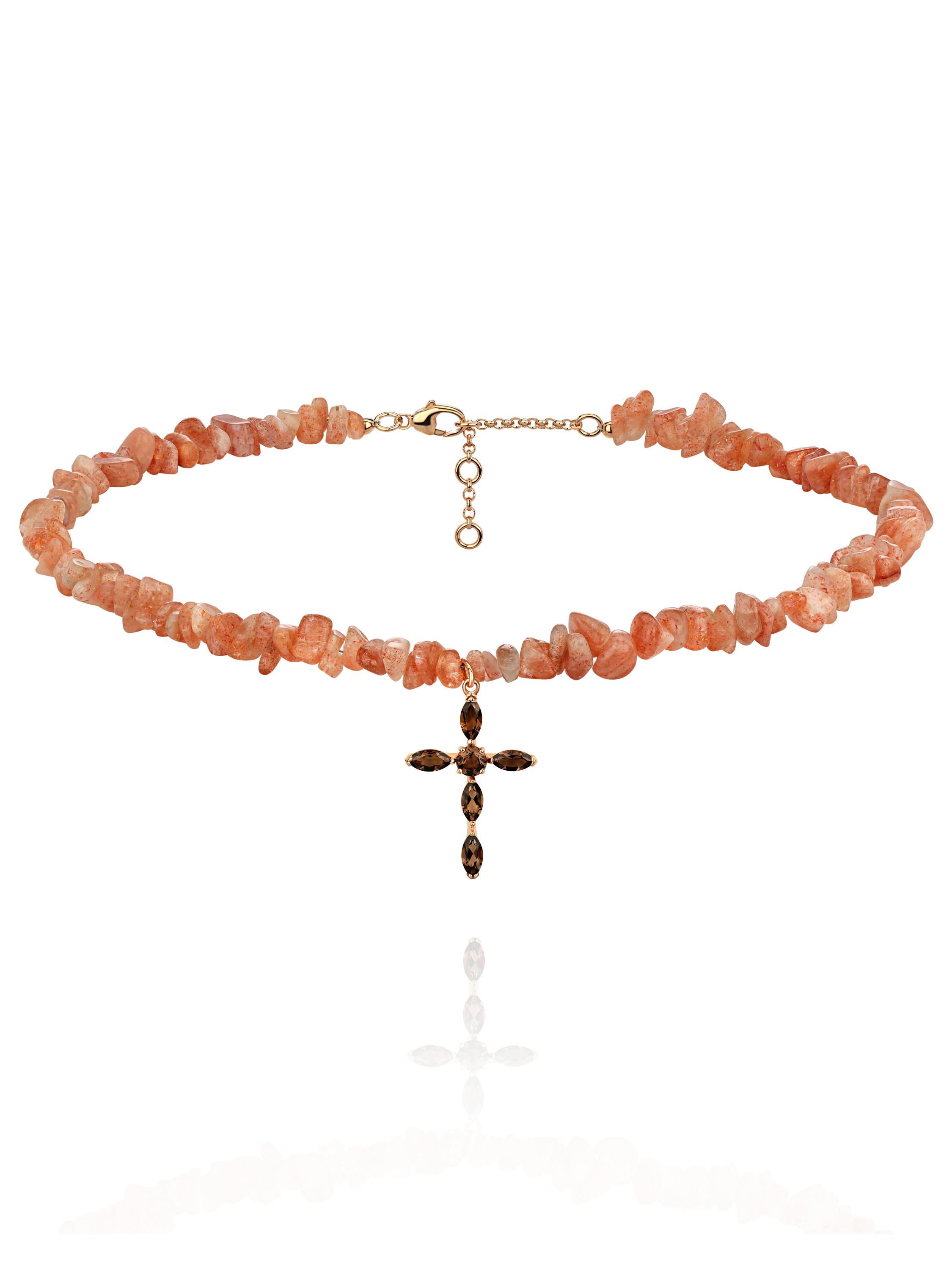 Choker necklace made of aventurines with a pendant in gilded 925 sterling silver, adorned with smoky quartz in round cut and marquise cut.