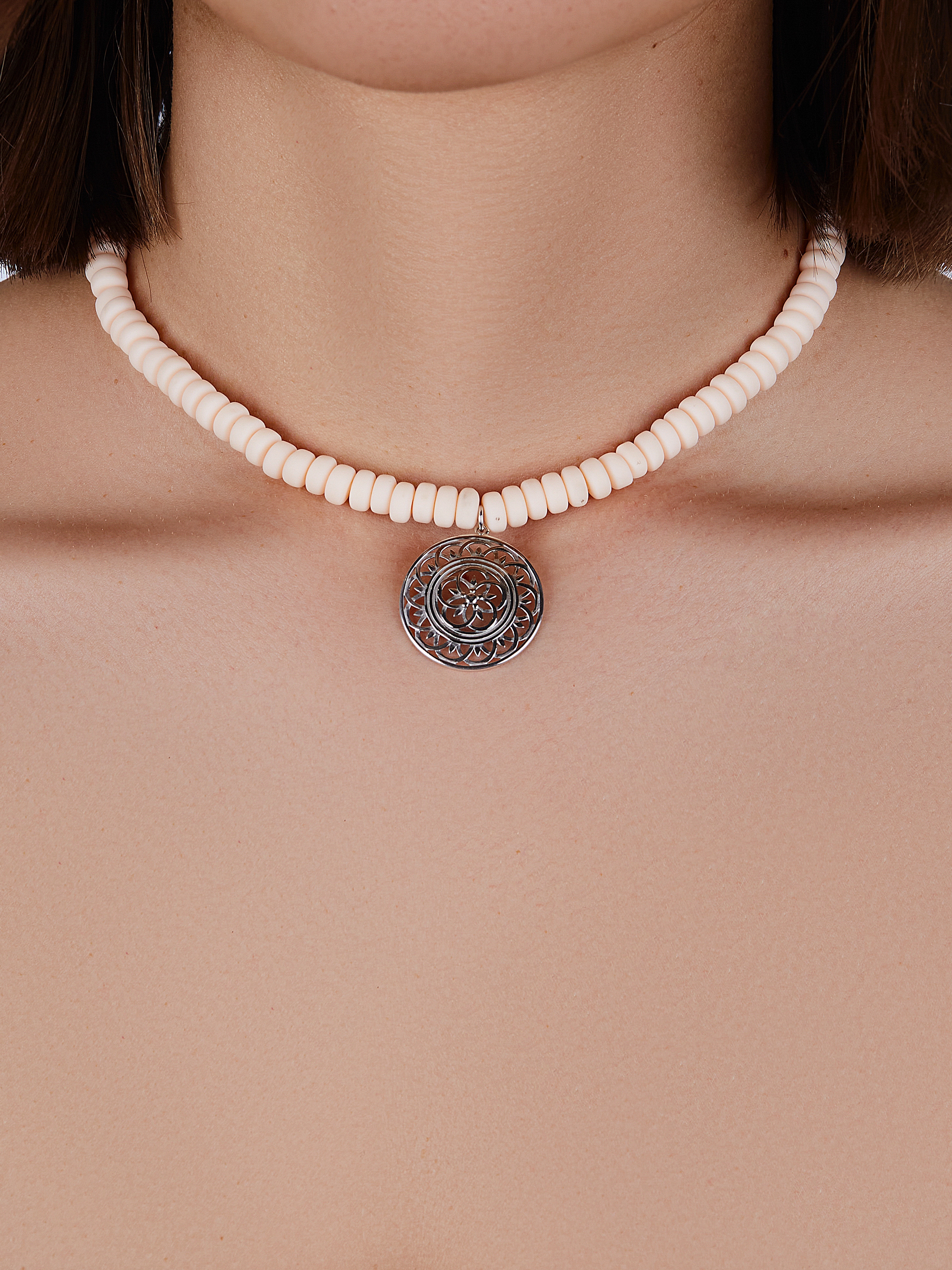 Choker necklace made of 925 sterling silver and beige rubber rings, complemented by a round silver pendant.