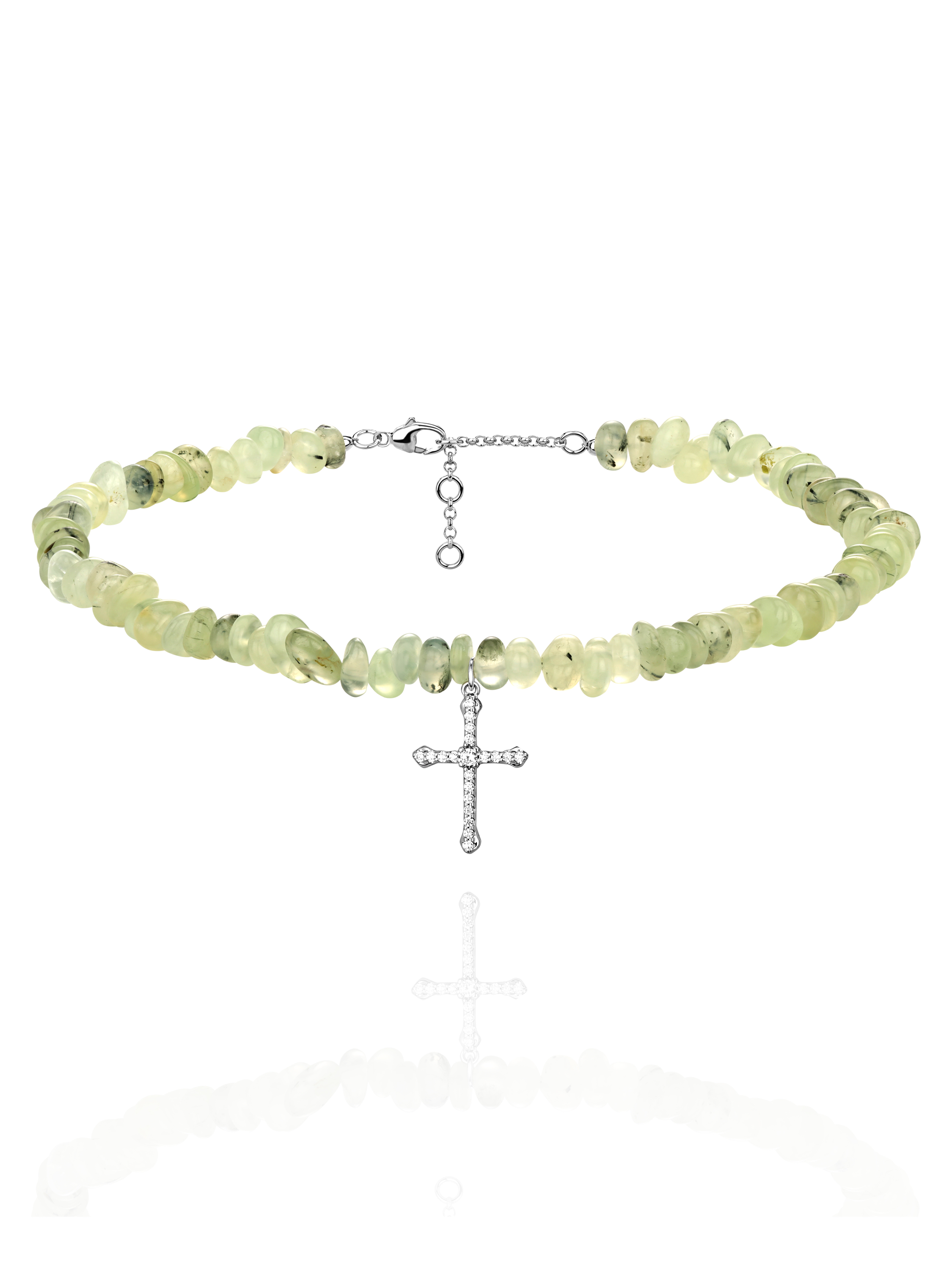 Choker necklace made of green quartz with a silver cross-shaped pendant adorned with clear cubic zirconia.