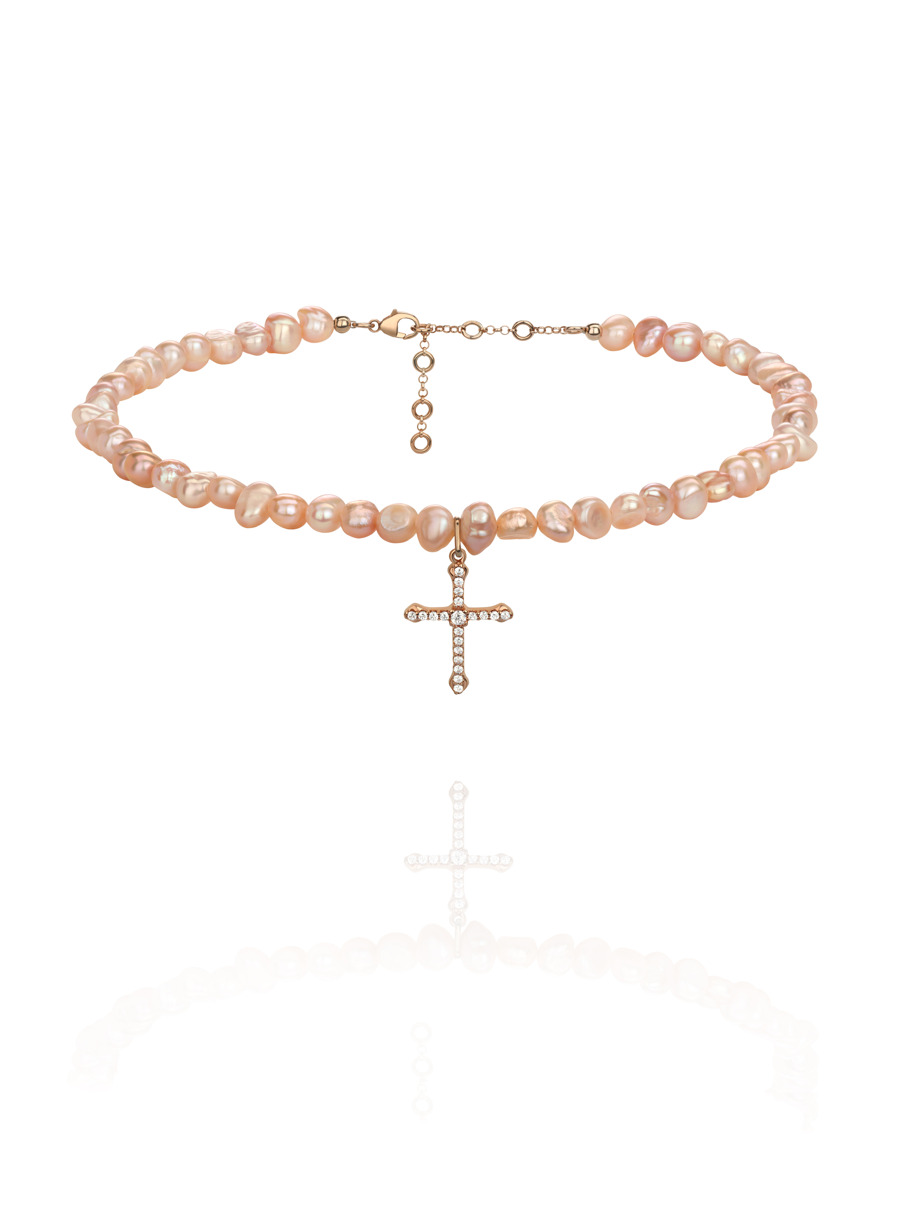 Choker necklace made of pink pearls and complemented with a cross-shaped pendant made of silver and cubic zirconia.
