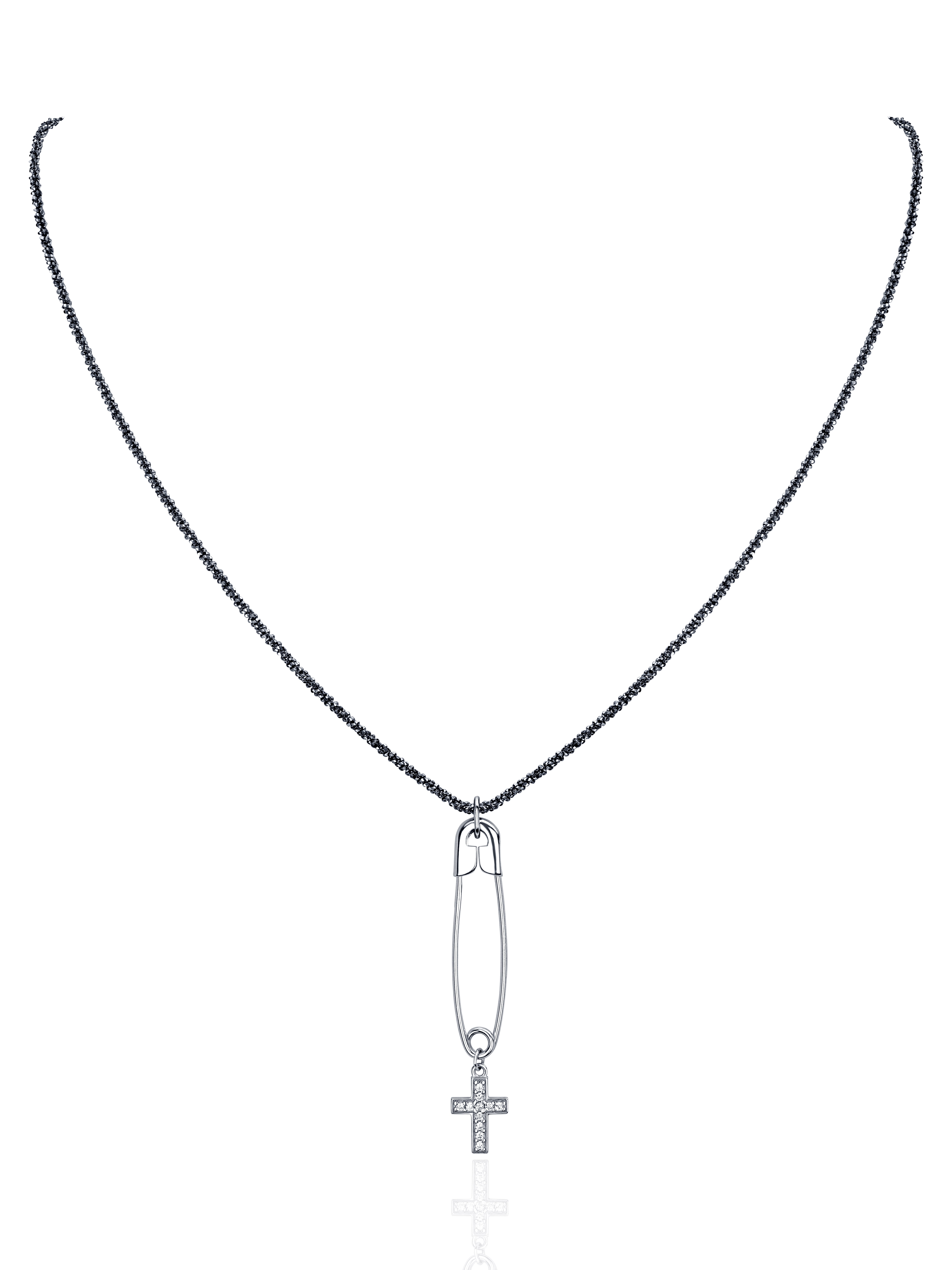 Necklace with a pendant in oxidized 925 sterling silver in the shape of a safety pin with a cross and cubic zirconia.