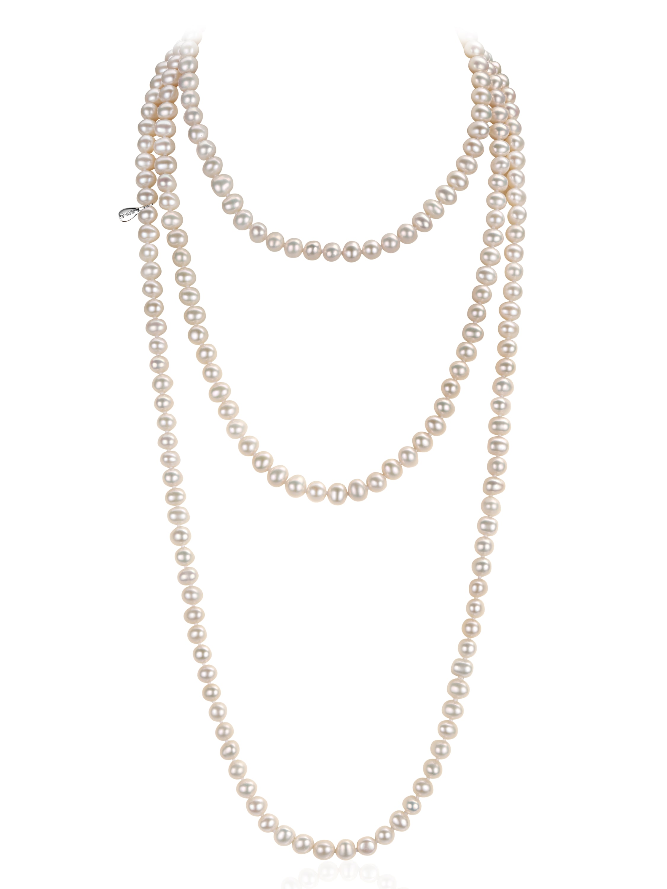 Silver necklace with 238 white pearl beads 89.33 g d 6.5-7.5. Length: 150 cm. The necklace is complemented by a tag with a round-cut cubic zirconia 0.01 g.