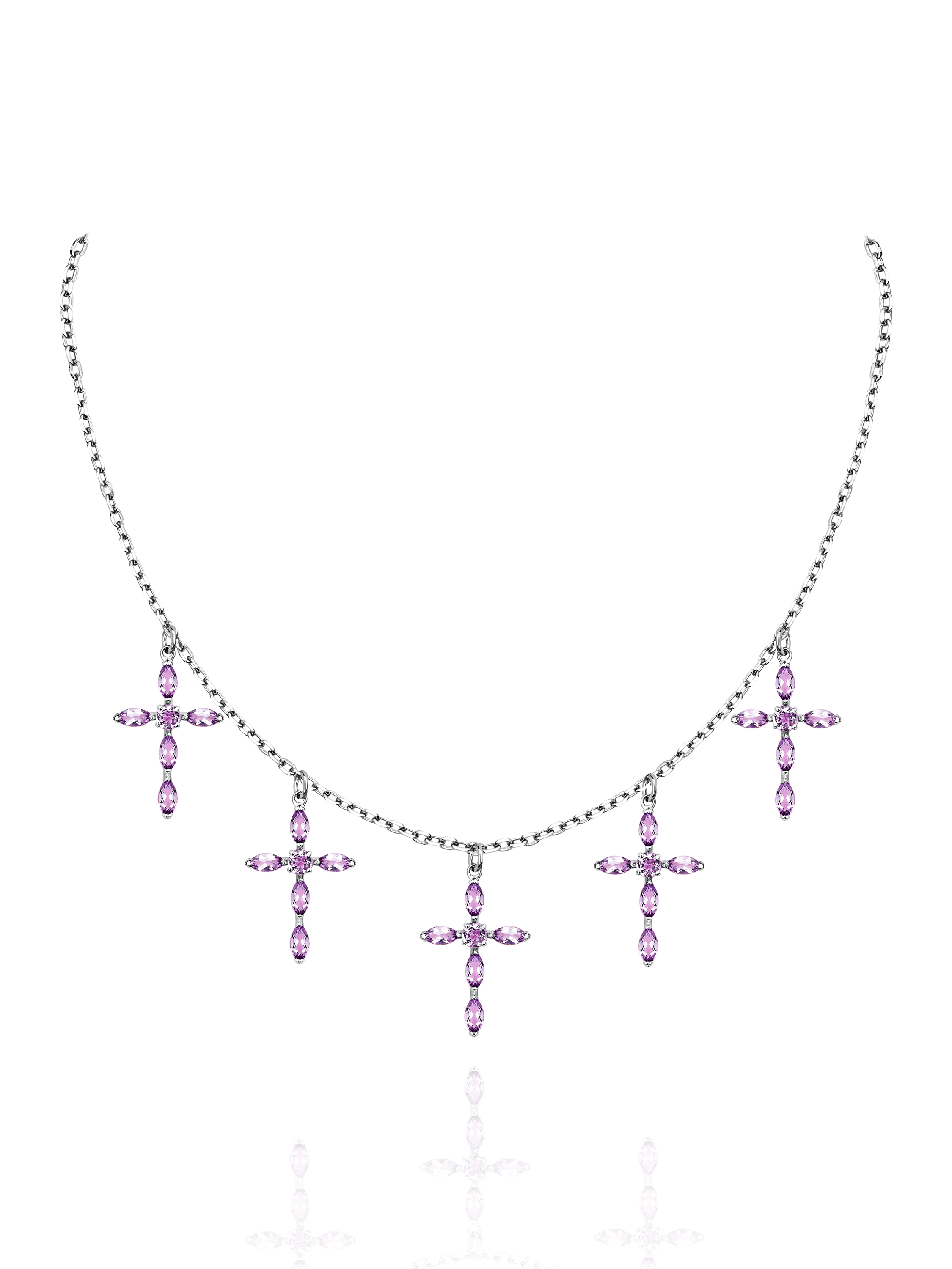 A necklace made of 925 sterling silver with cross pendants featuring 5 round-cut amethysts and 25 marquise-cut amethysts. Weight: 4.25 g.
