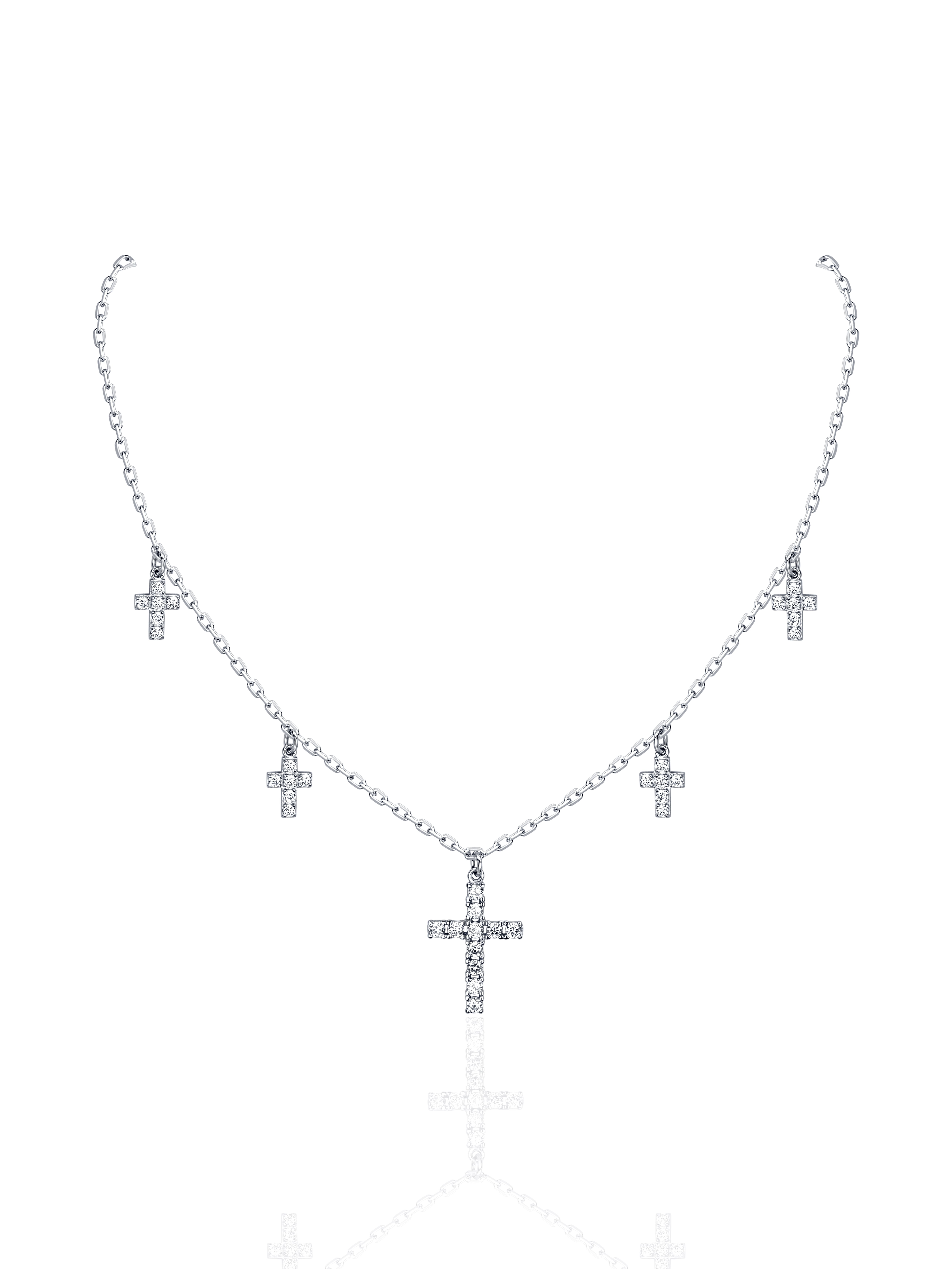Necklace made of 925 sterling silver with cross pendants with round-cut cubic zirconia stones.