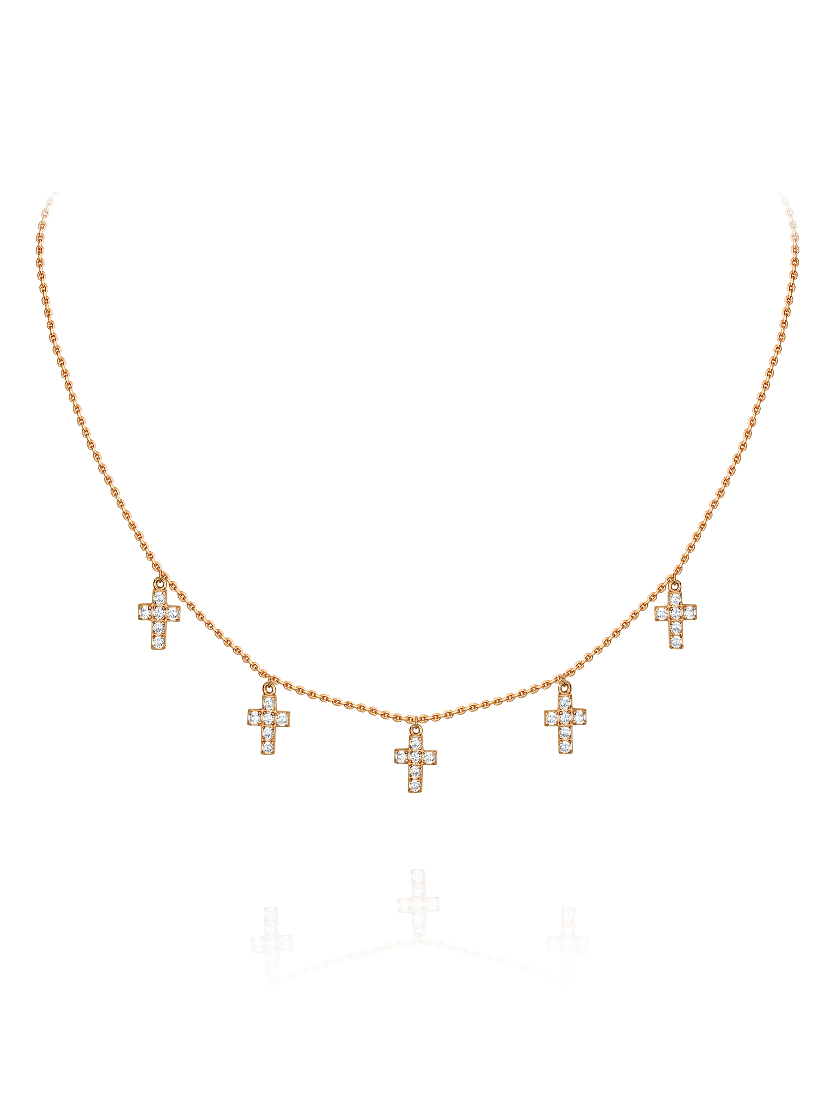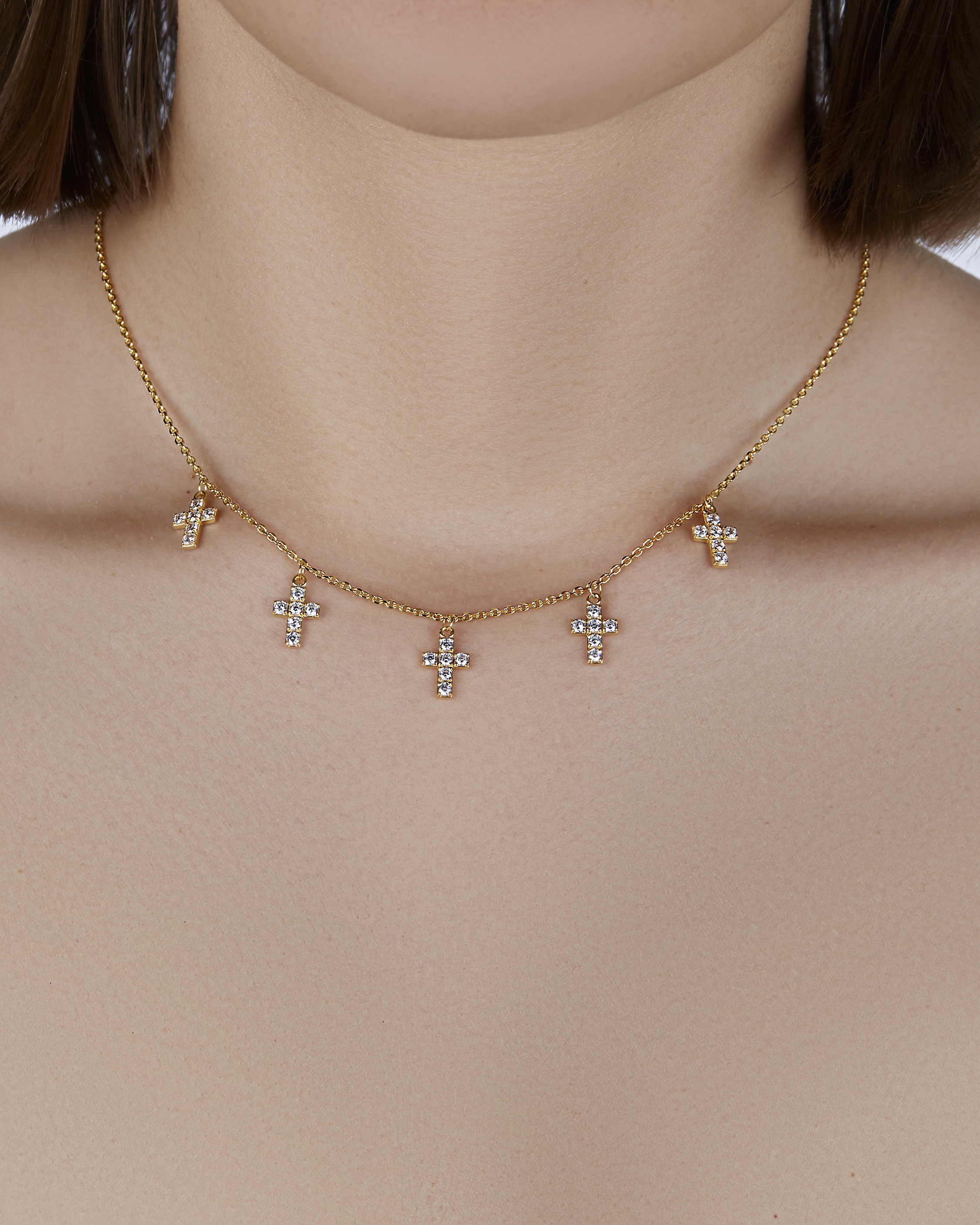 Necklace made of 925 sterling silver with gold plating and cross-shaped pendants with round-cut cubic zircons.
