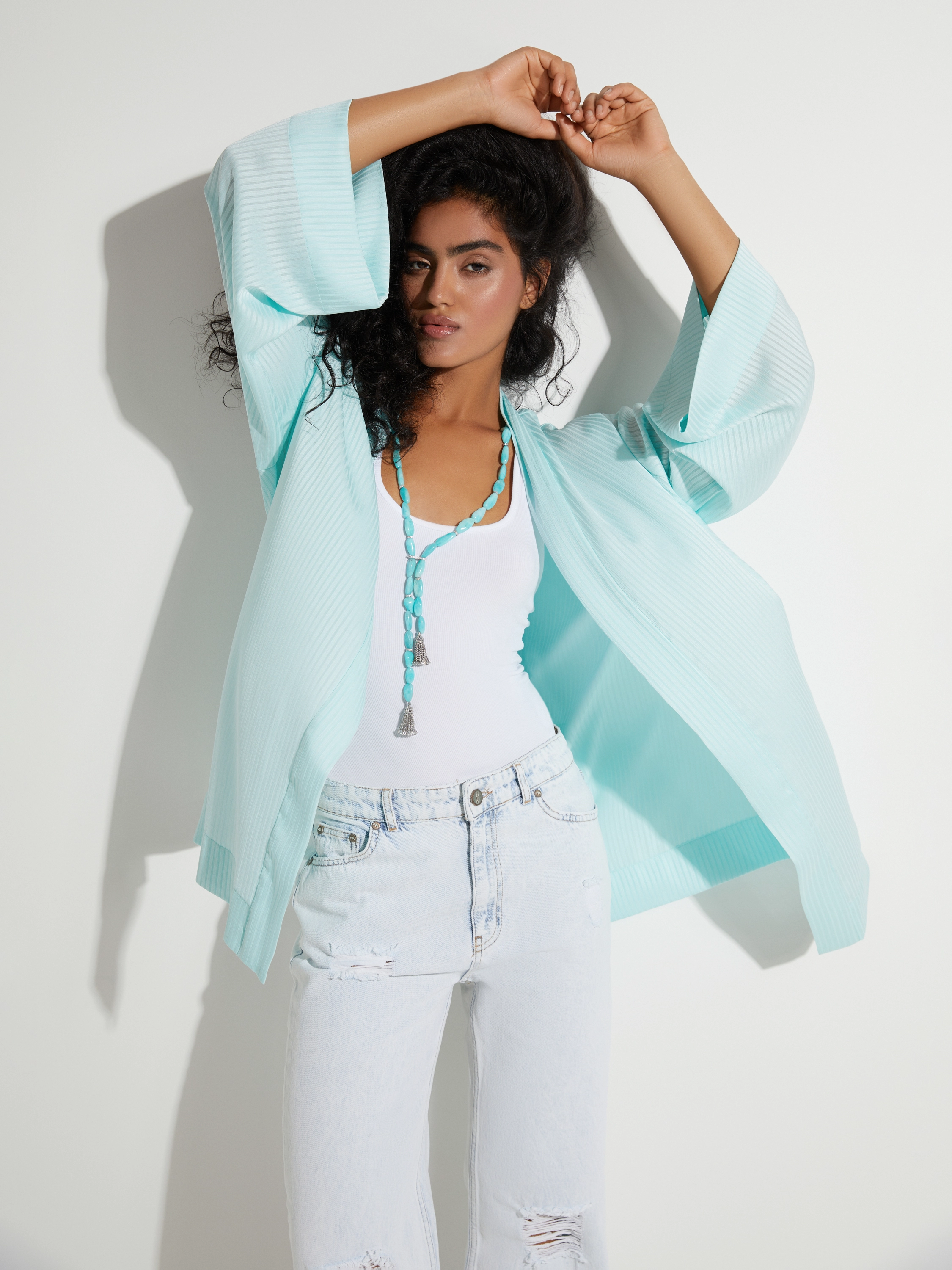 The belt necklace is made of 57 amazonites with a total weight of 132.14 g and complemented by inserts and tassels in 925 sterling silver with 108 cubic zirconia stones with a total weight of 1.84 g.