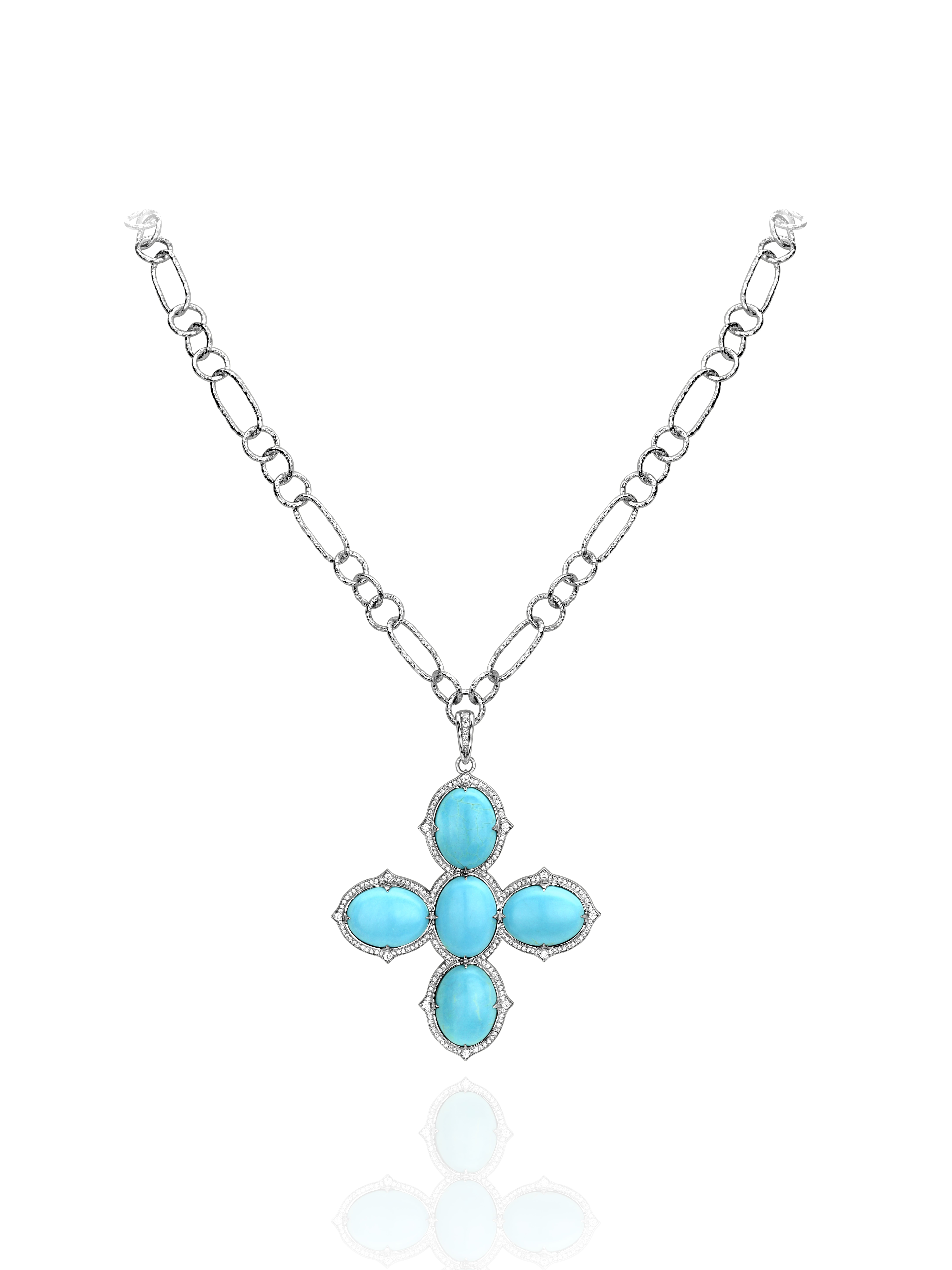 Necklace with a pendant in sterling silver 925 with 5 oval turquoise beads of cabochon cut with a total weight of 13.45 g and 217 cubic zirconia with a total weight of 0.55 g.