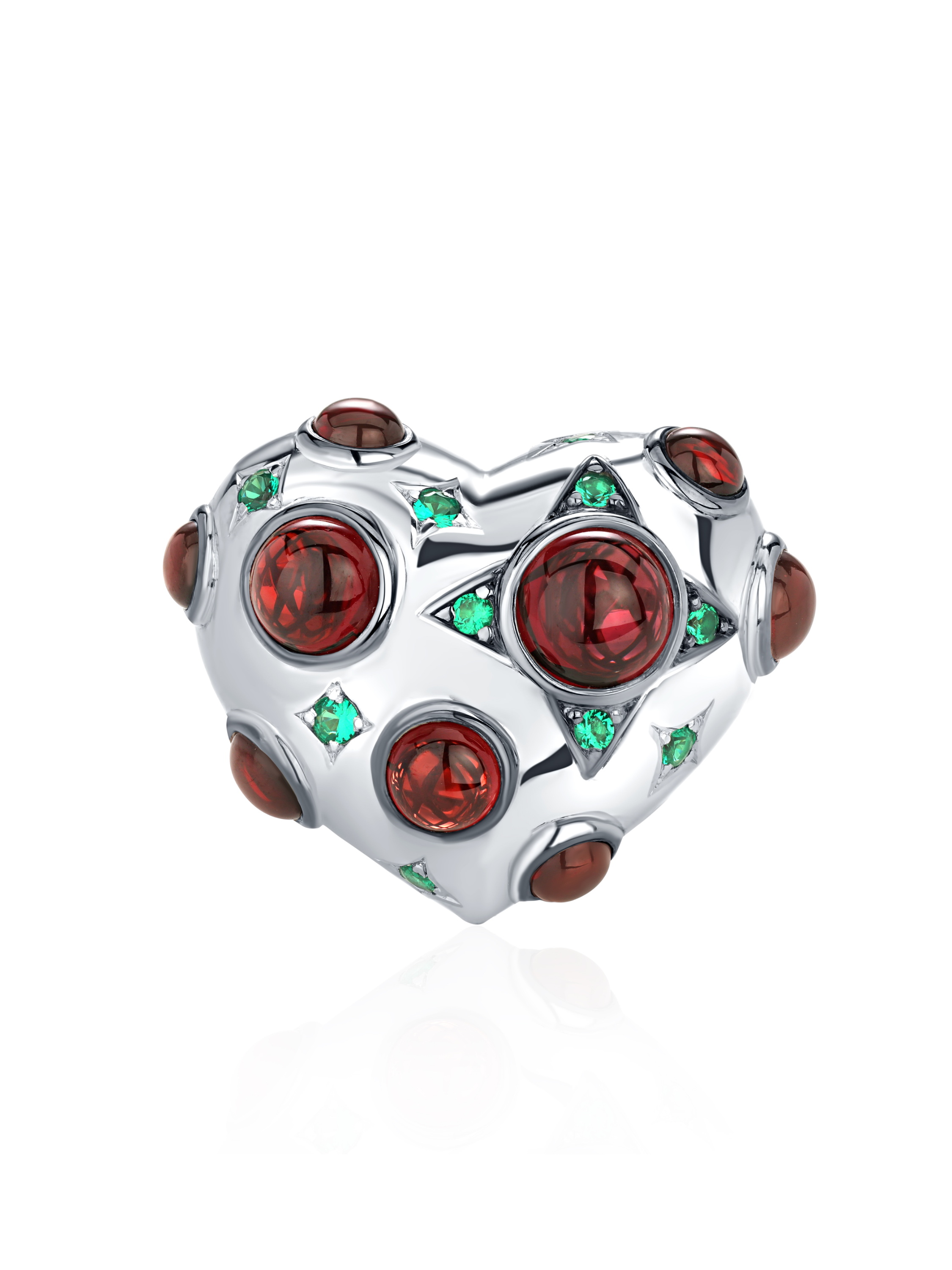 Ring made of 925 sterling silver with 9 round-cut garnets with a total weight of 1.9 g and 10 green cubic zirconias with a total weight of 0.21 g.