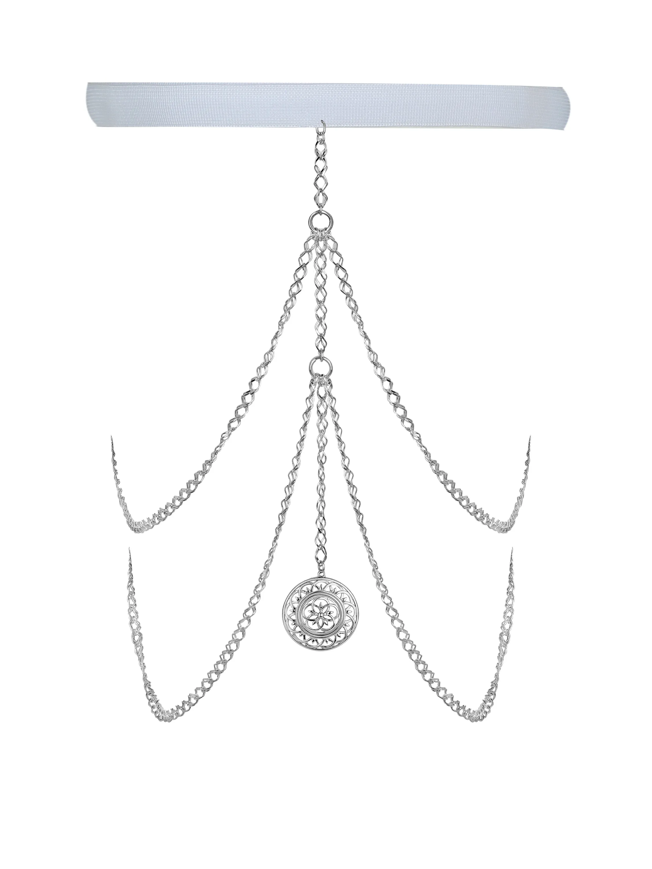 The elastic garter with chains and medallions is made of 925 sterling silver. The piece is worn on the leg.