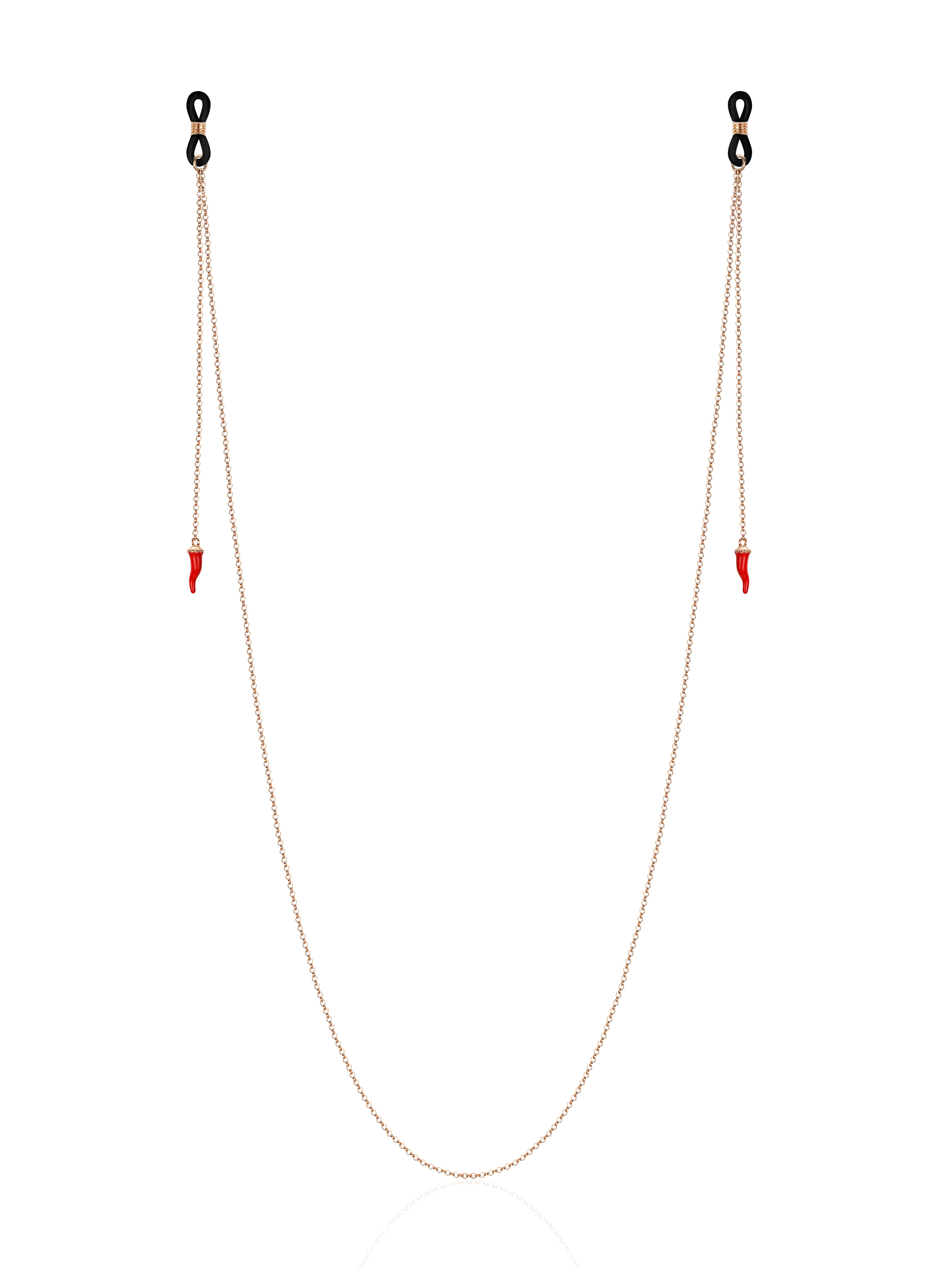 The glasses chain is made of 925 sterling silver with pink gold plating and complemented by pendants in the shape of peppers made of red jewelry enamel. Length – 60 cm.