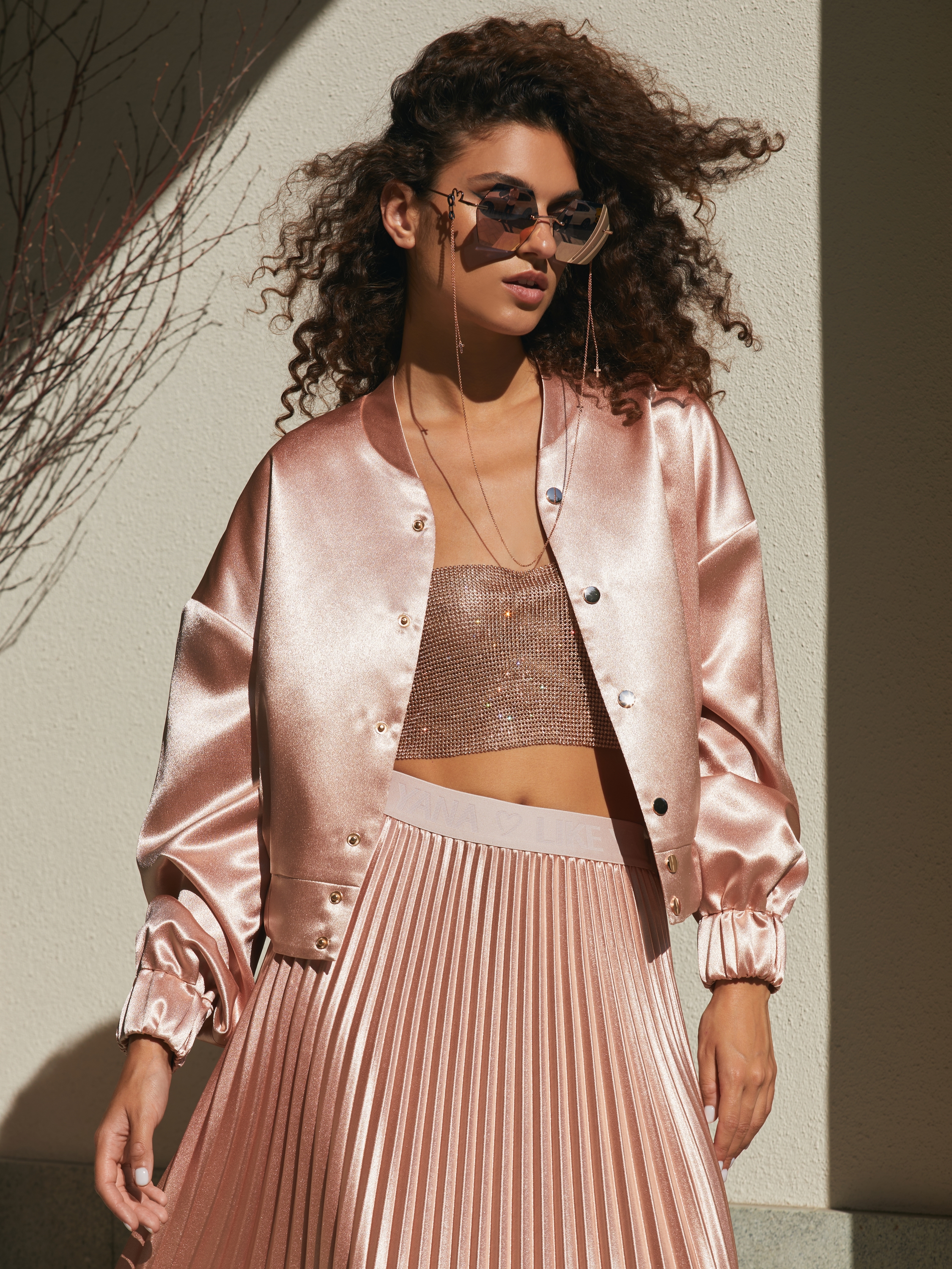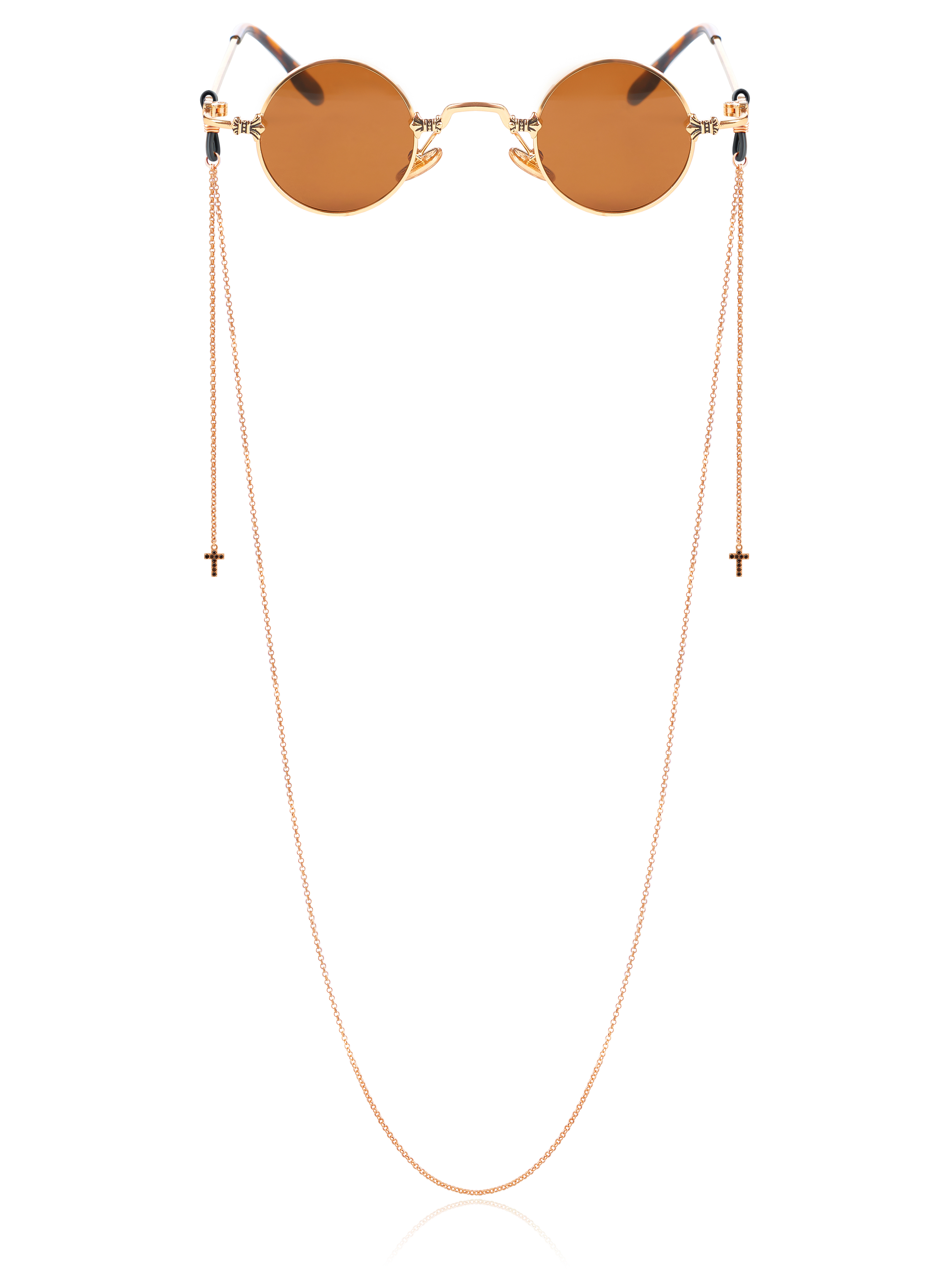 The eyeglass chain is made of 925 sterling silver with pink gilding and is complemented by pendants in the shape of crosses with black cubic zirconia.