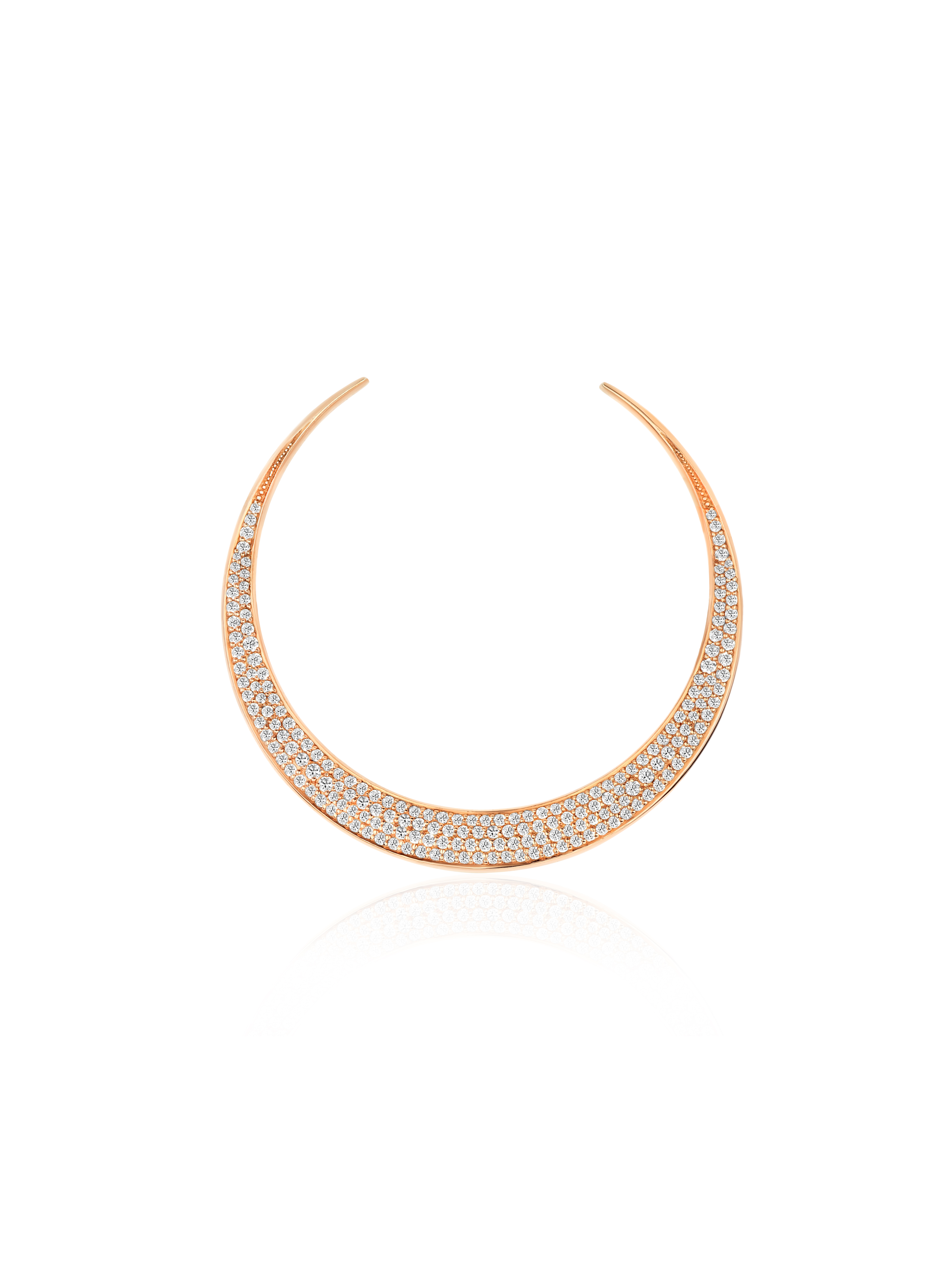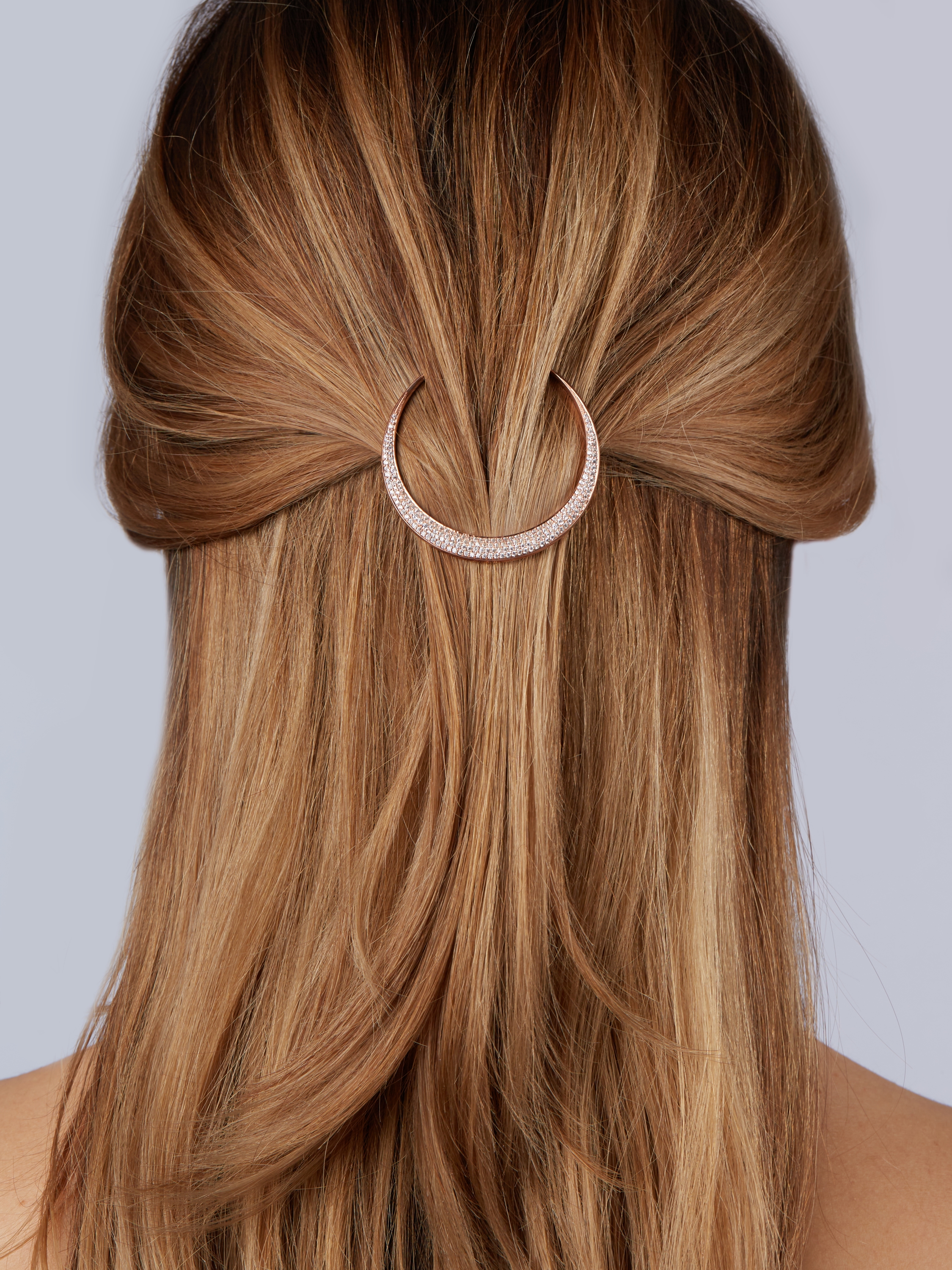 A crescent-shaped hair clip made of 925 silver with rose gold plating, adorned with 192 transparent round-cut cubic zirconias.