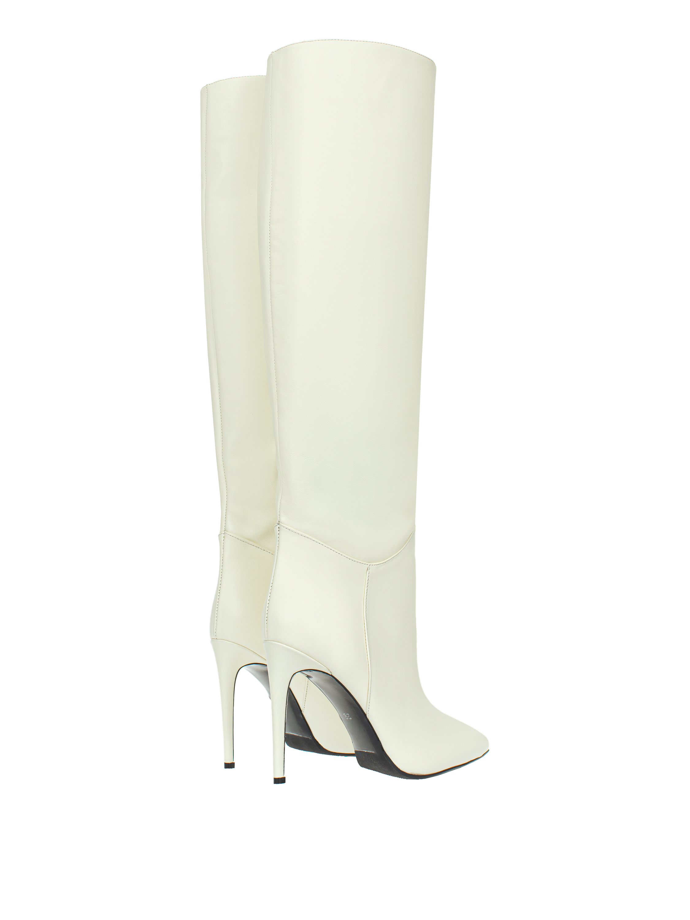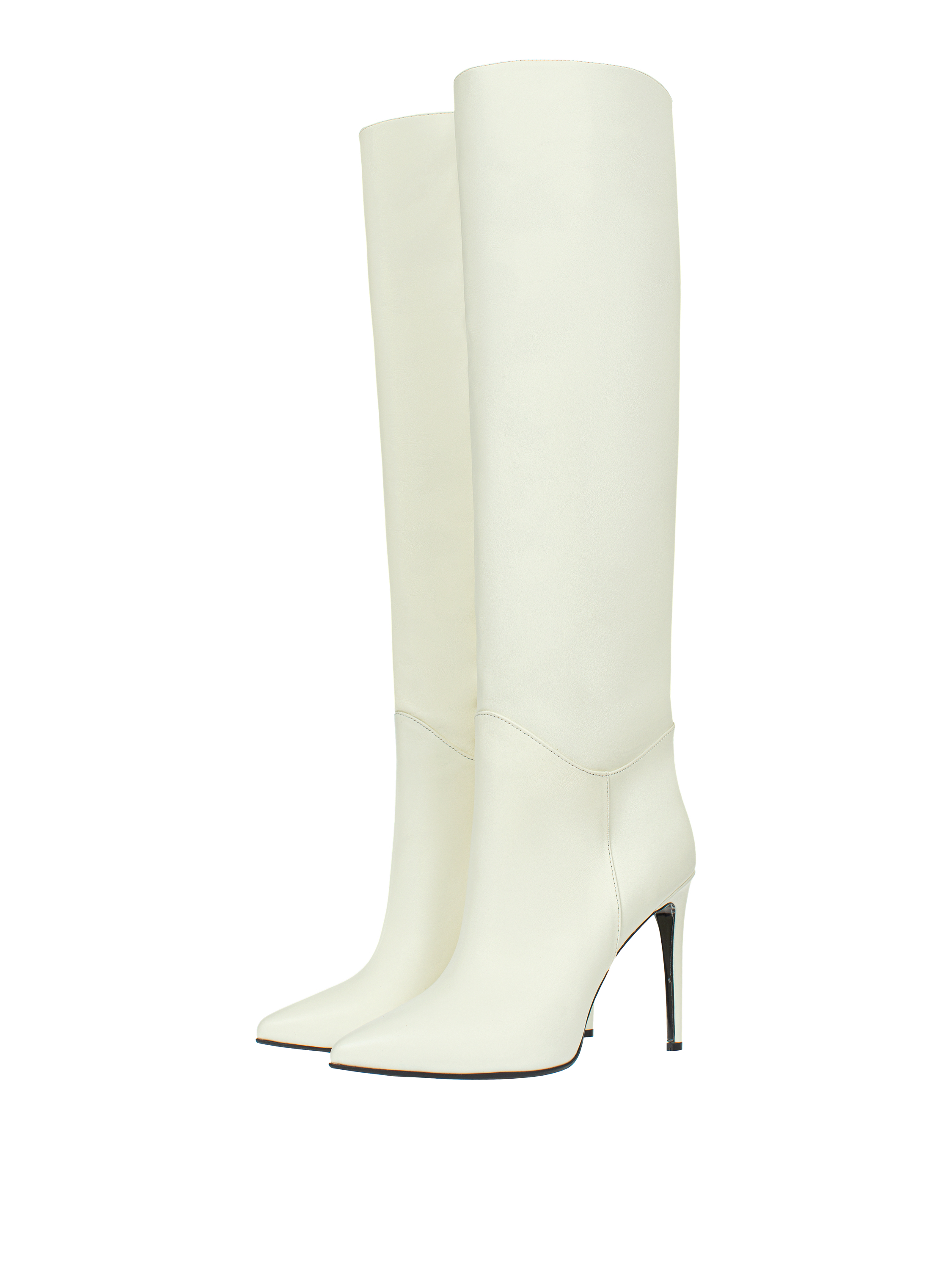 White high-stiletto boots with a pointed toe will help create a memorable look. Thanks to the wide shaft, the boots without zippers are easy to put on and take off. The model is made of soft grained leather with a matte sheen.