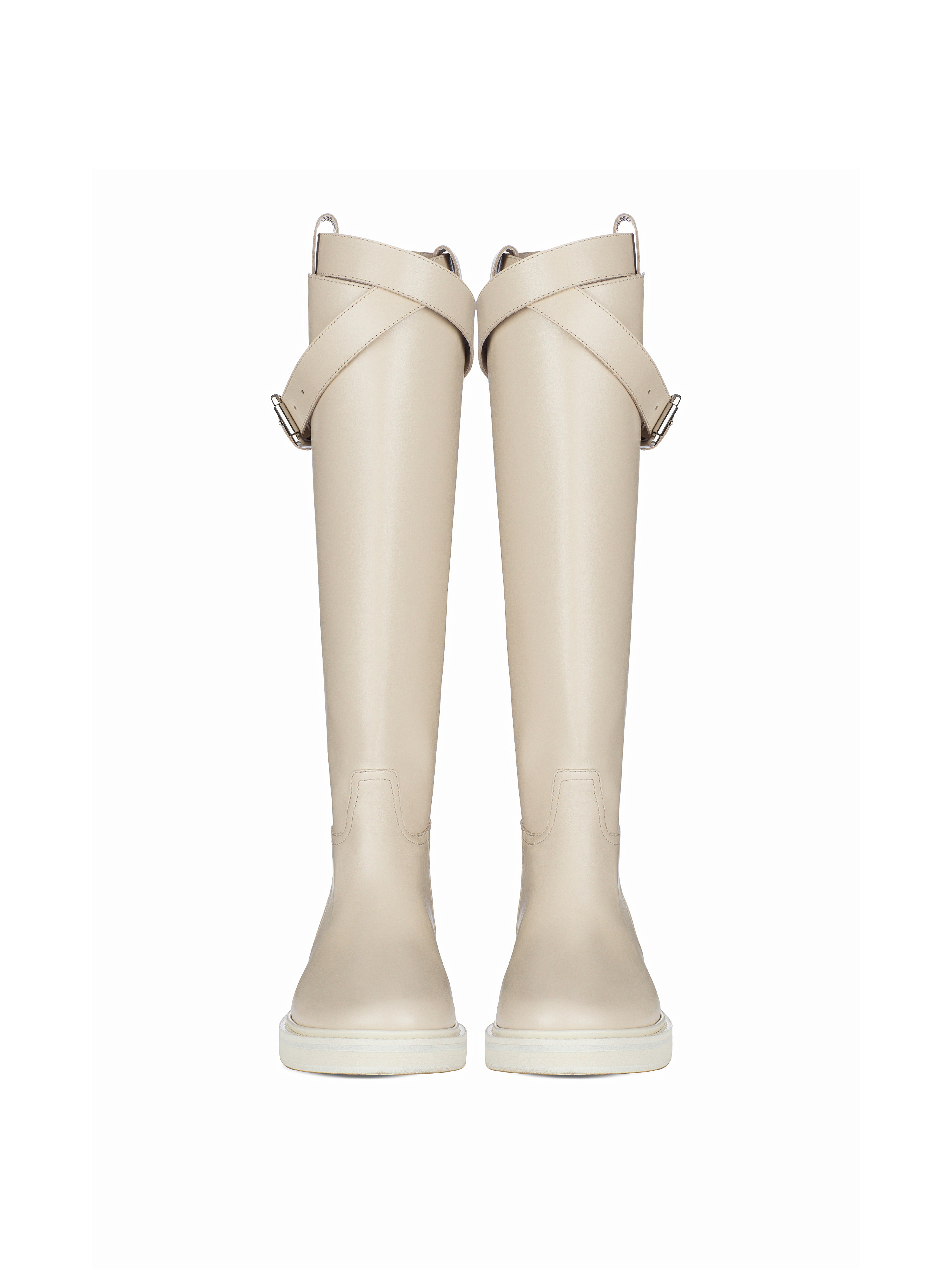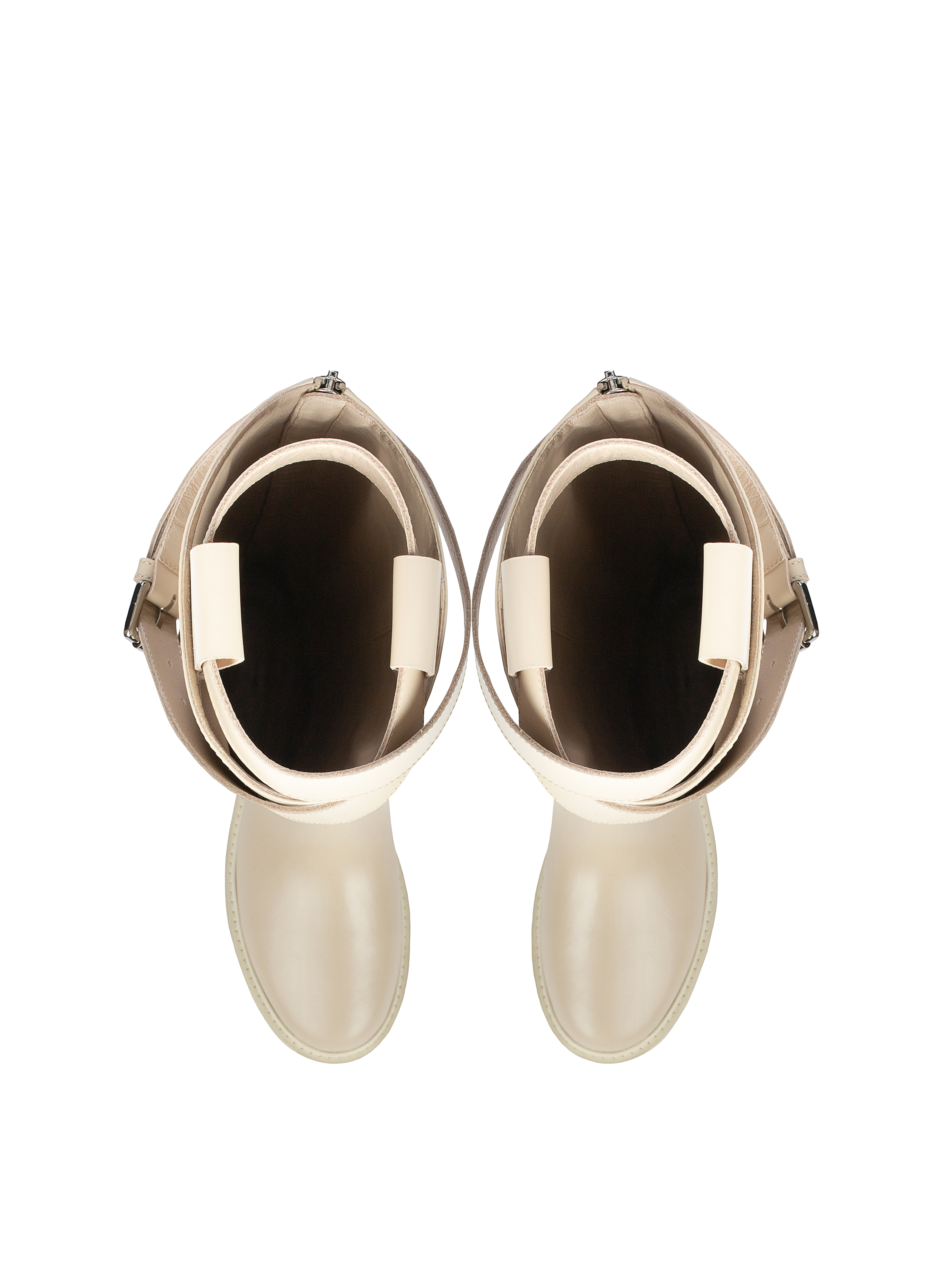 Beige boots with a round toe on a low square heel are made of genuine leather. The high shaft is complemented by leather straps. Thanks to the small side loops, the slip-on model without fastening is easy to put on and take off.