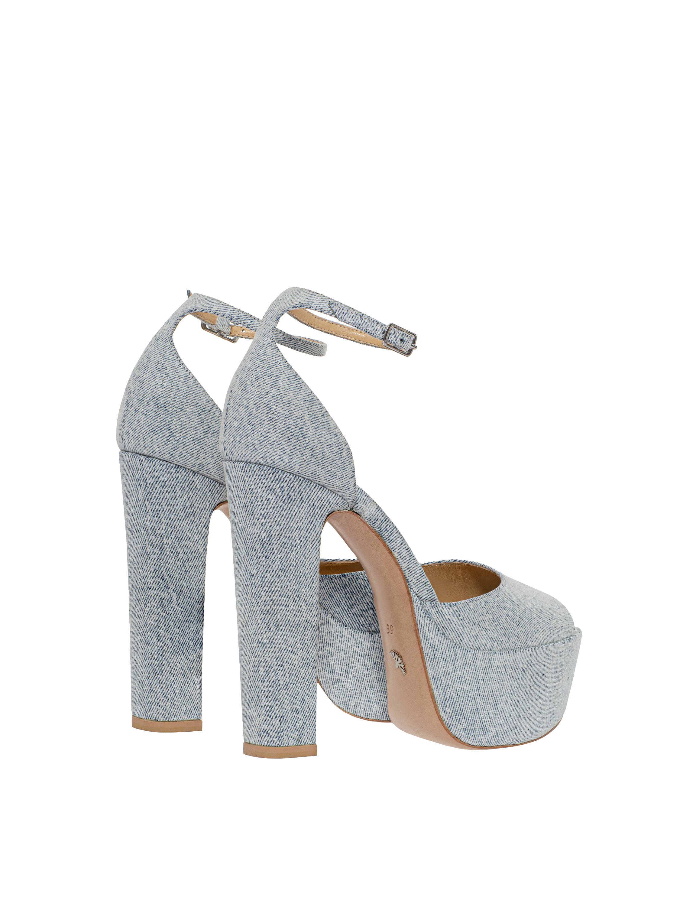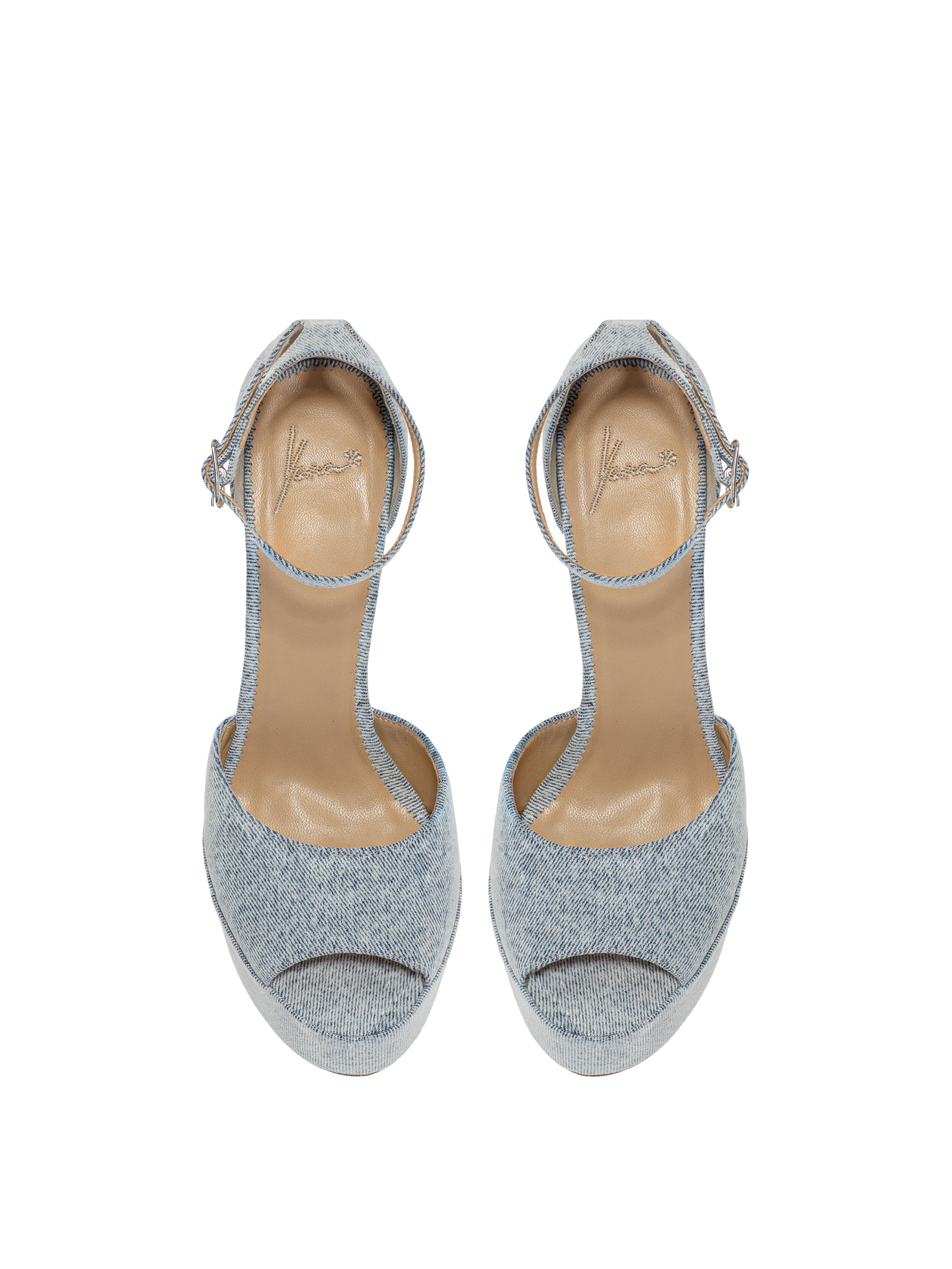 Platform sandals with a high stable heel are made of light blue washed denim. Around the ankle there is a thin strap with a buckle that securely fixes the shoe on the foot.