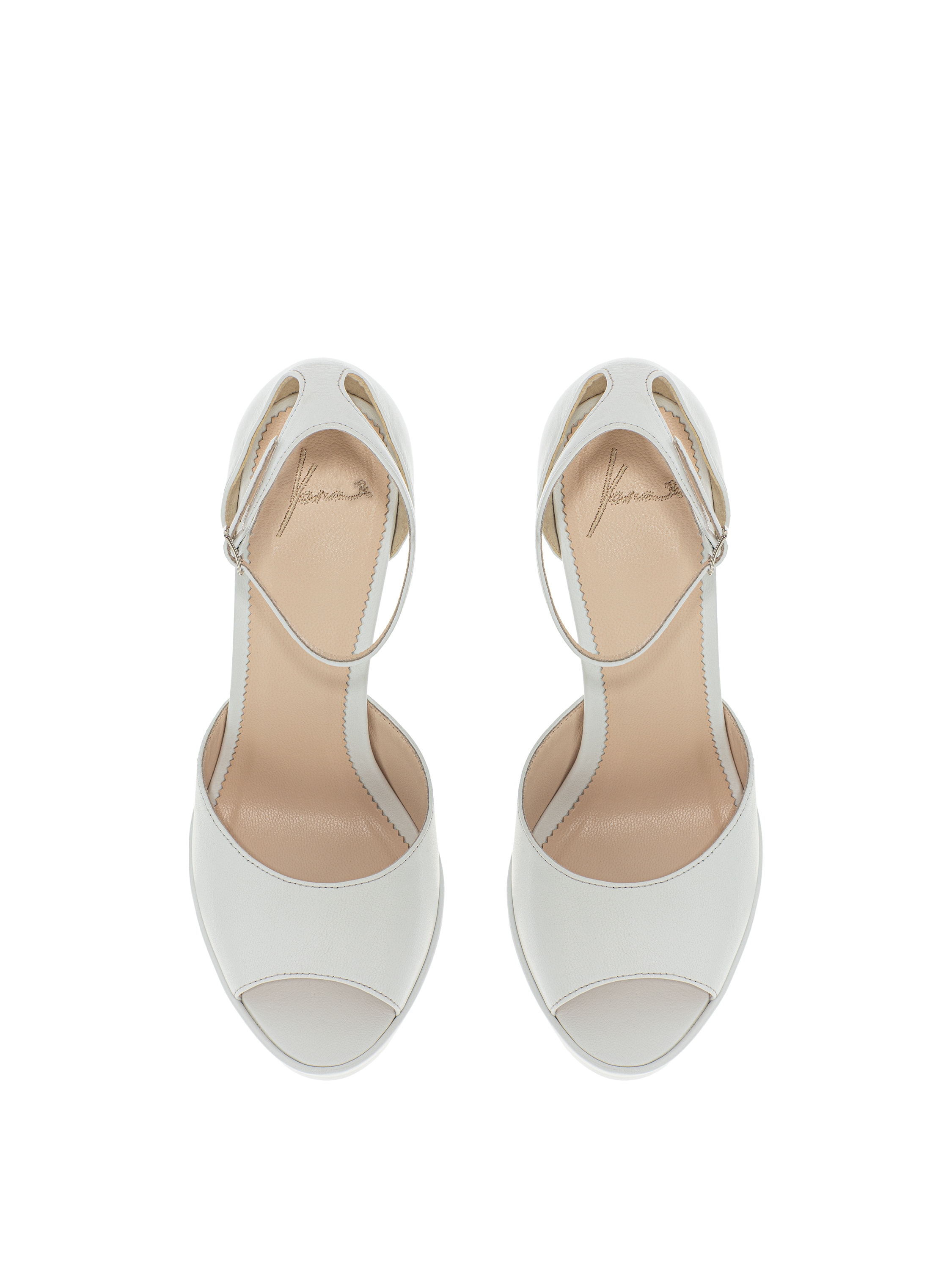 Platform sandals with a high stable heel in white are made of genuine leather. At the ankle there is a thin strap with a buckle that securely fixes the shoe on the foot.