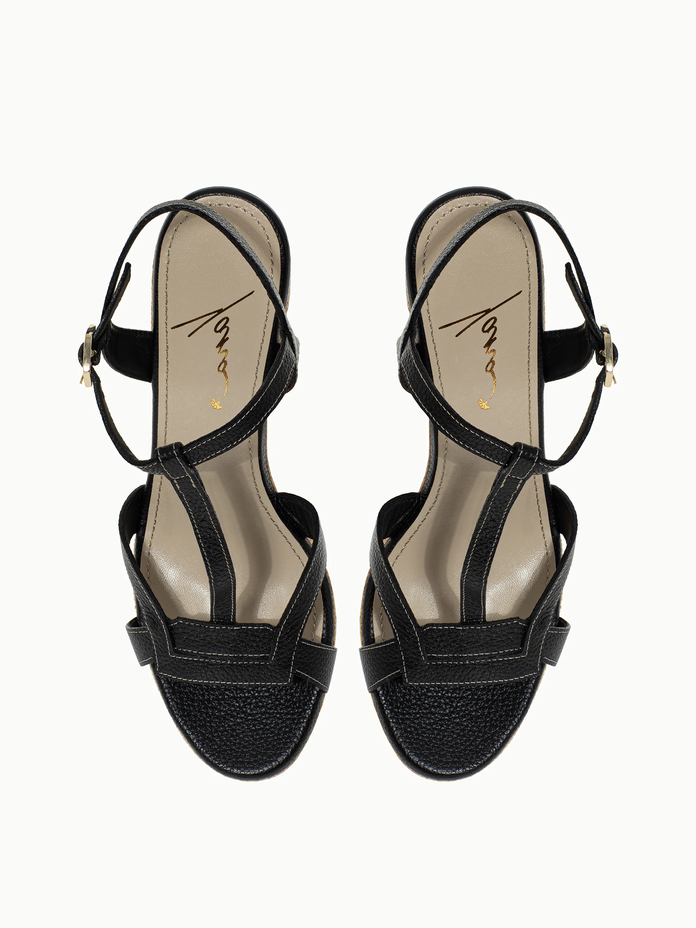 Wedge sandals are a choice in favor of comfort and elegance. The model with a minimalist shaped strap is made of genuine pebbled black leather. Soft adjustable ankle strap. Wedge height – 10.8 cm.