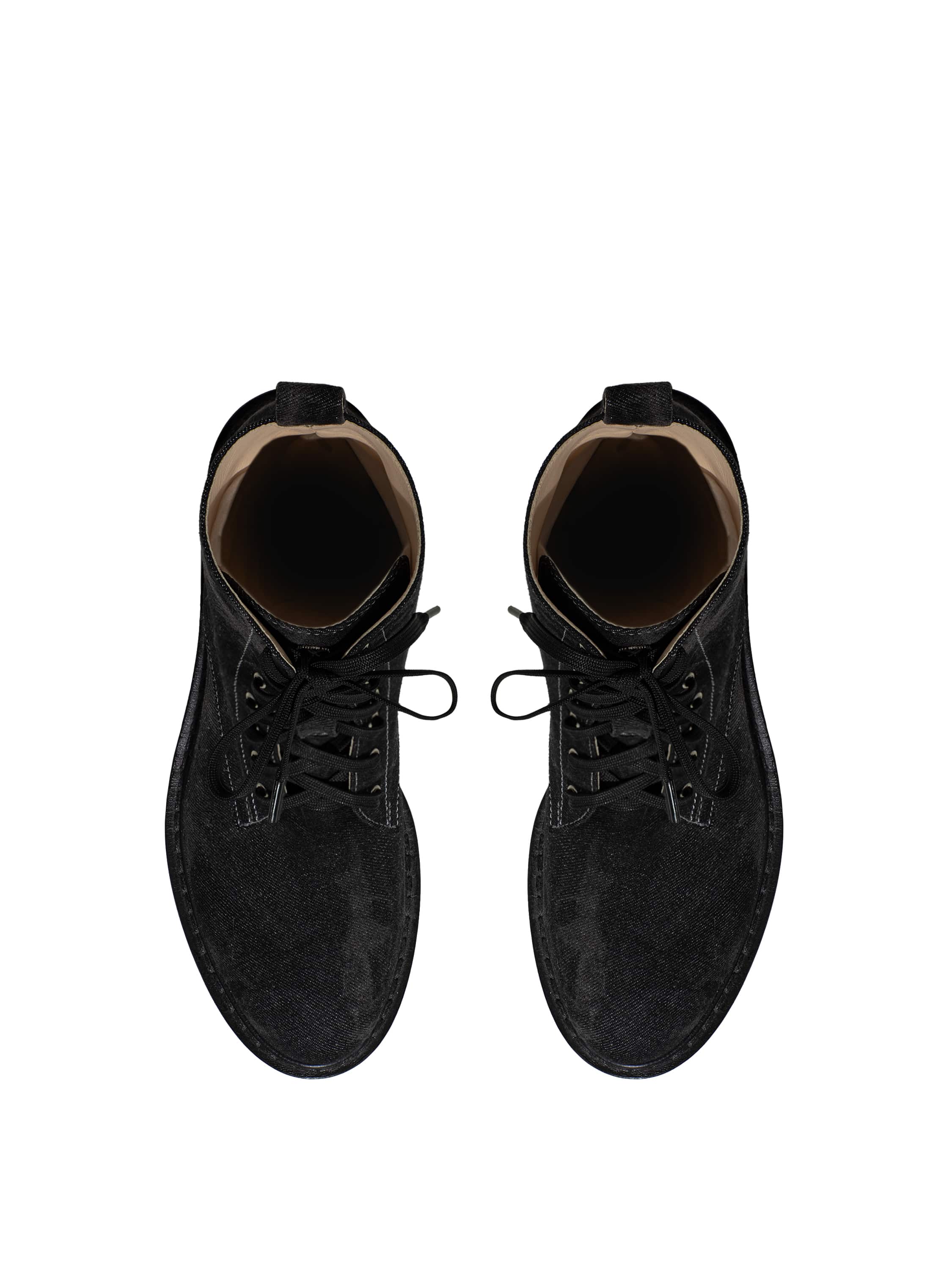 High dark grey boots with a round toe and tone-on-tone lacing are made of genuine leather covered with denim fabric. The thick sole is made of pressed leather and protected by a rubber tread.