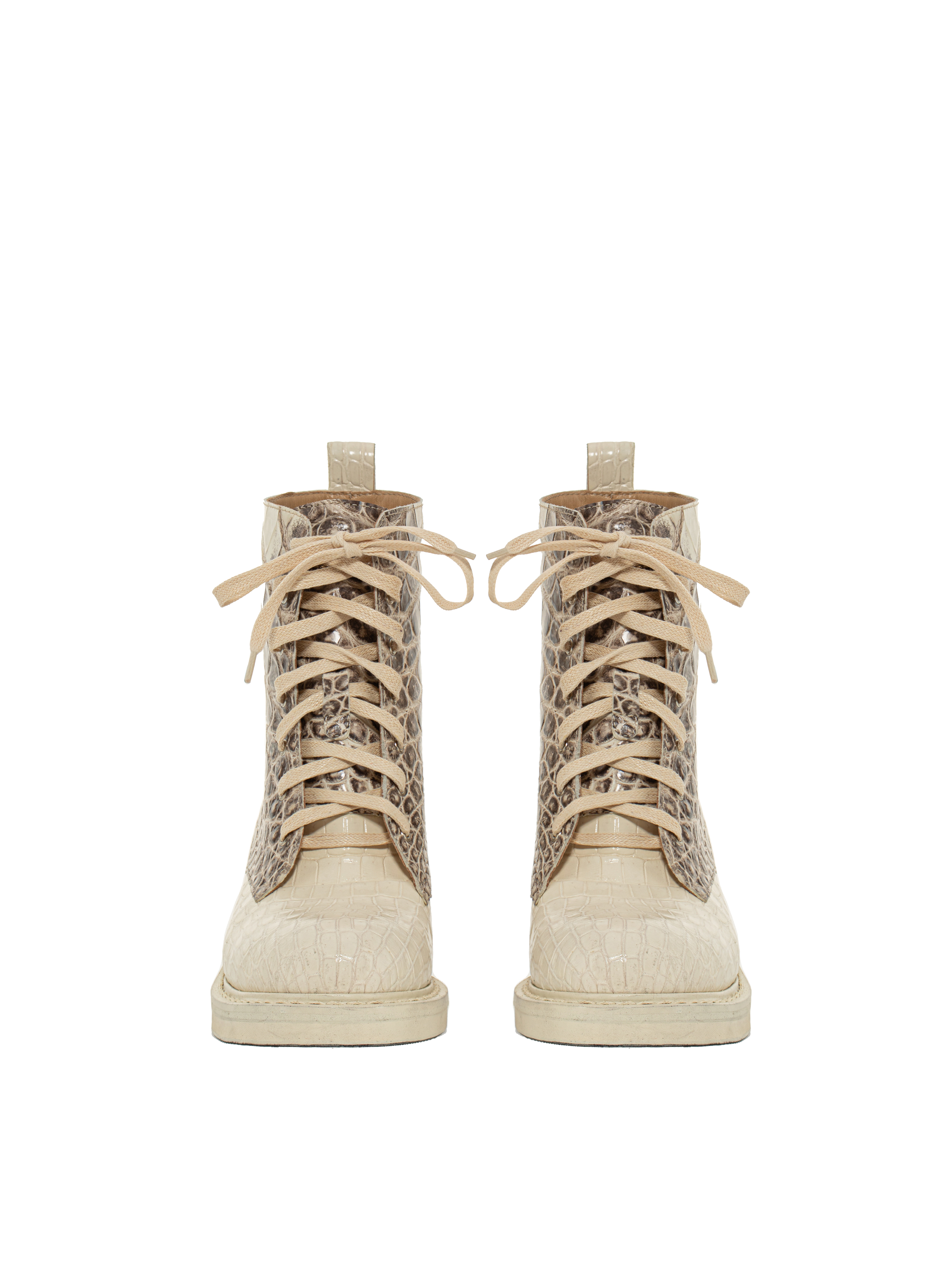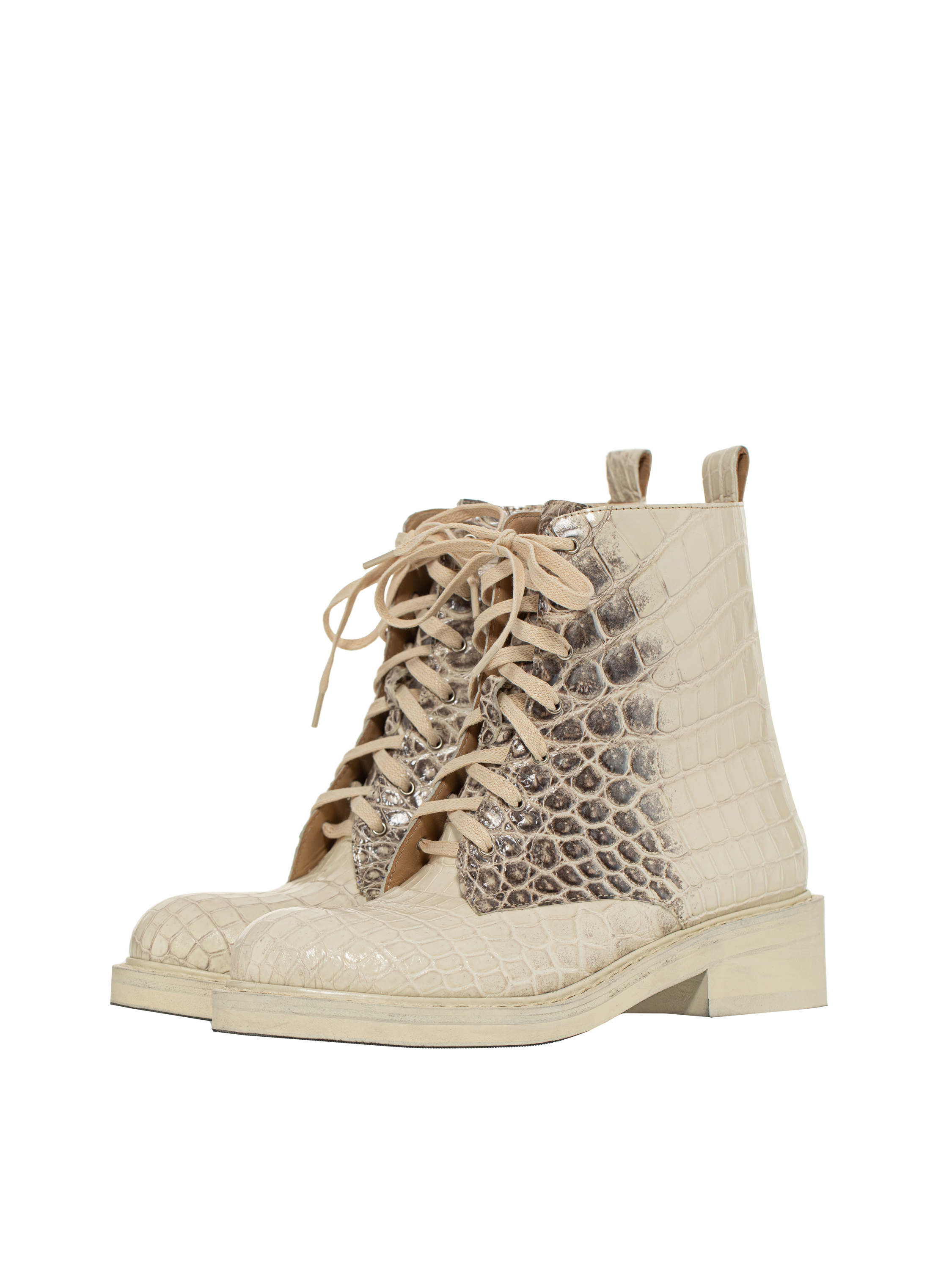 High boots with a round toe and contrasting lacing are made of the rarest Himalayan crocodile leather. The thick sole is made of pressed leather and protected by a rubber tread.
