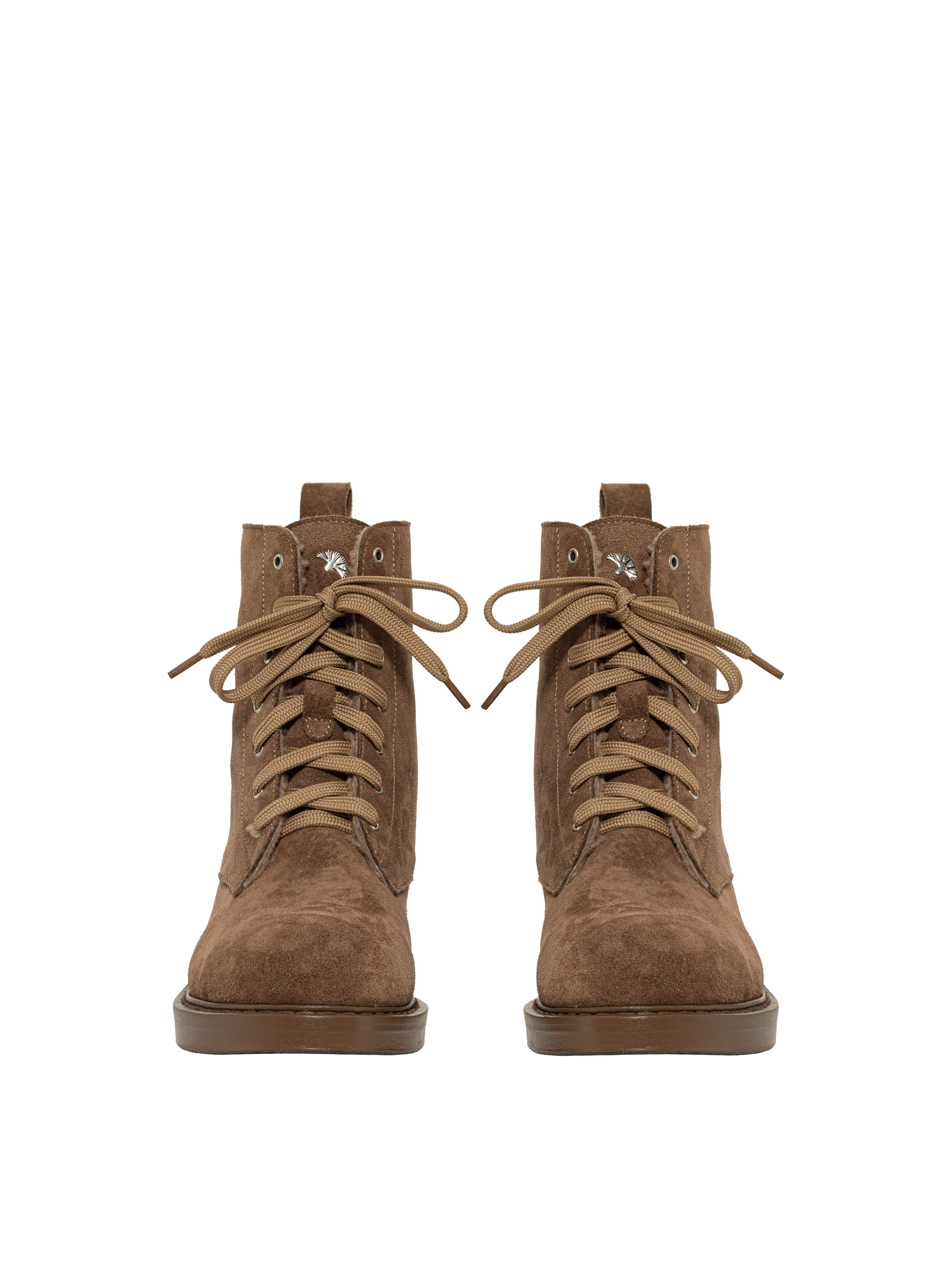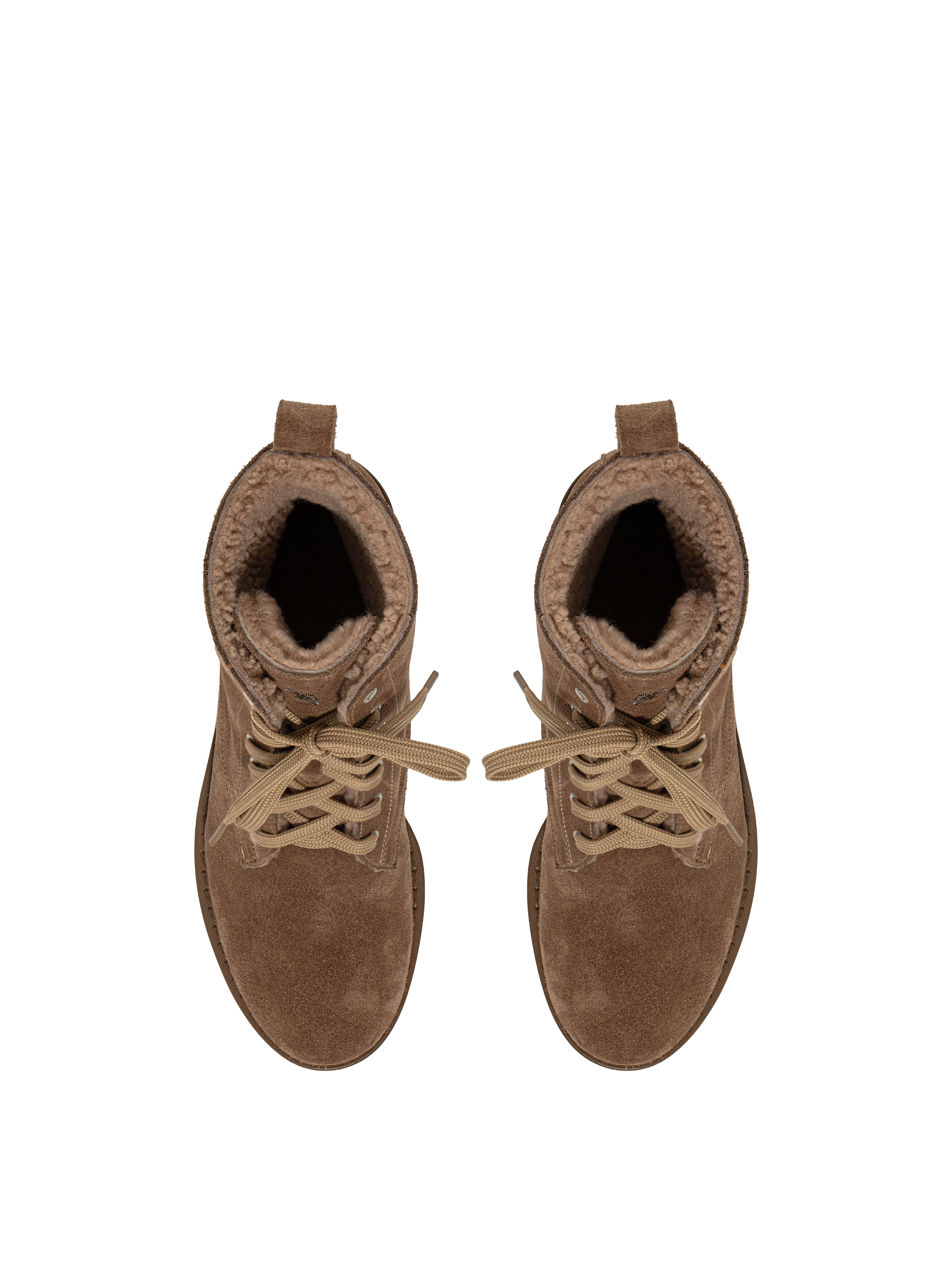 High light brown boots with a round toe are crafted from soft velour. The model is insulated with matching fur that maintains an optimal body temperature. The thick sole is made of pressed leather and protected with a rubber tread.