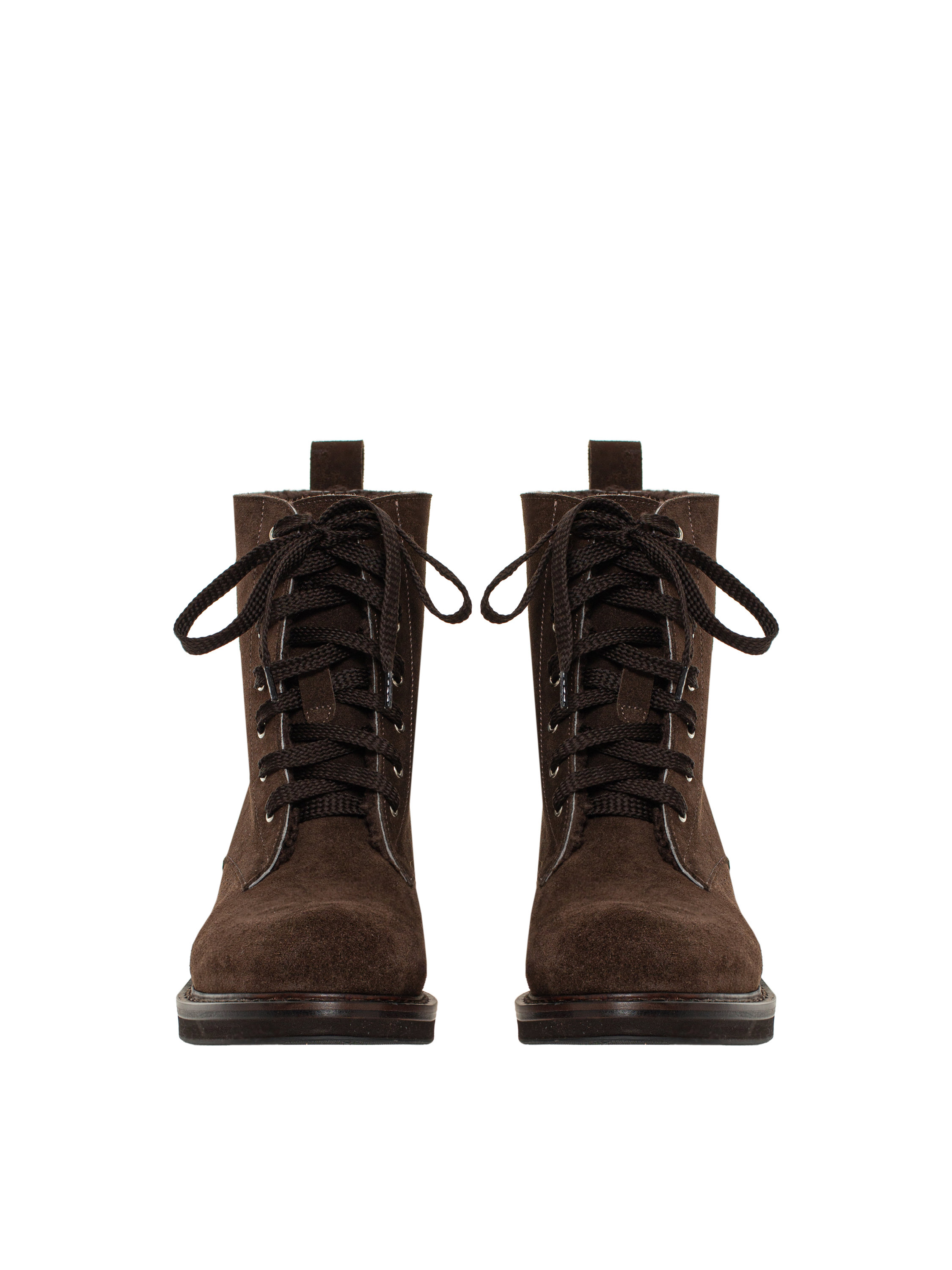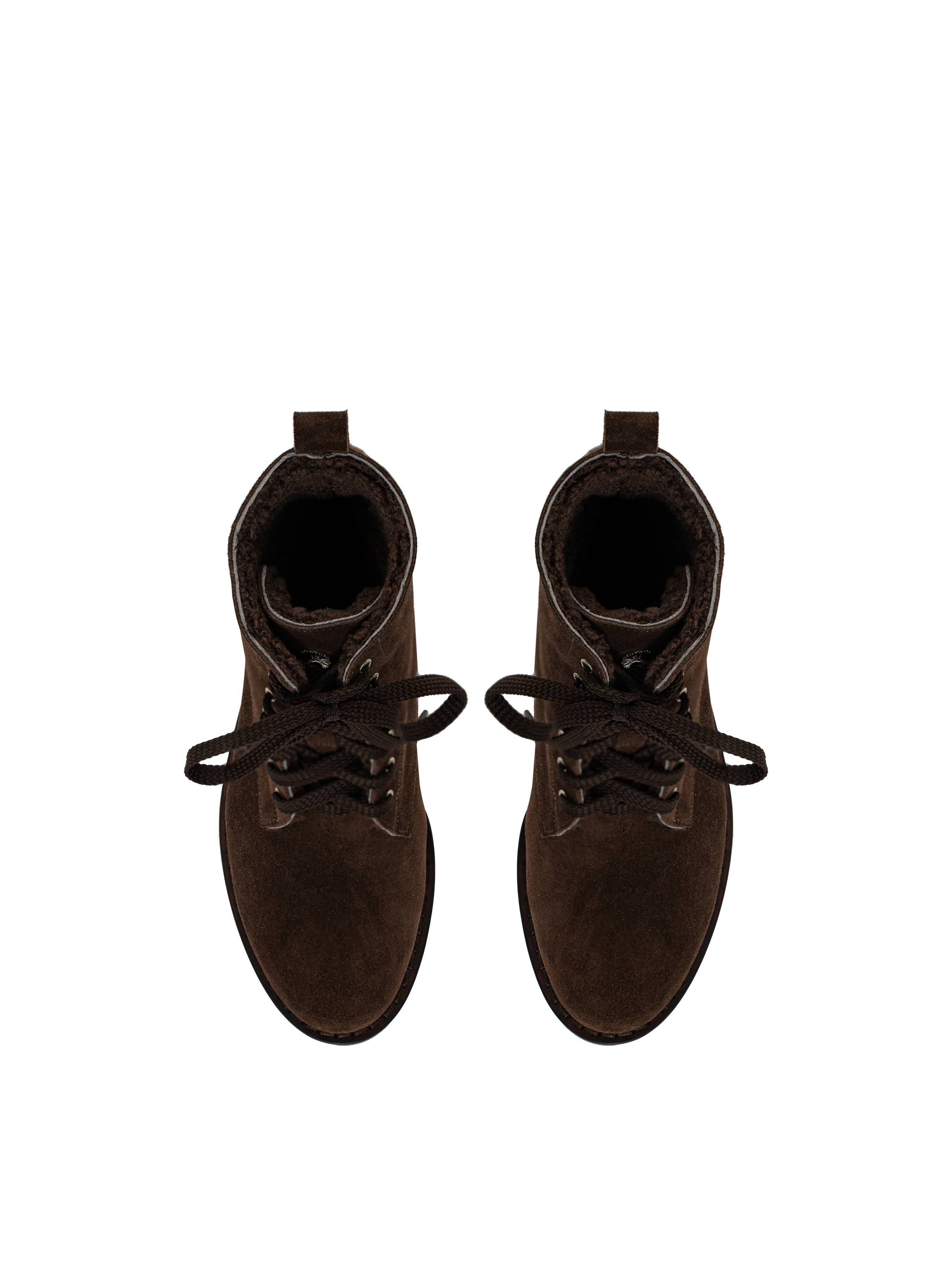 High brown boots with a round toe are crafted from soft velour. The model is insulated with matching fur that maintains an optimal body temperature. The thick sole is made of pressed leather and protected by a rubber tread.